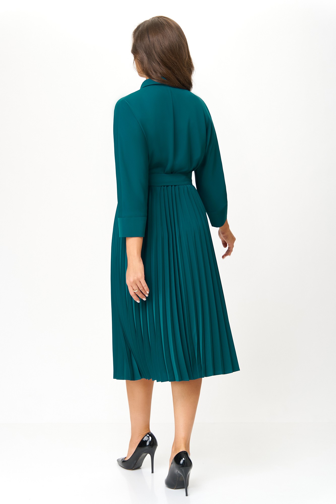 Платье с плиссировкой - это простой способ сделать любой образ особенным. Модель длины миди с цельнокроёными рукавами, заканчивающимися манжетами, со щелевидным вырезом со сборкой по горловине переда, отложным воротником с застёжкой на навесную петлю и ювелирную пуговицу. Платье выполнено из мягкой, приятной, немнущейся ткани. Талия акцентирована скрытой резинкой и красиво подчёркнута поясом с пряжкой в тон.