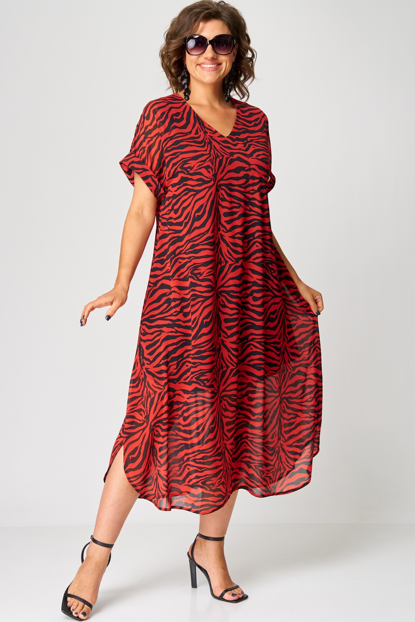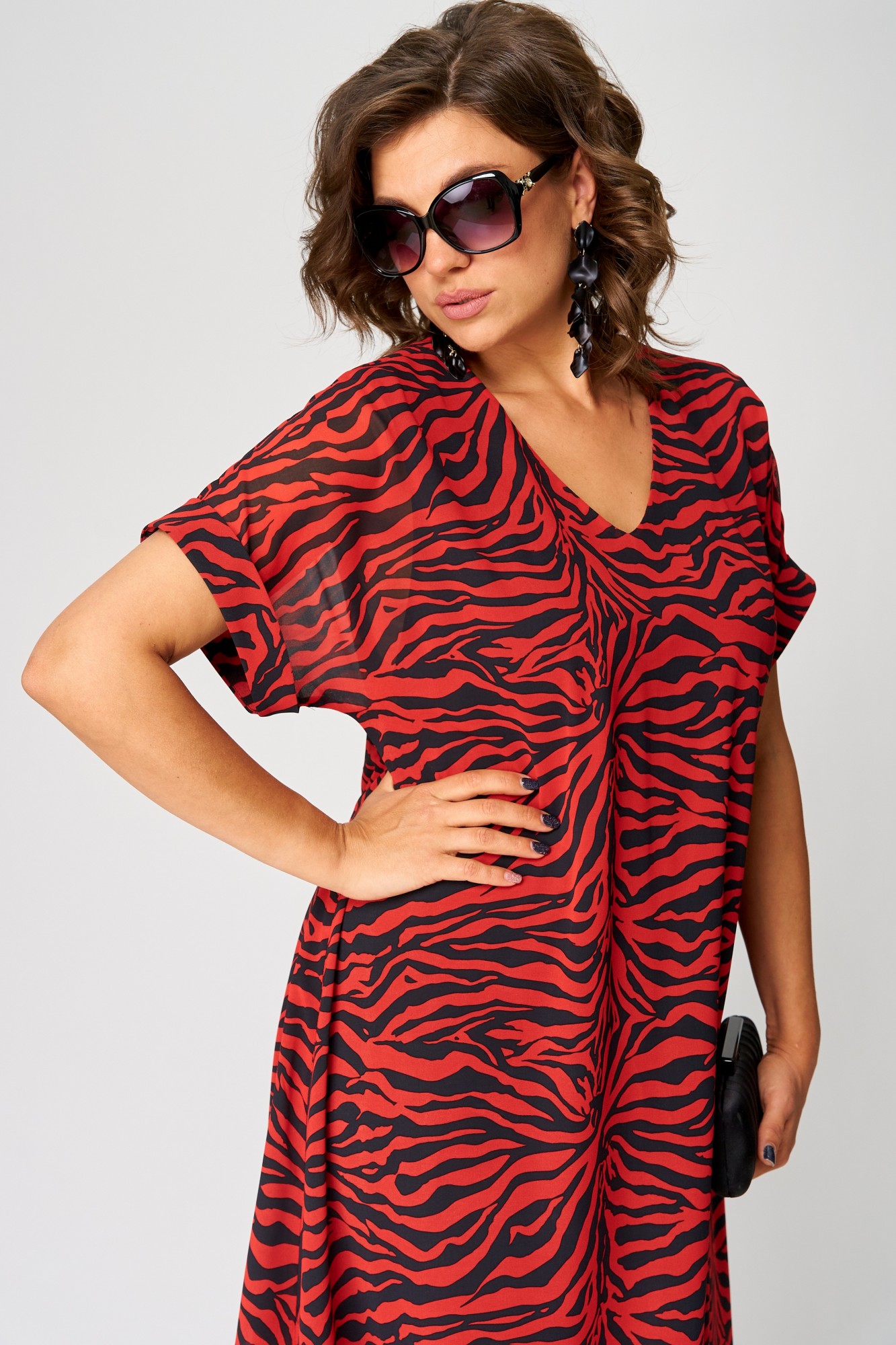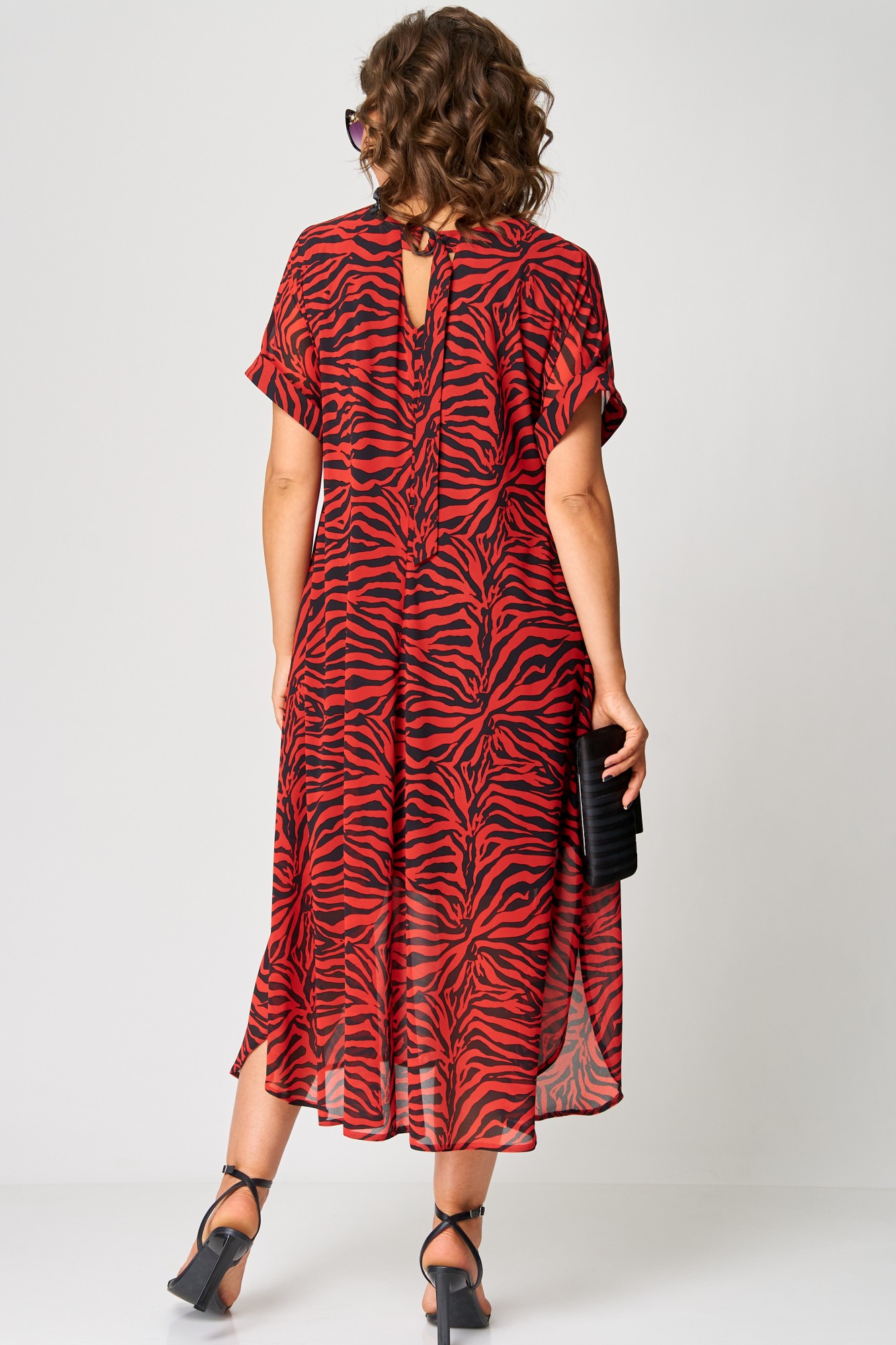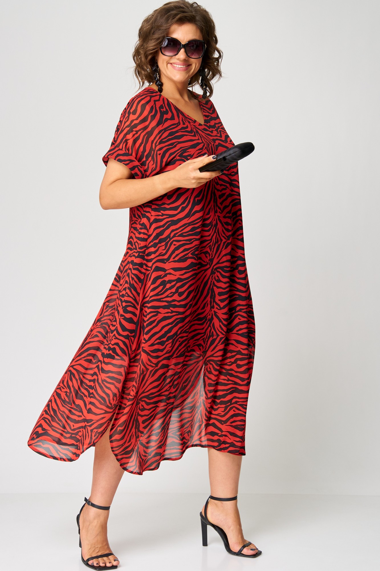 Платье женское нарядно-повседневное полуприлегающего силуэта расширенное к низу на подкладке. Выполнено из шифона. Подкладка трикотажная. Вырез горловины V-образный на обтачке, рукав спущенный по низу на притачной манжете. Низ фигурный. В боковых швах обработаны разрезы. Горловина спинки с фигурным вырезом и пряжкой. декором платья служит дизайн самой ткани.