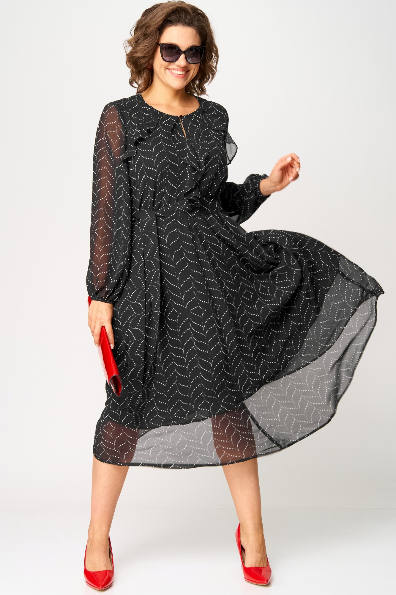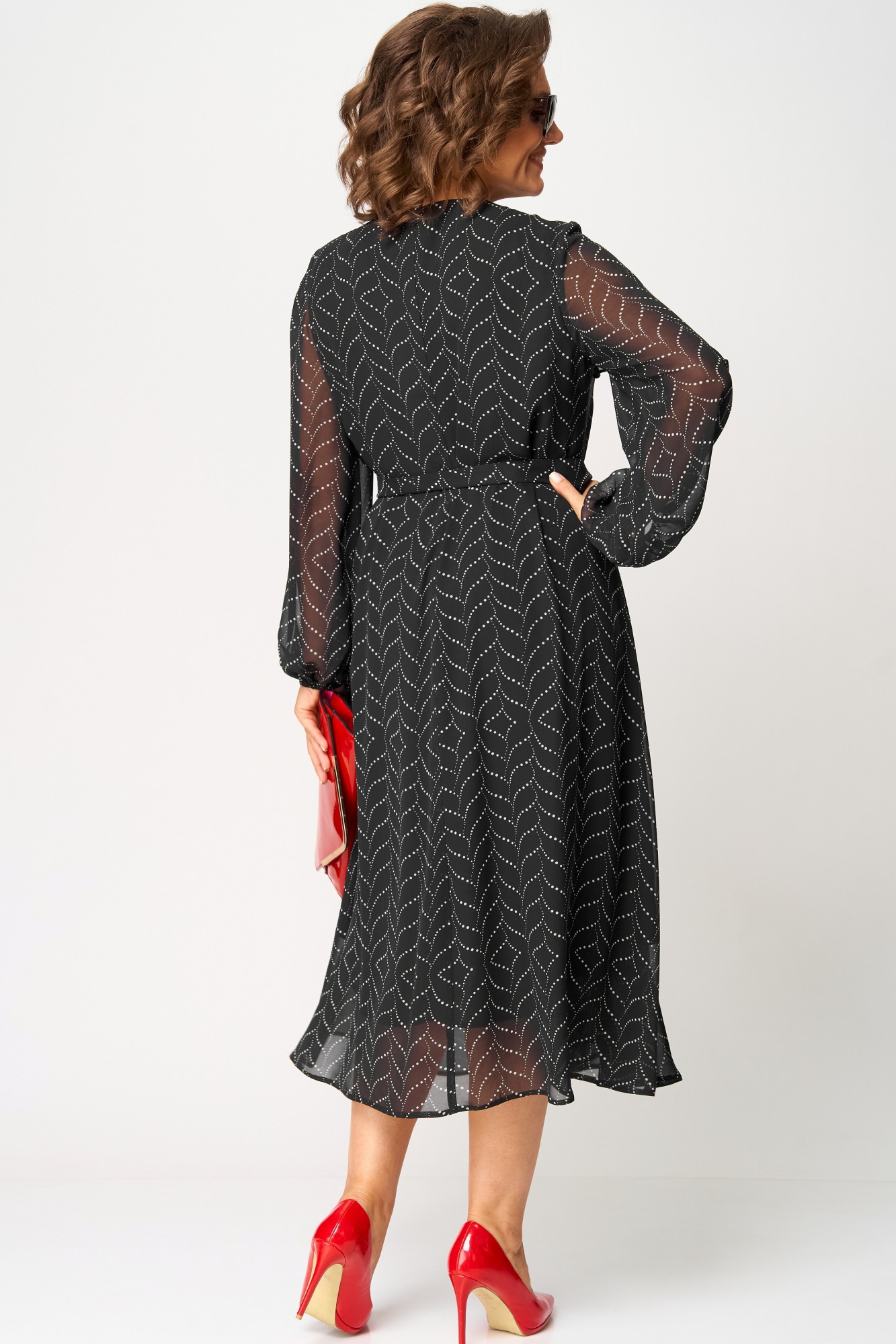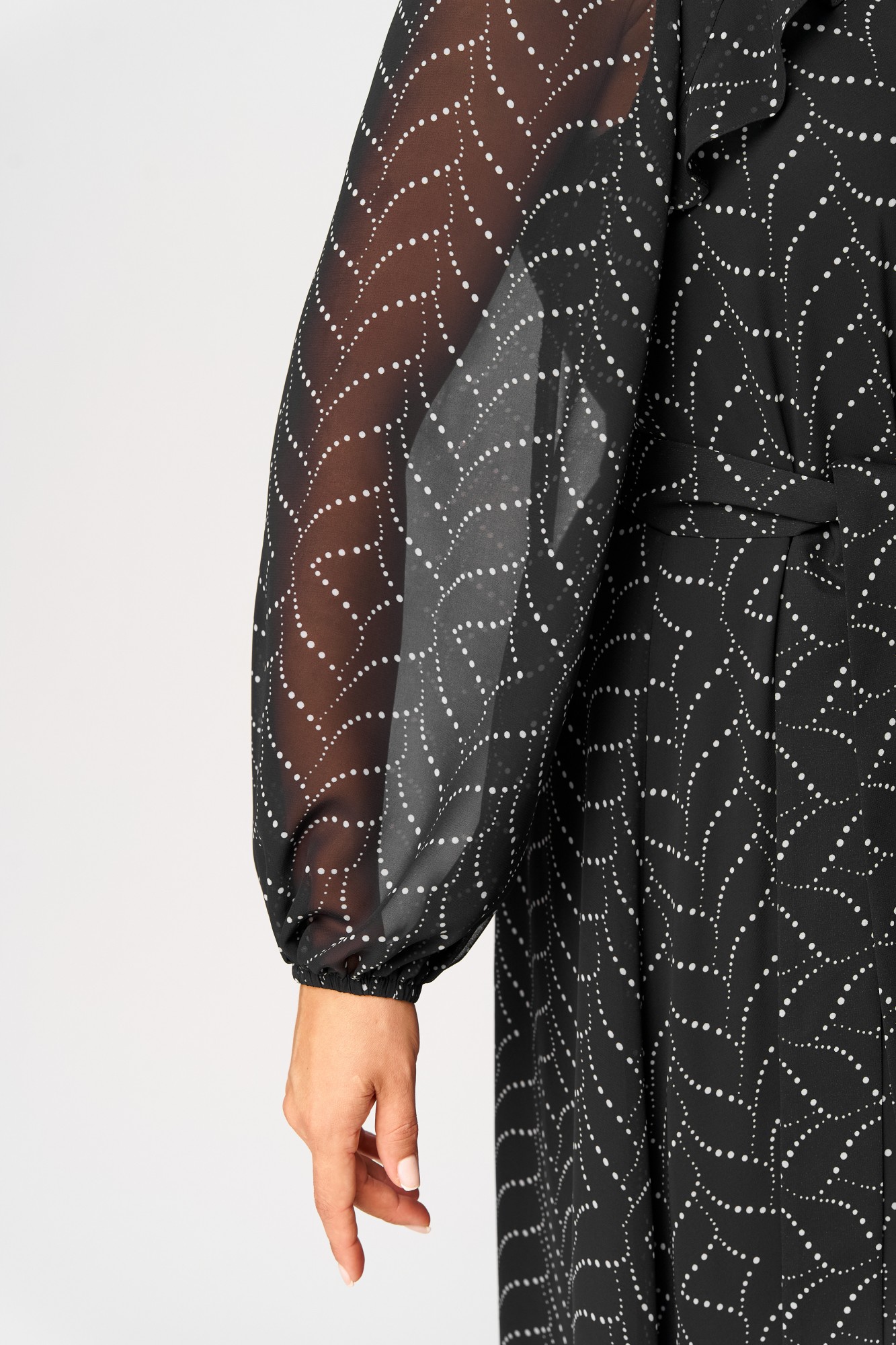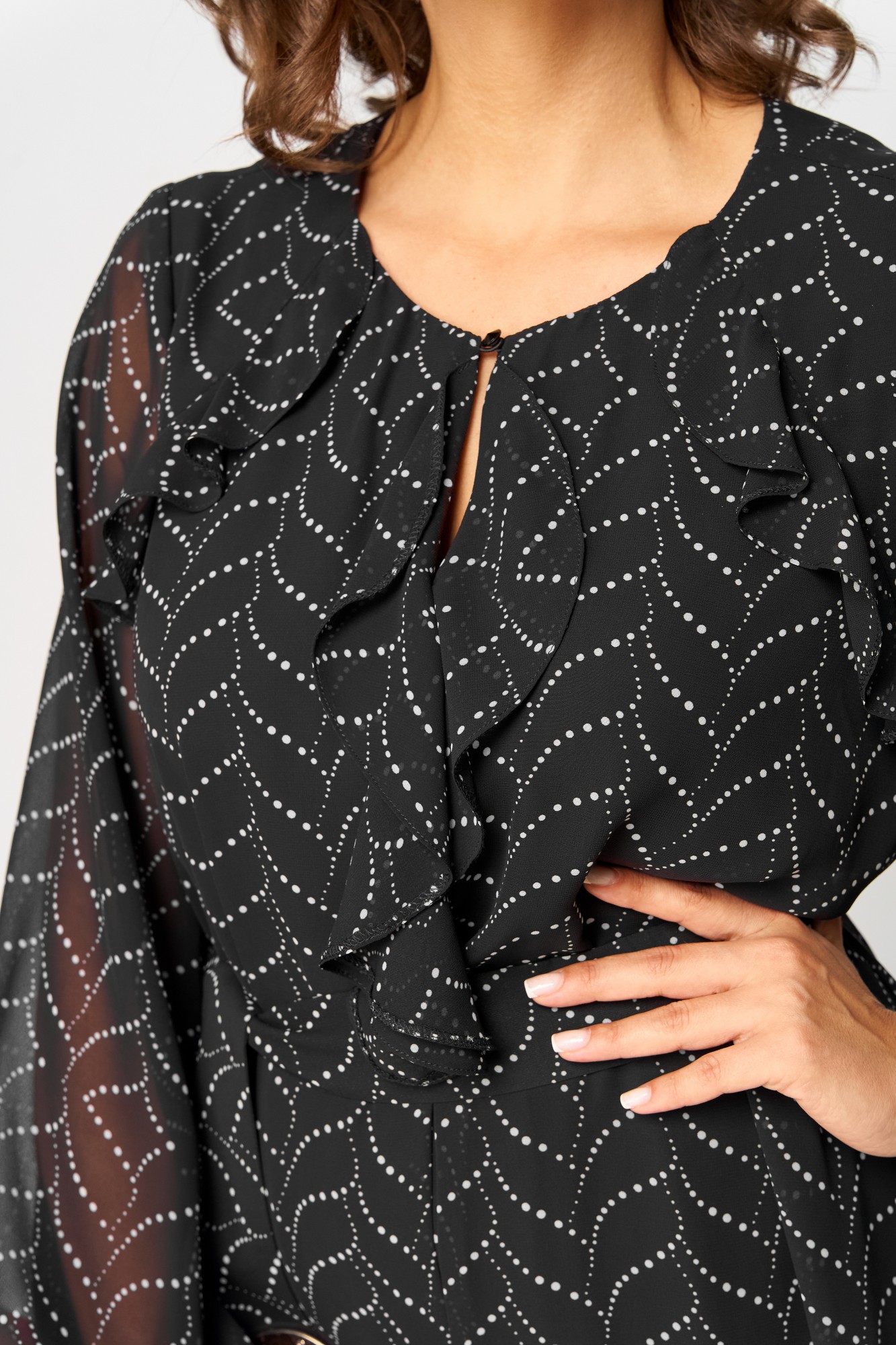 Платье женское нарядно-повседневное на трикотажной подкладке полуприлегающего силуэта расширенное к низу. Выполнено из шифона с принтом. Вырез горловины круглый на обтачке по центру на застежке на навесную петлю и пуговицу. Рукав втачной по низу собран на резинку. Декором служат рюши по лифу из основной ткани и съемный пояс. Платье можно носить с поясом и без него.