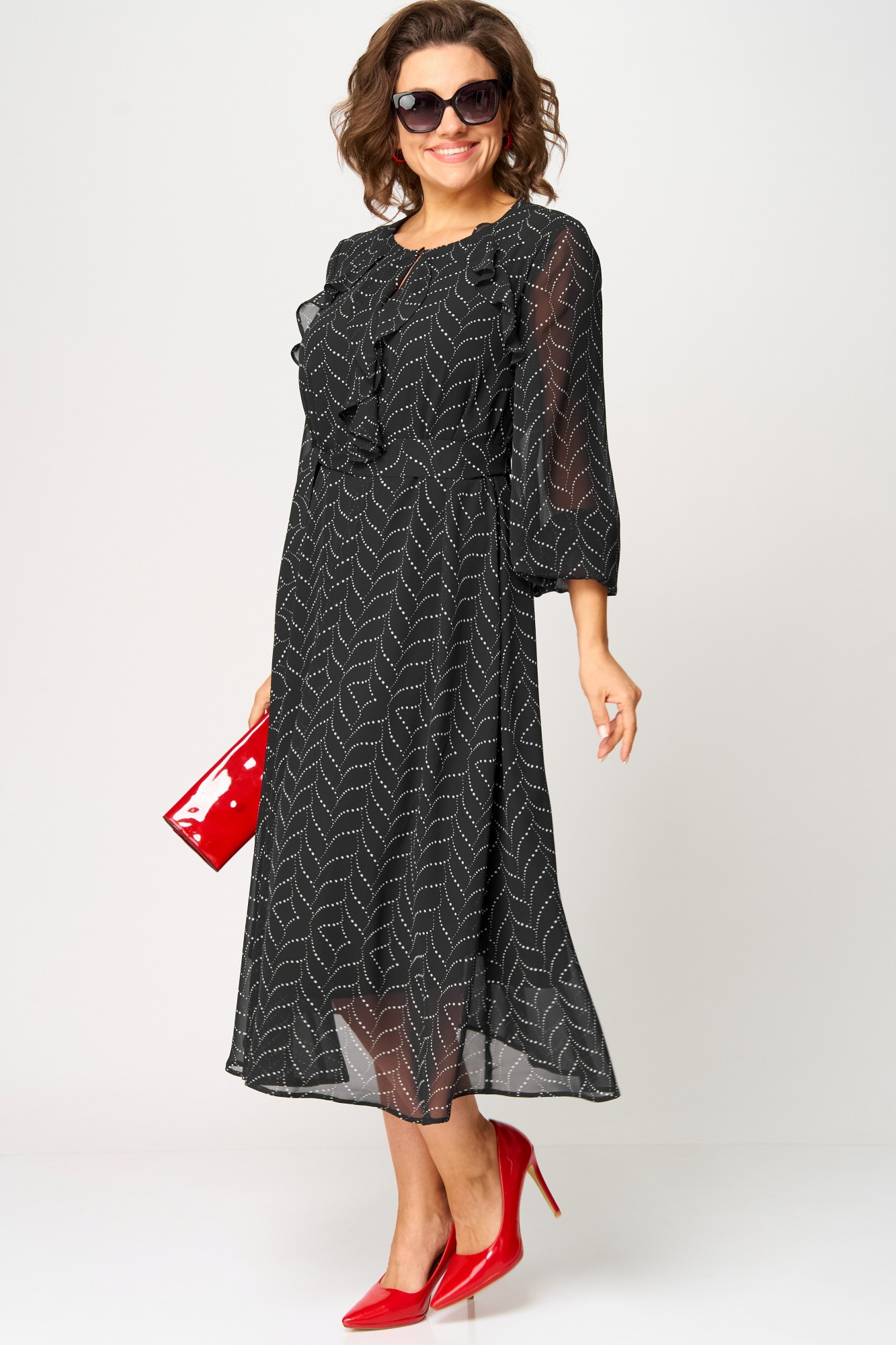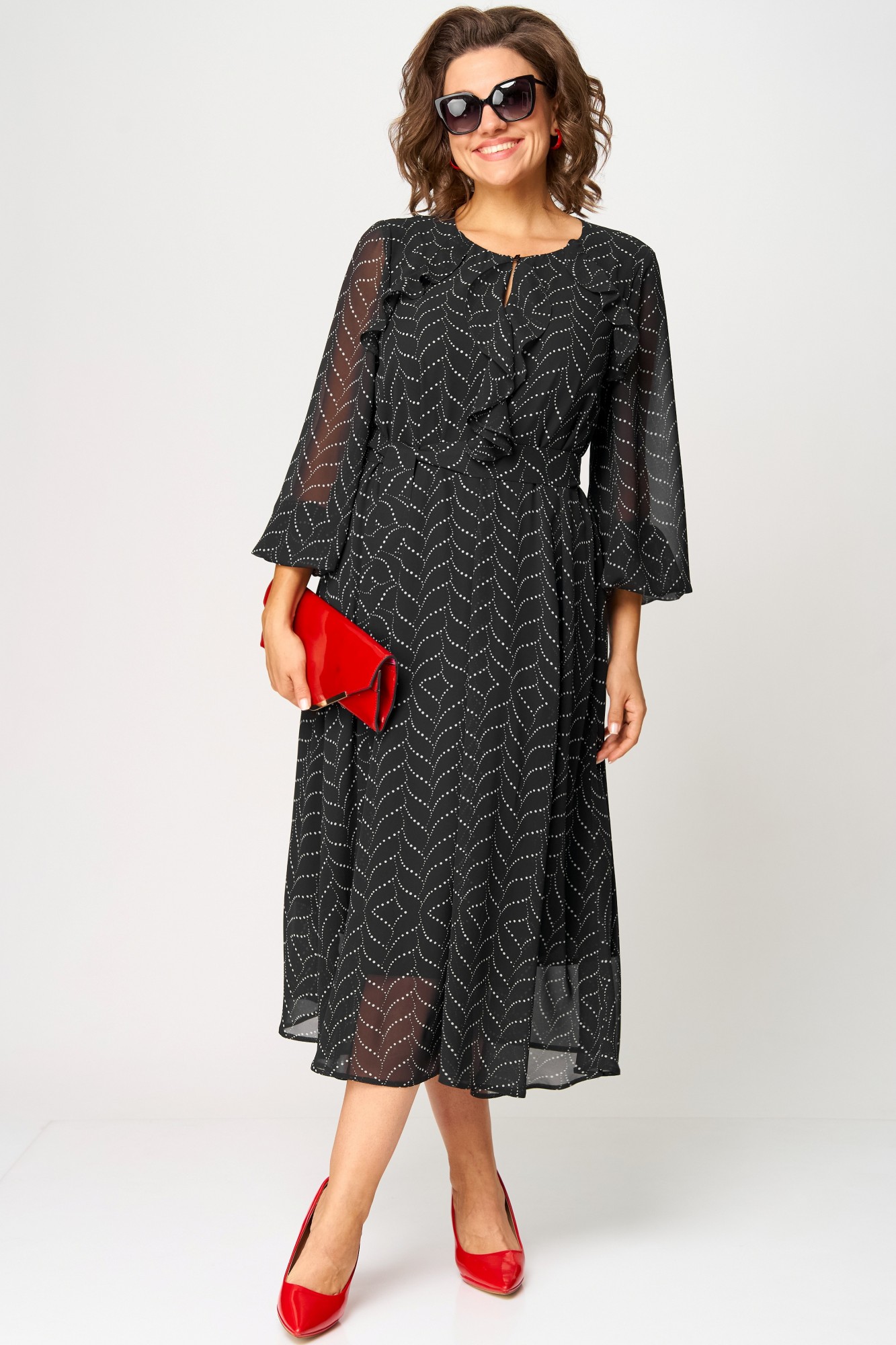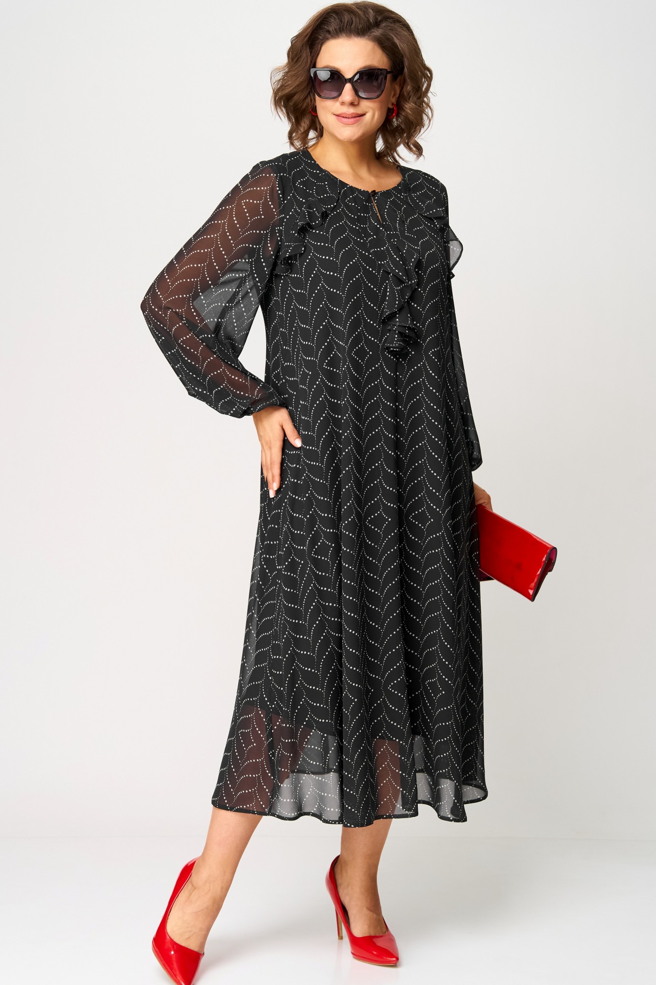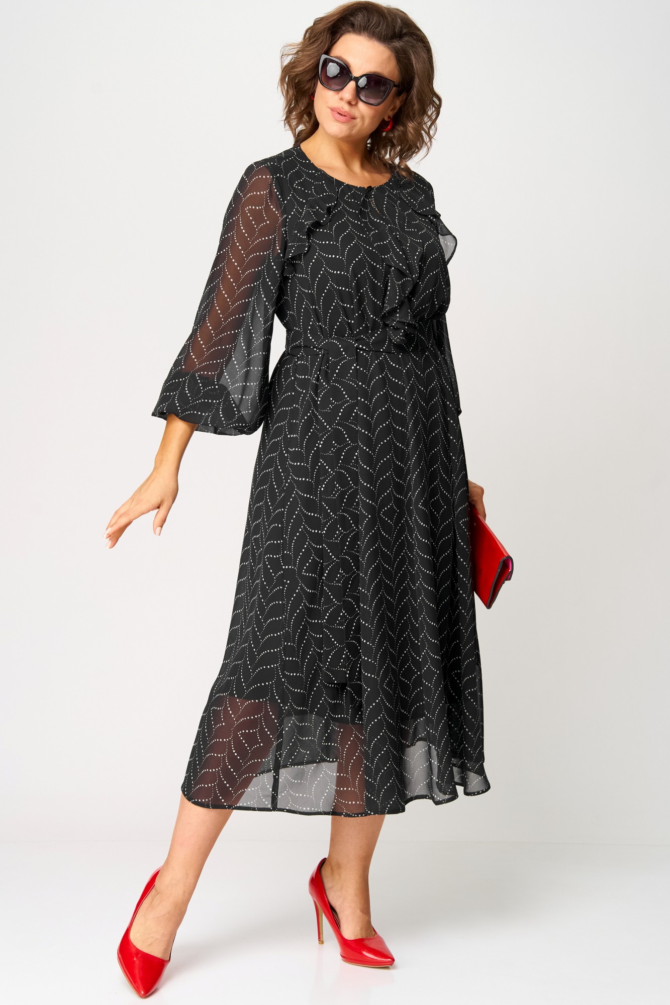 Платье женское нарядно-повседневное на трикотажной подкладке полуприлегающего силуэта расширенное к низу. Выполнено из шифона с принтом. Вырез горловины круглый на обтачке по центру на застежке на навесную петлю и пуговицу. Рукав втачной по низу собран на резинку. Декором служат рюши по лифу из основной ткани и съемный пояс. Платье можно носить с поясом и без него.