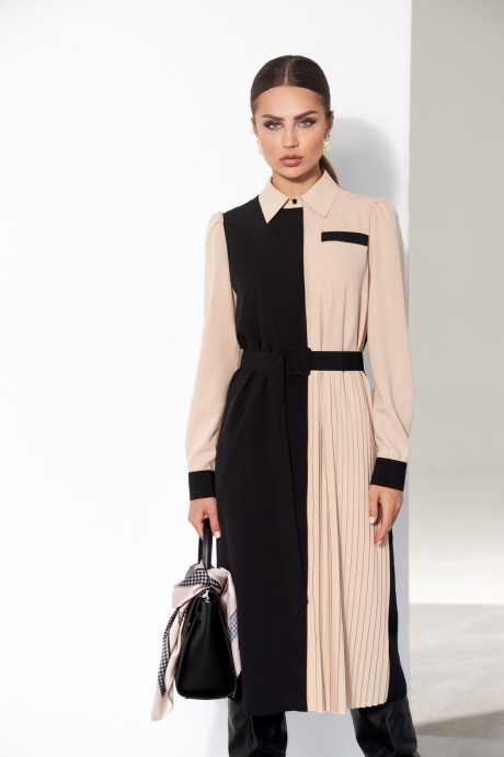 Платье прямого силуэта с потайной застежкой на 10 петель пуговиц с воротником рубашечного типа с отрезной стойкой с застежкой на одну петлю и пуговицу. Выполнена из двух однотонных тканей. Перед с нагрудными вытачками и ассиметрией в крое. Правая часть с членением в области талии, нижняя часть юбки выполнена из плиссе, с листочкой с настрочными концами в области груди. Рукав втачной со сборкой по окату. По низу ракава манжета с застежкой на 2 петли и пуговицы. К изделию прилагается пояс с обтяжной пряжкой. В боковых швах шлевки. Левая часть плятья, спинка, листочка, манжеты рукава, пояс с пряжкой выполнены из плотной одностонной ткани компаньона. Платье на подкладке.