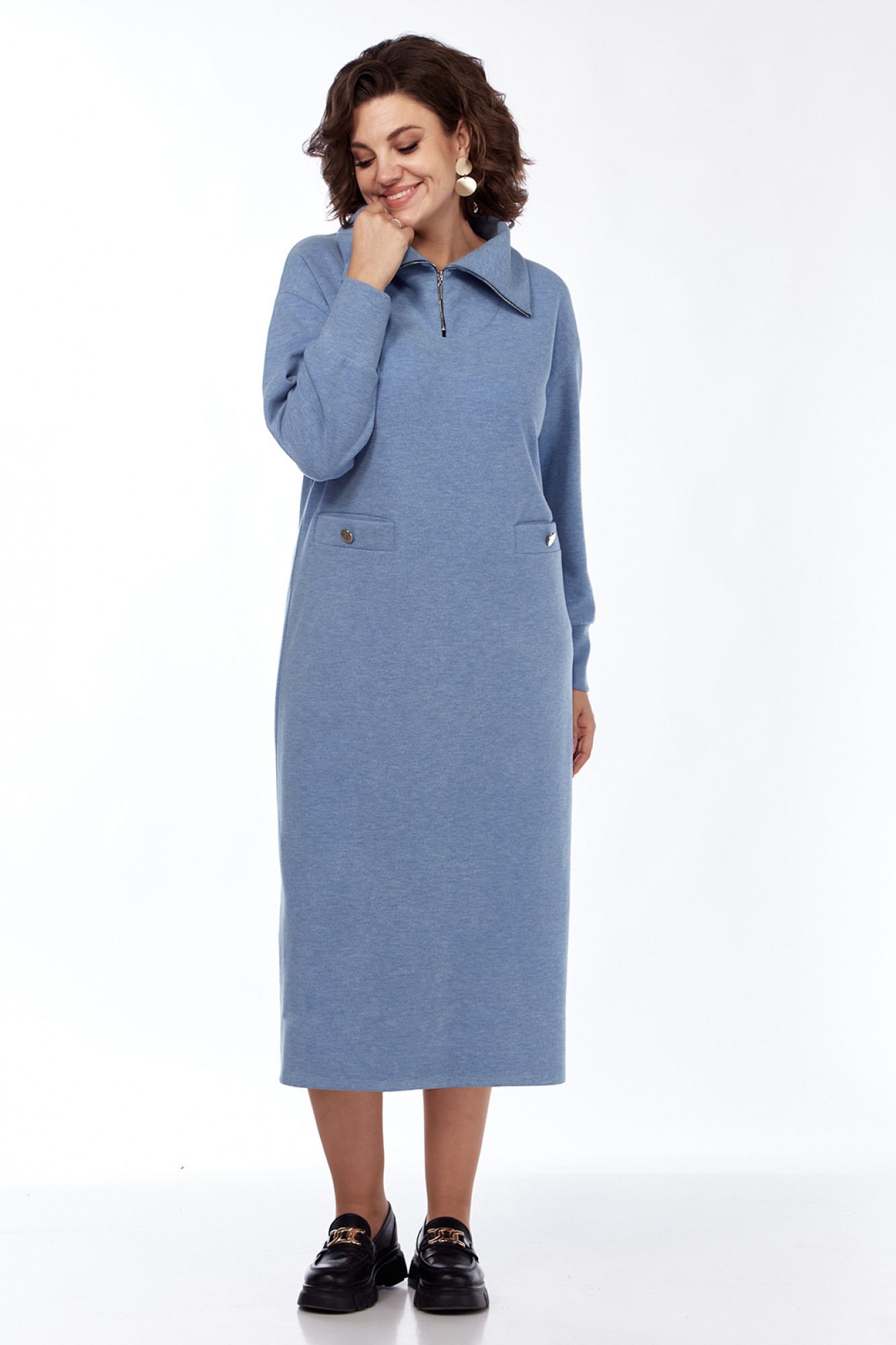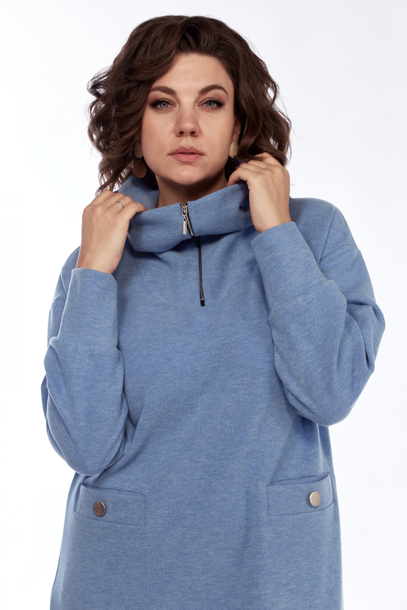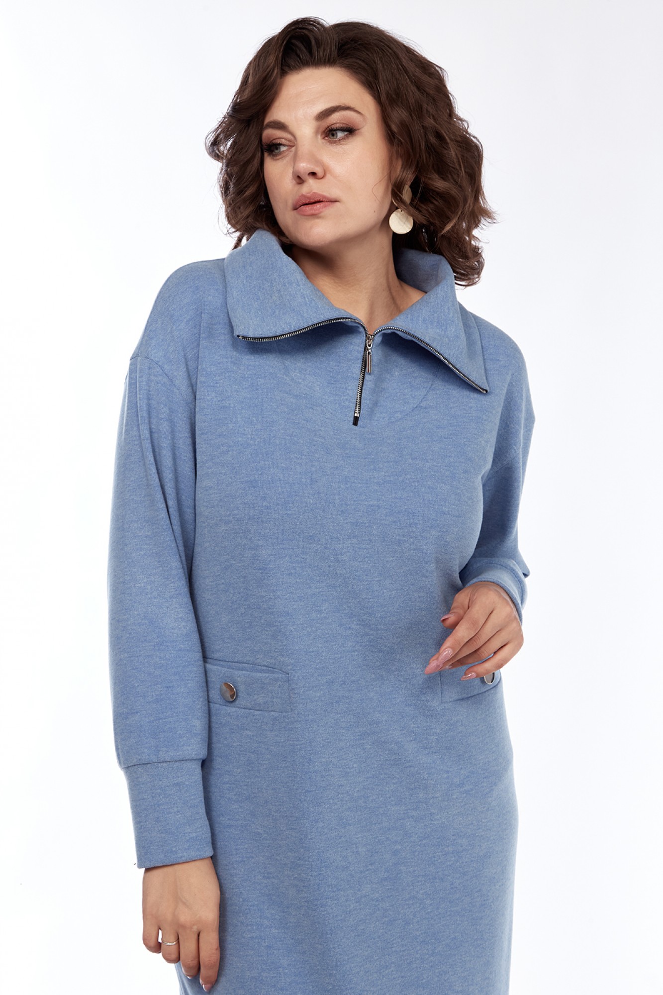 Платье женское повседневное выполнено из трикотажного полотна. Платье свободного силуэта с высоким воротником стойка на молнии и фигурным подрезом в области горловины. Карманы прорезные с листочкой, дополнены пуговицами. Рукава спущенные на притачном манжете. Спинка со средним швом и шлицей.