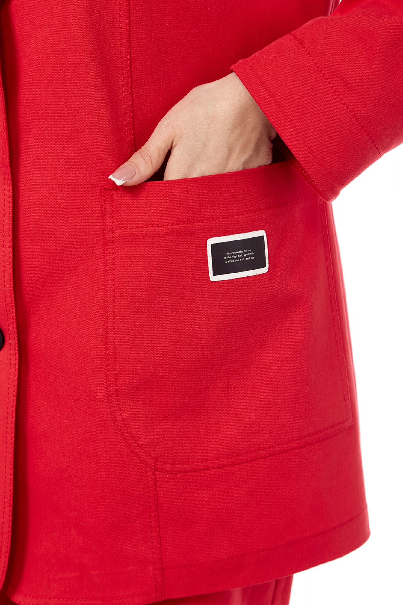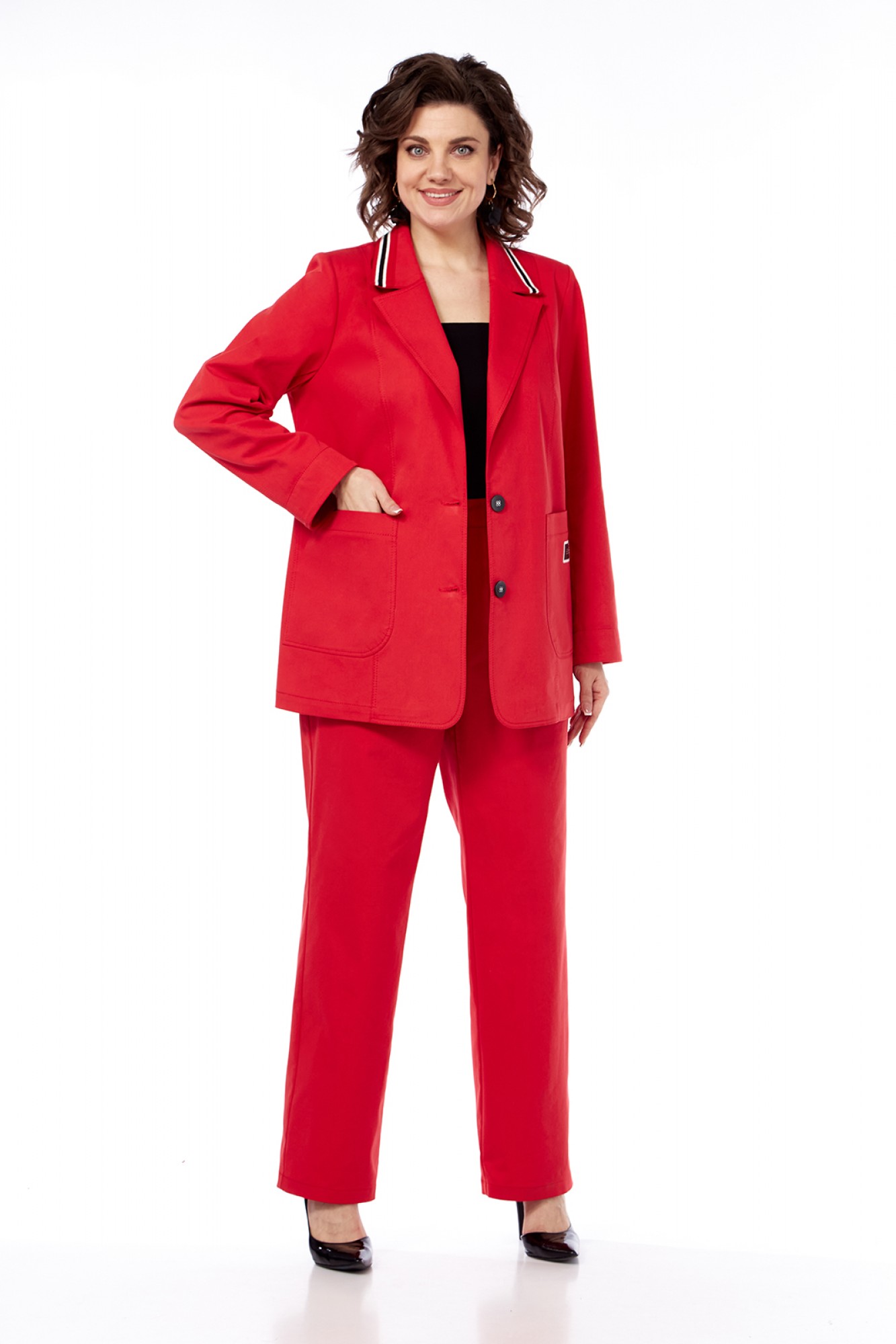 Костюм брючный 2х — предметный, состоит из жакета и брюк, из костюмной ткани. Жакет прямого силуэта с воротником пиджачного типа, застежка однобортная на две петли с пуговицами. По переду обработаны рельефы и накладные карманы. Спинка со средним швом, в котором обработана шлица. Рукава втачные, двухшовные, дополнены отложной манжетой из отделочной ткани. Брюки средней посадки, прямые от бедра. Пояс притачной с застежкой на петлю и пуговицу. По передним деталям брюк обработаны карманы, которые дополнены декоративными элементами. Задние детали брюк на кокетке, имеются фигурные накладные карманы. Костюм по швам декорирован отделочными строчками.