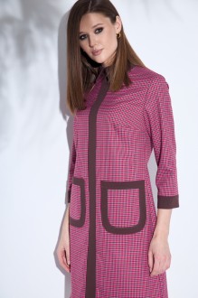 По переду – нагрудные вытачки, по центру- планка из отделочной ткани, шириной 4 см. По переду платья – накладные функциональные карманы с планками из отделочной ткани. По спинке – талевые вытачки, в среднем шве – потайная застёжка – молния. Горловина платья с притачной стойкой и воротником рубашечного типа из отделочной ткани. Рукав – втачной, 2-шовный, с притачной манжетой из отделочной ткани, высотой 4.5 см. Низ платья обработан притачной планкой, высотой 3 см, из отделочной ткани.