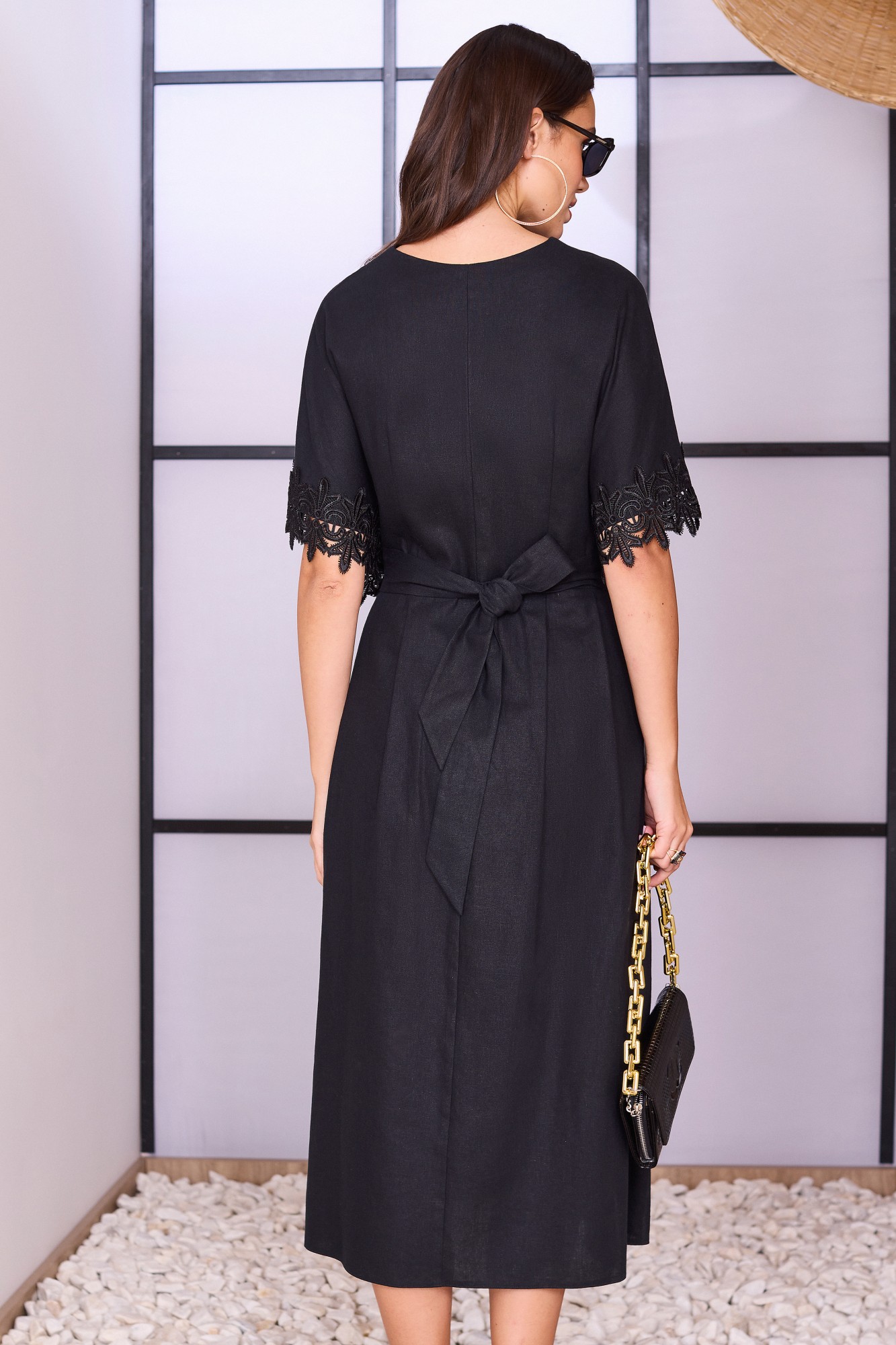 Льняное платье «Boho» миди с вышивкой и кружевом. Платье на основе цельнокроеного покроя с втачным поясом, на лифе и юбке застрочены мягкие складки. Перед с V-образным вырезом и центральной застежкой на петли и пуговицы. Спинка со средним швом и талиевыми вытачками, в боковые швы вставлены завязки пояса. Рукав цельнокроеный с настроченным кружевом. Юбка на х/б подкладке.