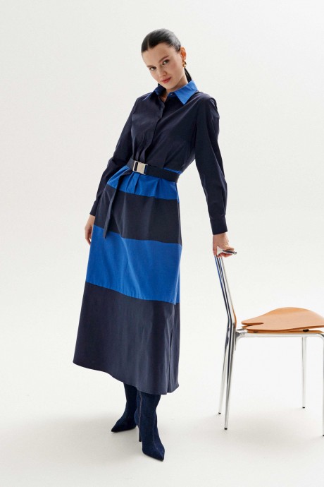 Платье полуприлегающего силуэта выполнено из хлопка в двух цветах: синий и голубой. Рукав втачной, по низу рукава манжета с застёжкой на петли/пуговицы. Воротник рубашечного кроя на стойке, застёжка по платью потайная на петли и пуговицы. По линии талии и юбке платья выполнены горизонтальные подрезы из отделочной ткани. В боковых швах карманы. По спинке: кокетка и две складки, в шов по талии вставлена резинка для удобства движения. К платью прилагается съёмный пояс с металлической пряжкой, с резинкой в области спинки для комфорта и удобства в носке.