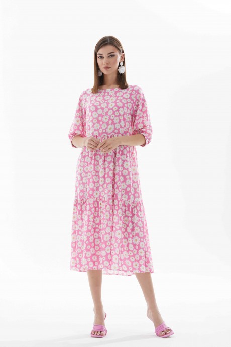 Платье свободного покроя, расширенное книзу из штапеля с цветочным принтом. Горловина округлая, на спинке завязки. Рукав втачной со сборкой по окату и резинкой по низу. Платье отрезное выше линии талии. По переду и спинке расположены горизонтальные подрезы и воланы со сборкой. Рост 164-170
