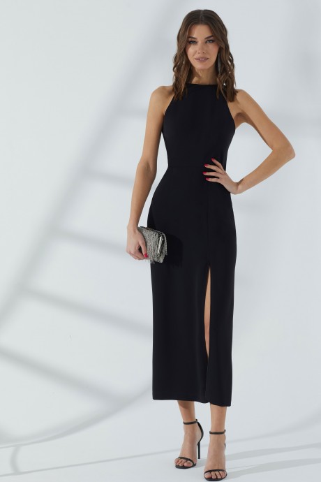 Нарядное платье полуприлегающего силуэта с американской проймой из струящейся ткани. Горловина округлая. На спинке потайная молния. Платье отрезное по линии талии, по переду разрез.