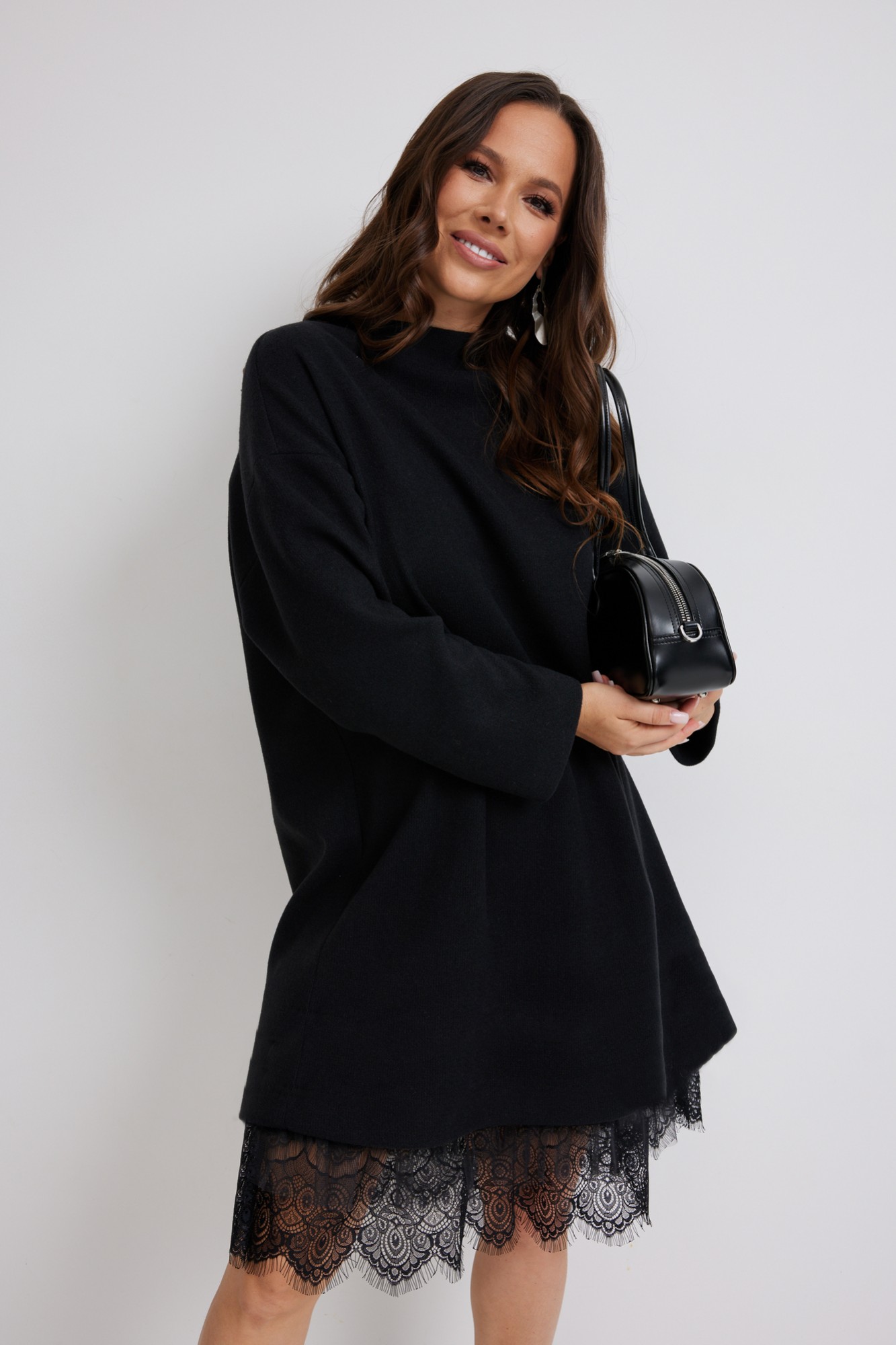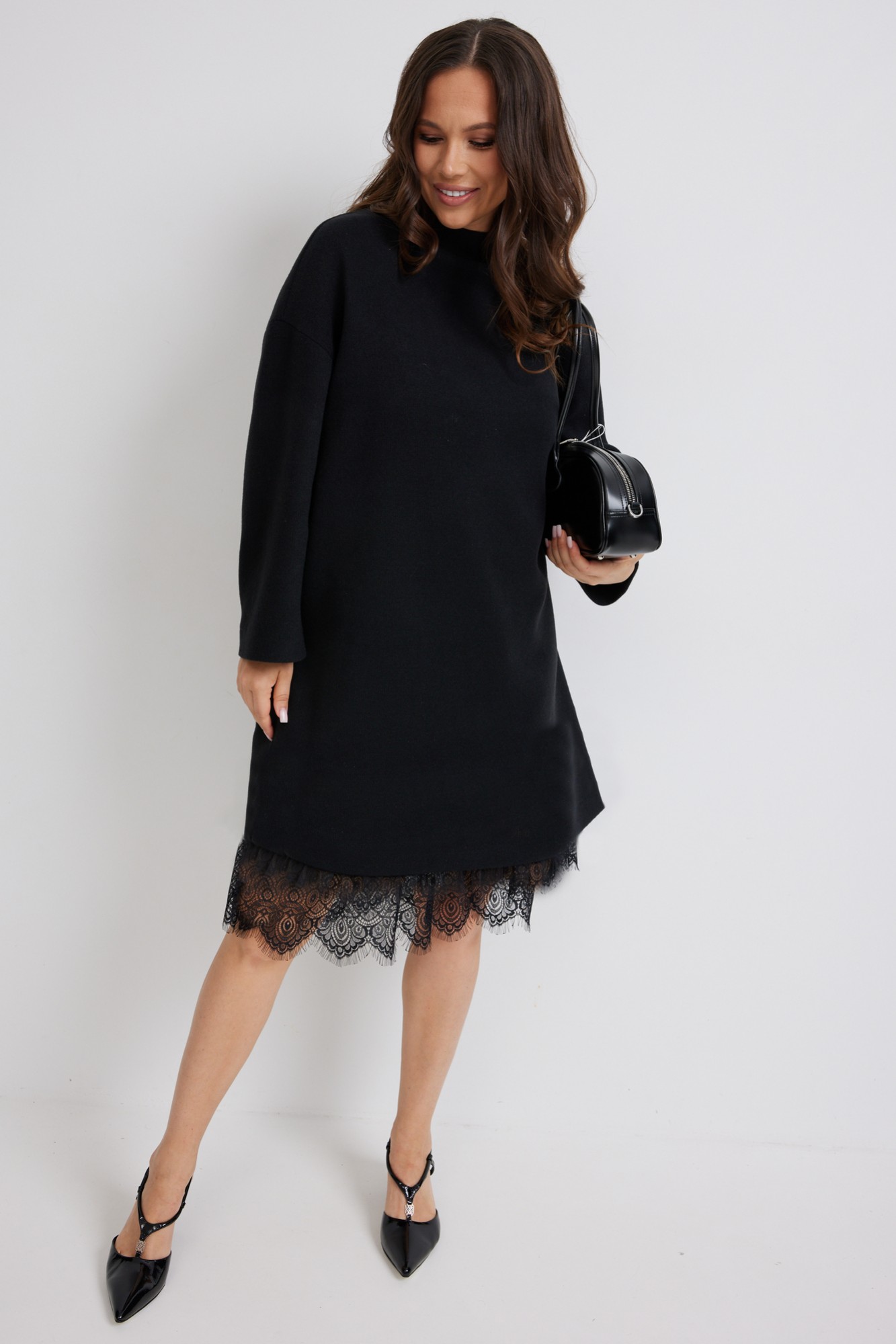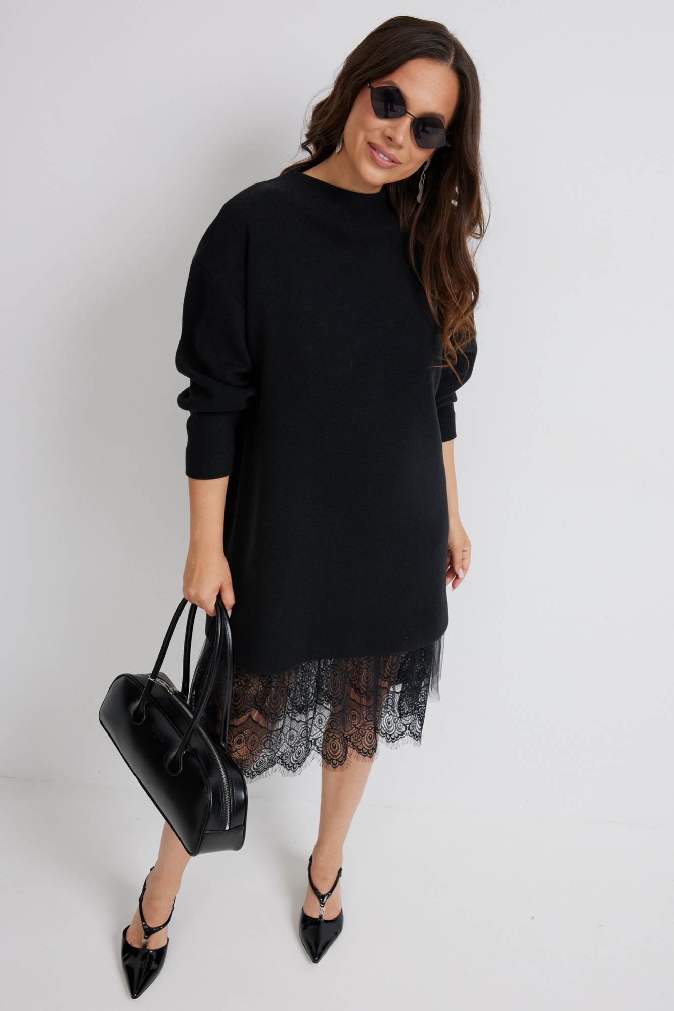 Стильный комплект из верхнего трикотажного платья и нижнего платья-комбинации. Верхнее платье свободного прямого кроя с длинным рукавом. Выполнено из приятного к телу трикотажного полотна средней плотности, который прекрасно держит форму. Нижнее платье-комбинация выполнено из нежного трикотажного полотна, дополненного красивым кружевом и фатином. Комбинация на тонких регулируемых бретелях.