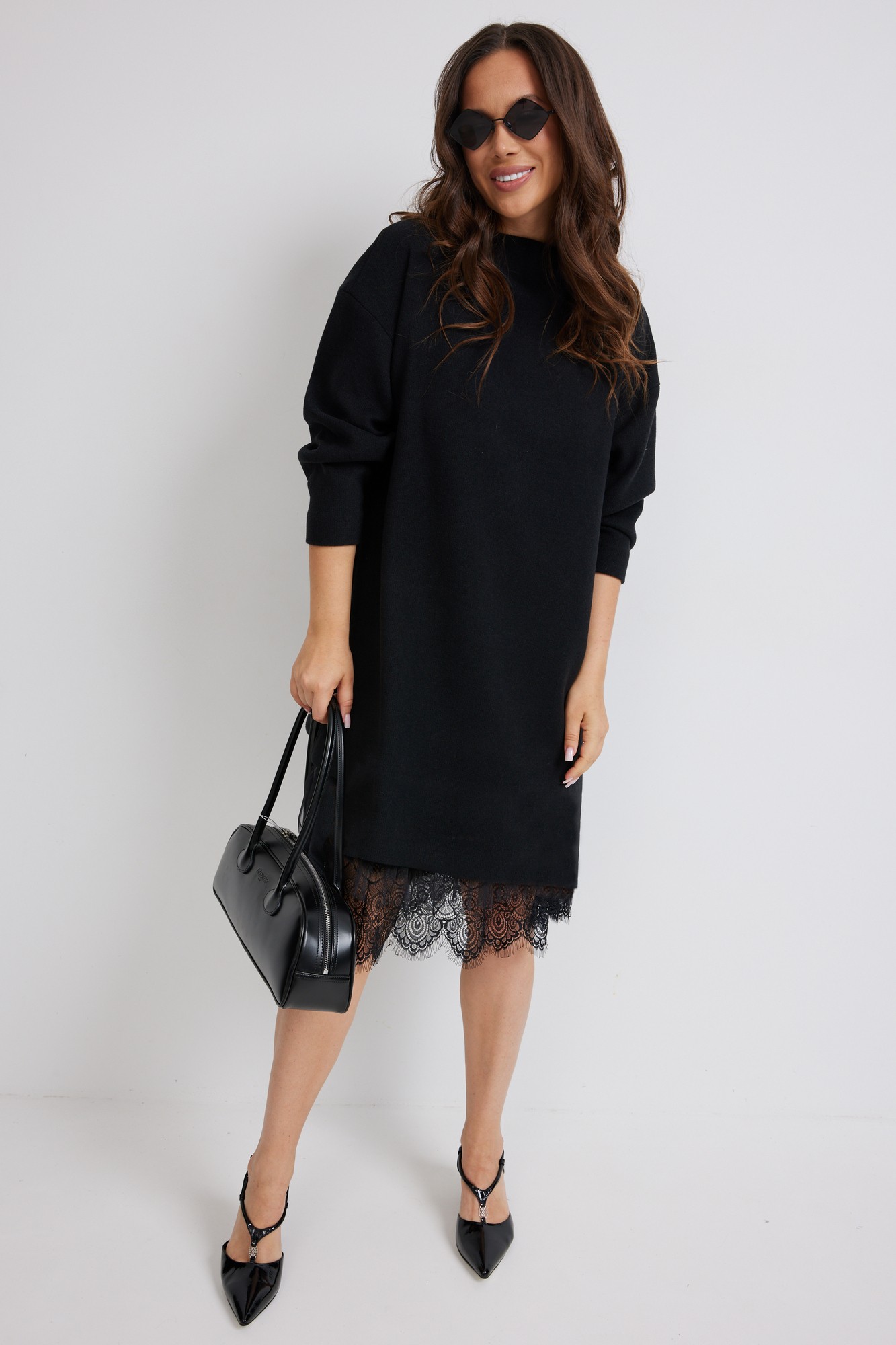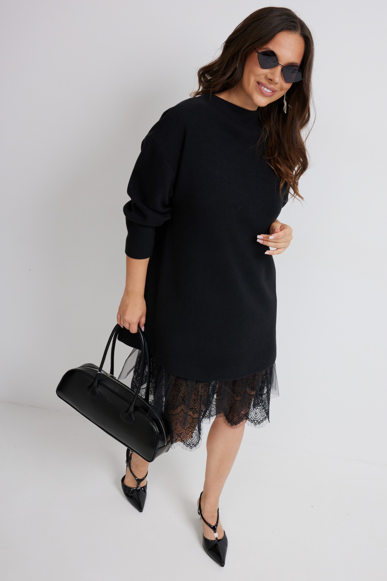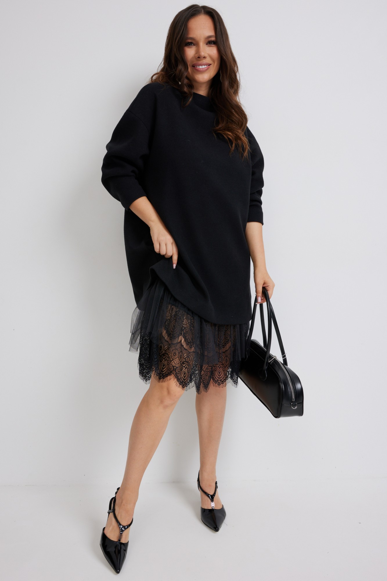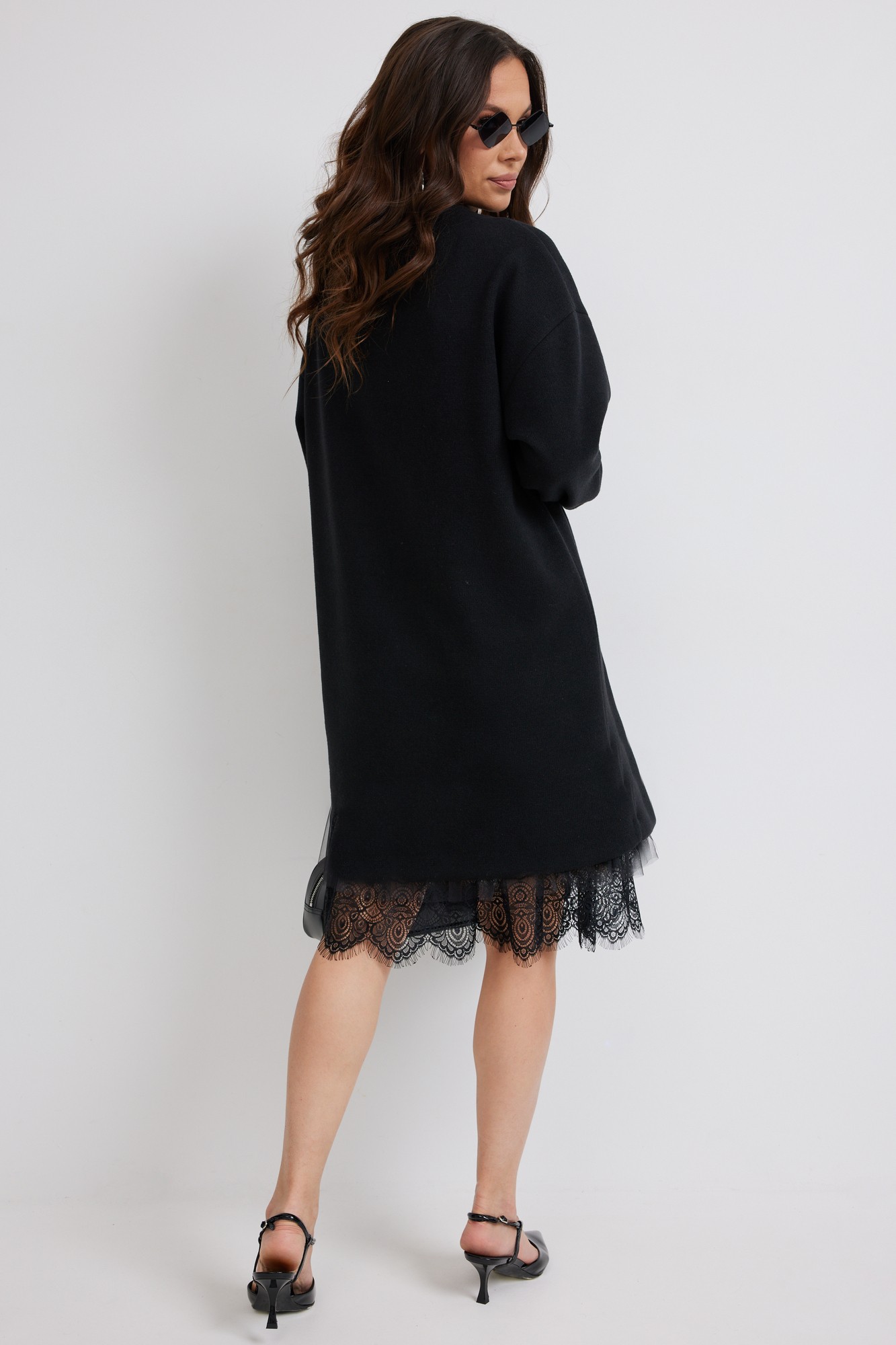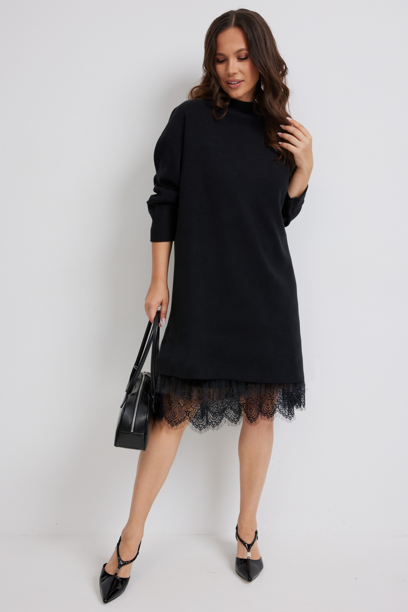 Стильный комплект из верхнего трикотажного платья и нижнего платья-комбинации. Верхнее платье свободного прямого кроя с длинным рукавом. Выполнено из приятного к телу трикотажного полотна средней плотности, который прекрасно держит форму. Нижнее платье-комбинация выполнено из нежного трикотажного полотна, дополненного красивым кружевом и фатином. Комбинация на тонких регулируемых бретелях.