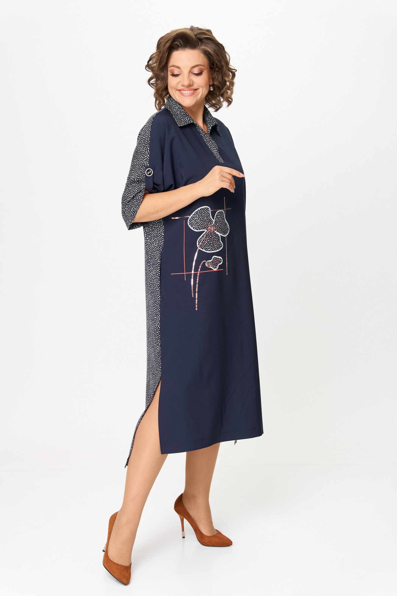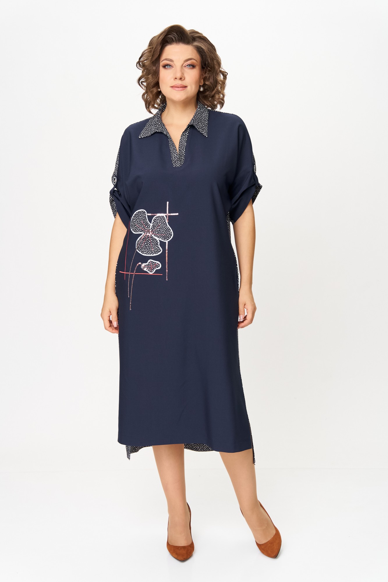 Плечо опущенное, рукав втачной длиной 3/4 застегивается на пату и пуговицу, что придает изделию особый шарм. На спинке расположена встречная складка, которая создает небольшой клеш и подчеркивает женственность и грациозность. Перед украшен изящной вышивкой из пайеток и ткани-компаньона, что делает платье ярким акцентом образа.