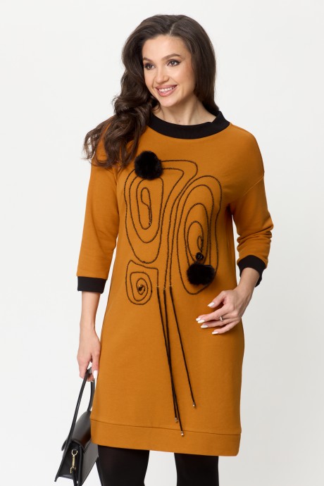 Женское трикотажное платье выполнено из футера 3-х нитка, для повседневной носки станет одним из базовых и любимых изделий в Вашем гардеробе. Платье прямого полуприлегающего силуэта, длиной до колена, однотонное с контрастными манжетами из довяза и планкой горловины. Вырез горловины круглый, рукав втачной длиной 3/4. Украшением платья служит контрастная вышивка из шнура и пристегивающиеся меховые пушки.
