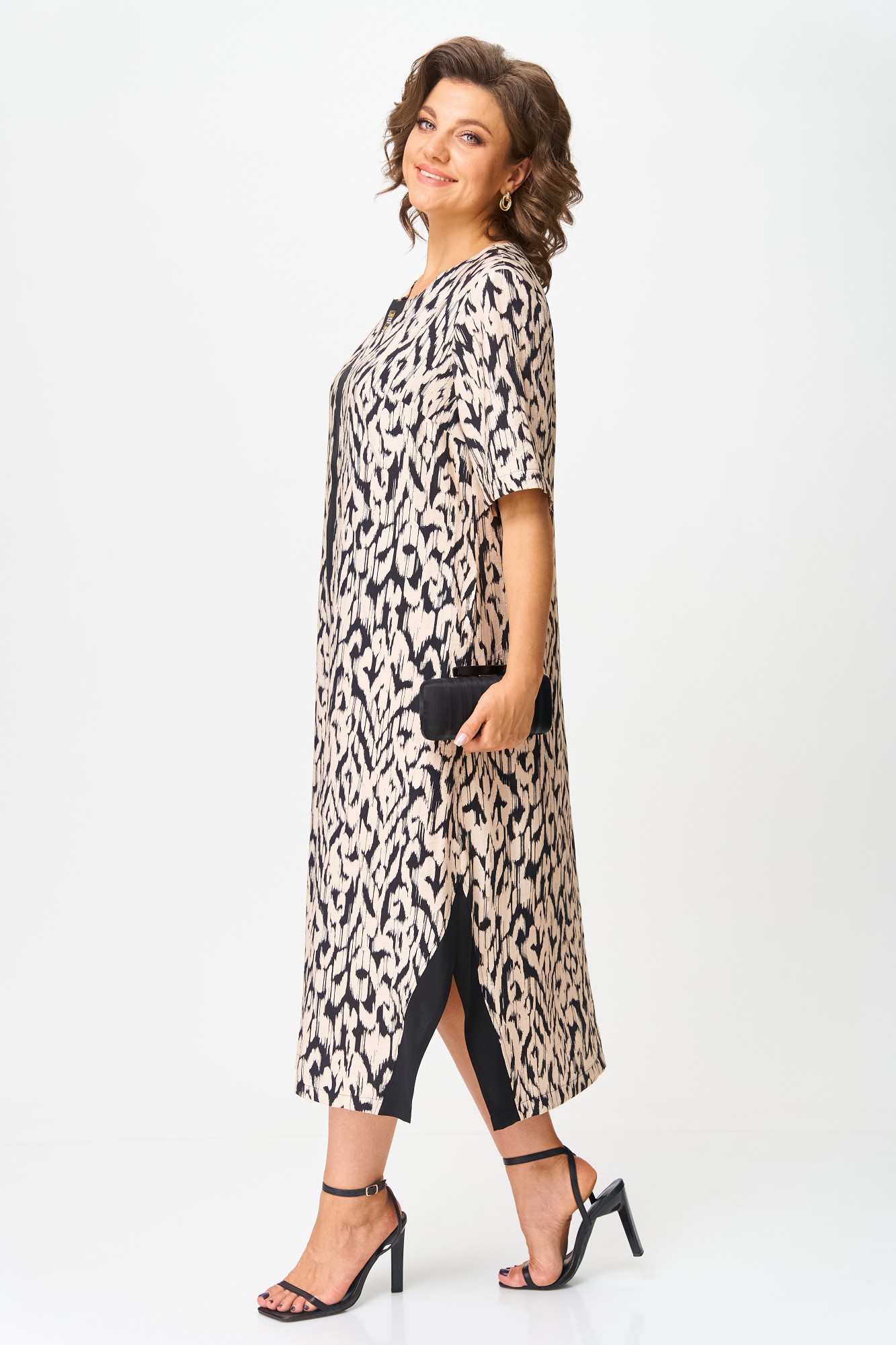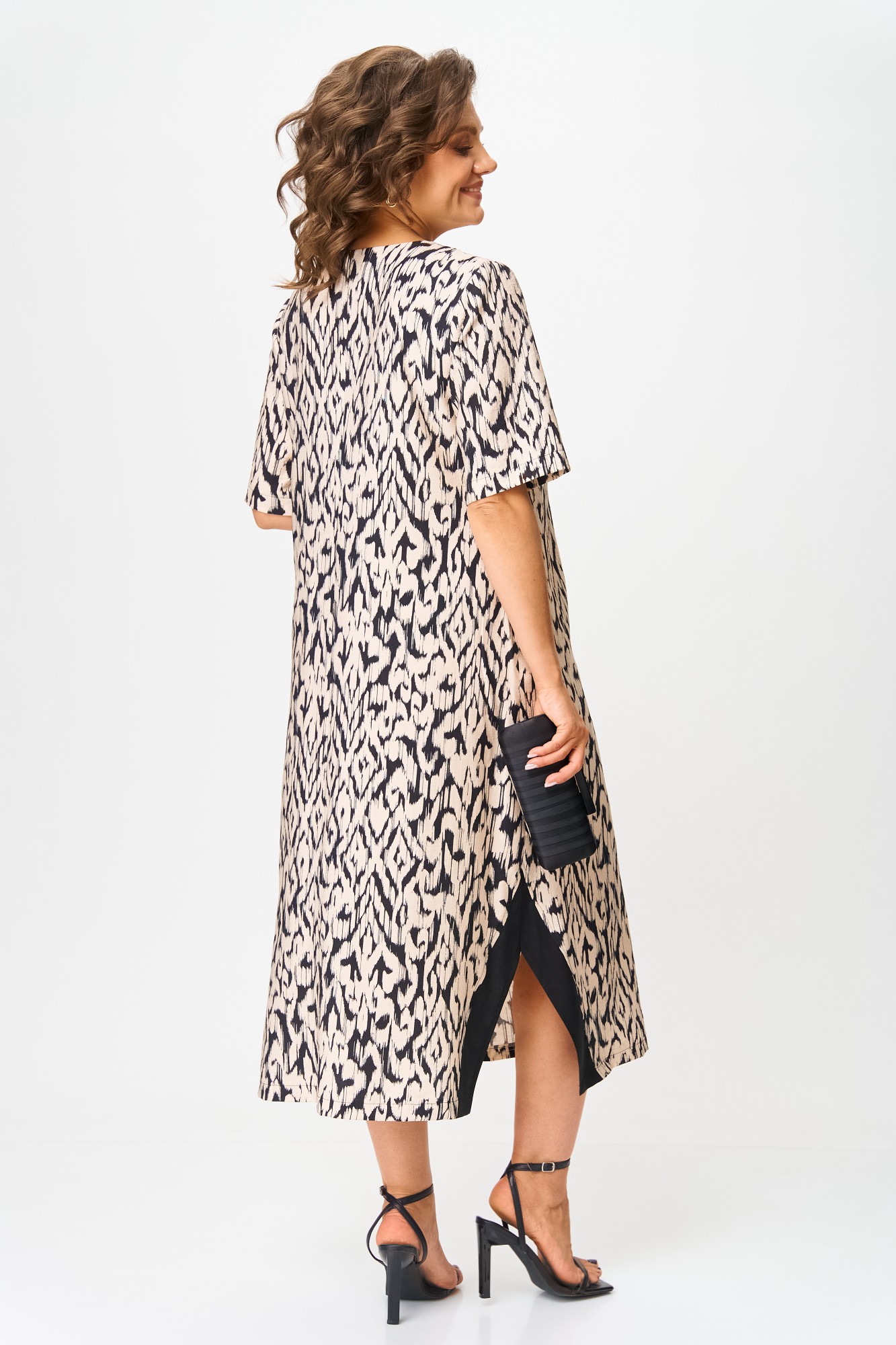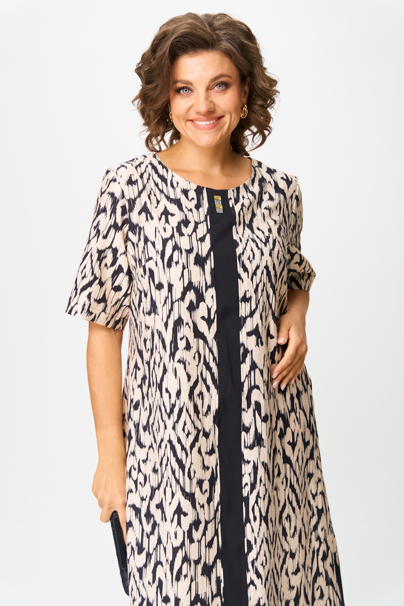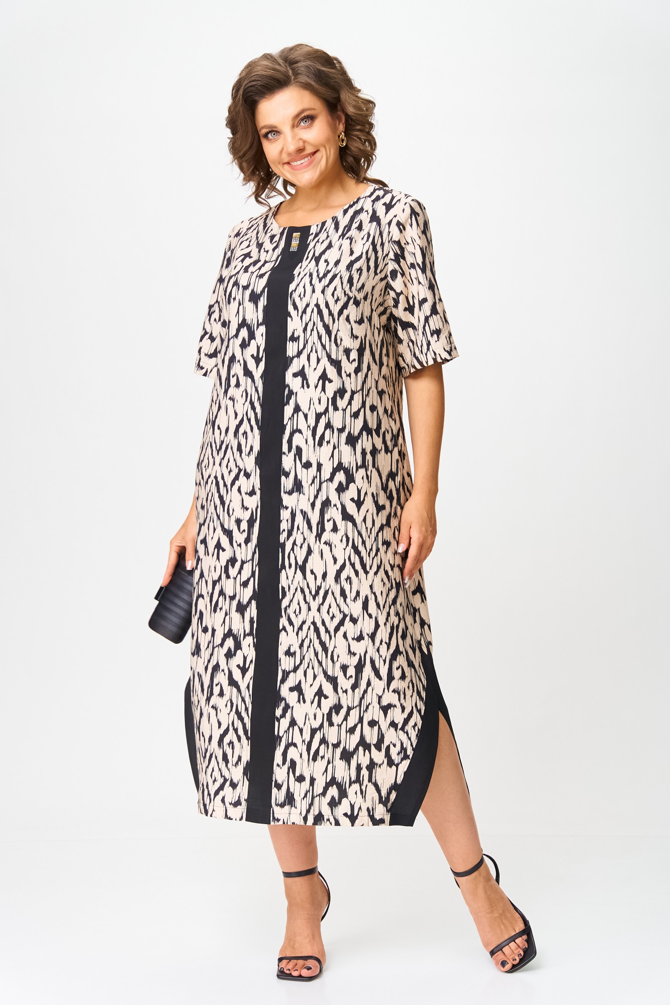 Платье в стиле casual предназначено для повседневной носки, прекрасно сочетается с любой по стилю обувью. Платье выполнено из вискозной ткани, свободного кроя, ниже колена, рукав укорочен. В качестве декора по переду изделия — вставлена планка из контрастной ткани, на планке нанесены стразы. По бокам изделия — разрезы, которые также обработаны контрастной тканью, в цвет декоративной планки. Также в изделии имеются боковые карманы.