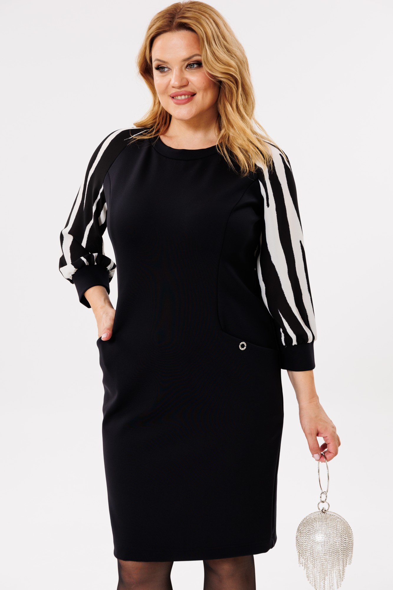 Нарядное женственное платье полуприлегающего силуэта, длиной до колена и с объёмными рукавами будет незаменимым для торжественных мероприятий и повседневной жизни. Платье выполнено из плотного эластичного приятного на ощупь трикотажа, с рельефами из проймы, заканчивающимися карманами в швах, горловина круглая, левый карман декорирован пришивным металлическим кольцом со стразами. Рукав 3/4, выполнен из шифоновой ткани, снизу на манжете.