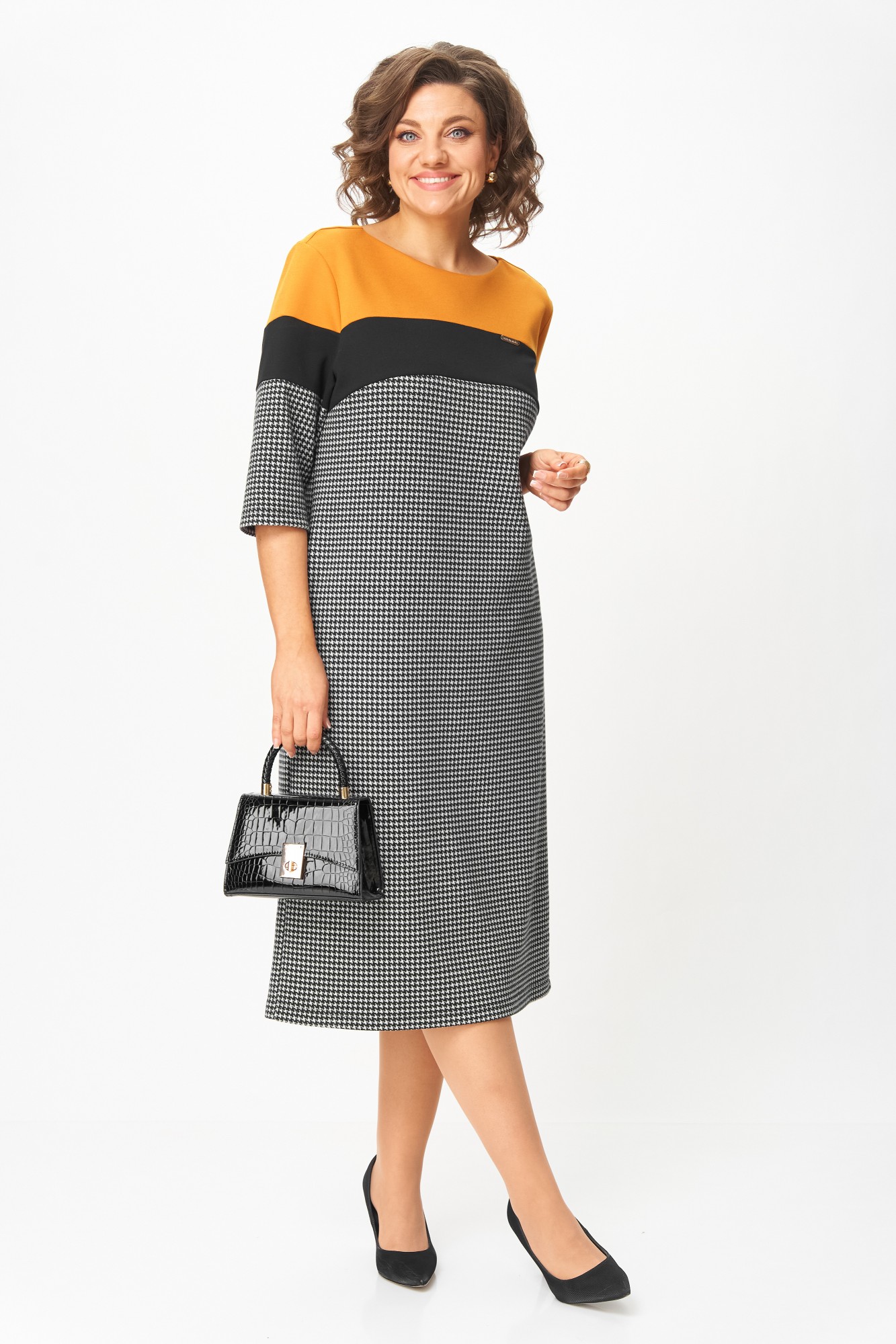 Это платье создано для женщин, которые выбирают комфорт и элегантность каждый день. Плотный трикотаж высокого качества мягко обнимает фигуру, не теряя форму, не вытягивается и не просвечивает. Контрастное сочетание горчичного, чёрного и классического принта “гусиная лапка” визуально стройнит и освежает образ. Рукав ¾ и длина миди делают модель практичной и универсальной — удобно и в офисе, и на прогулке, и на встрече.