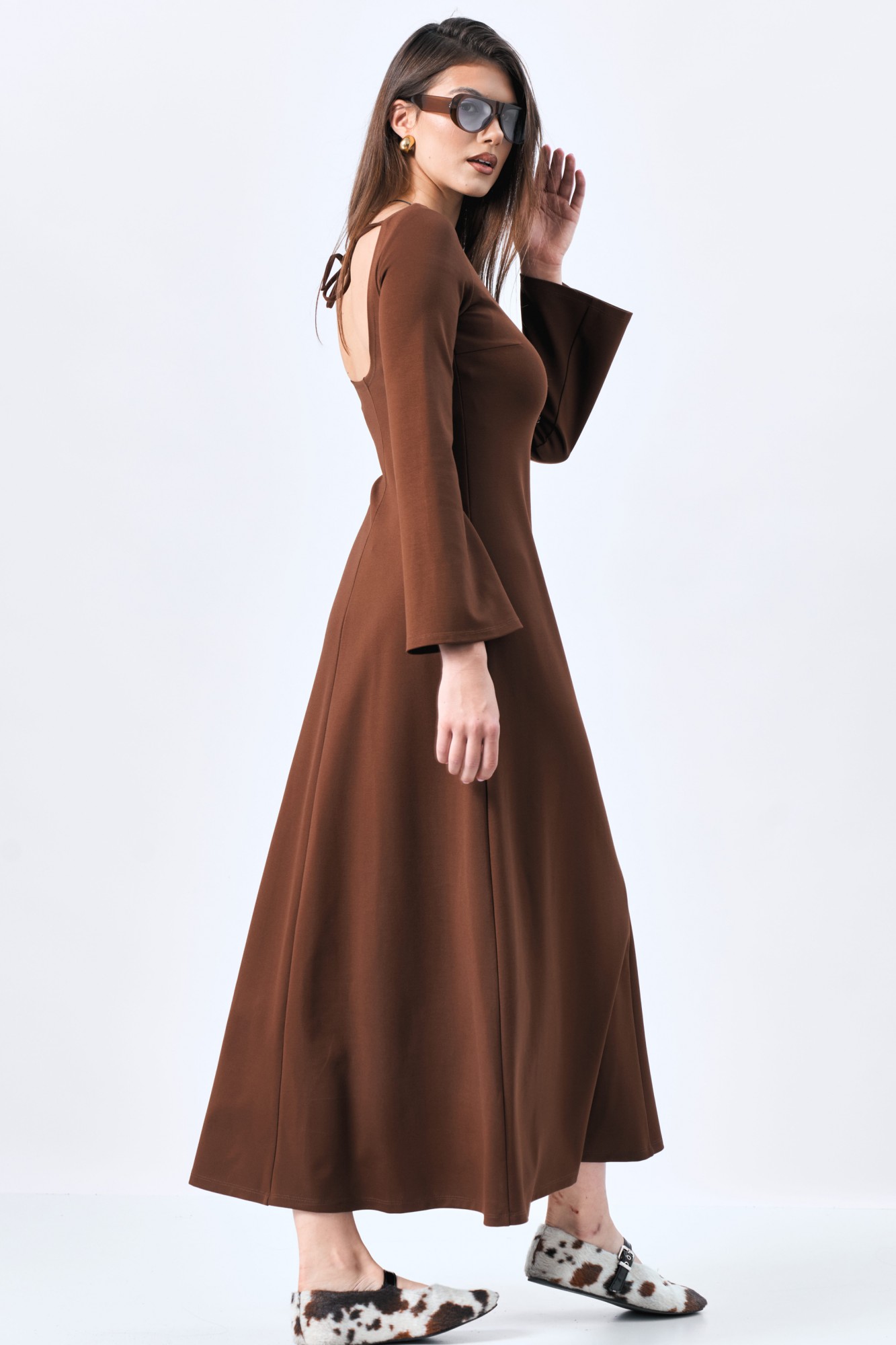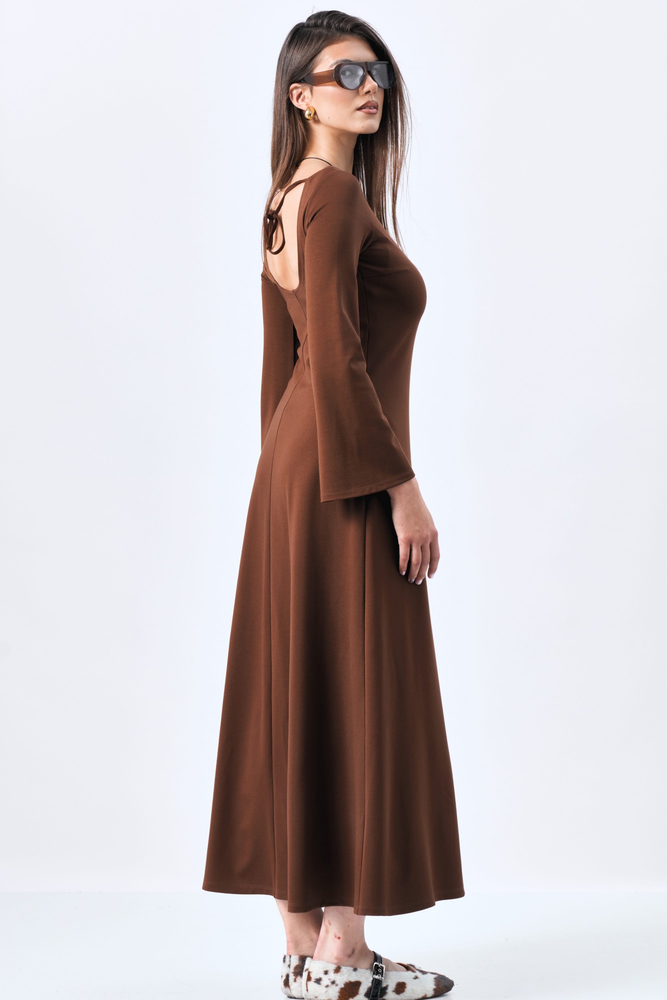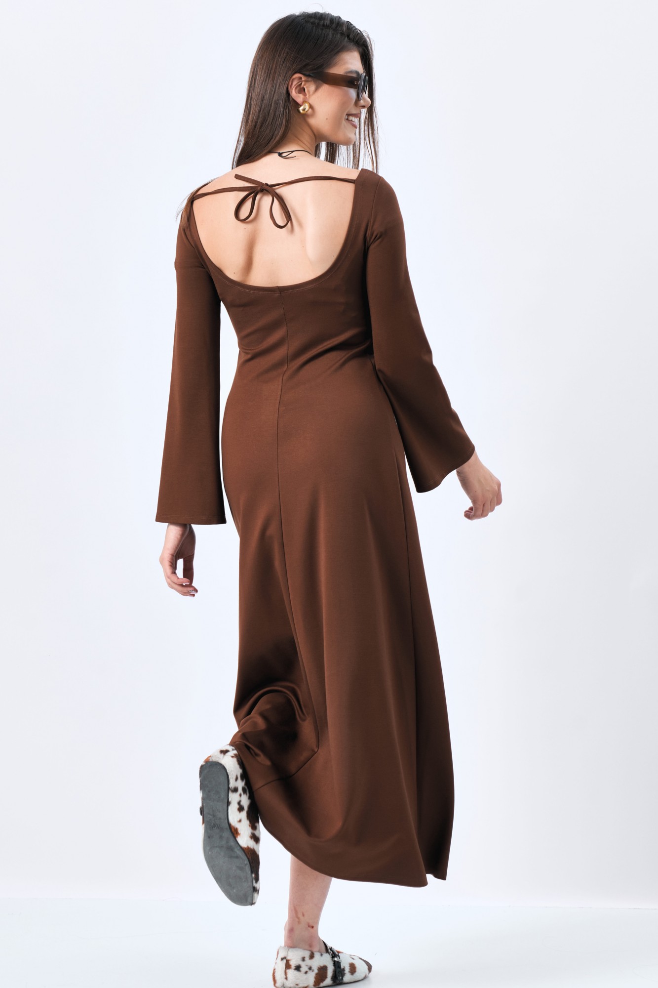 Платье женское приталенного силуэта, расклешенное к низу. Рукав длинный с расширением. Вырез на спине полукруглый на завязках.