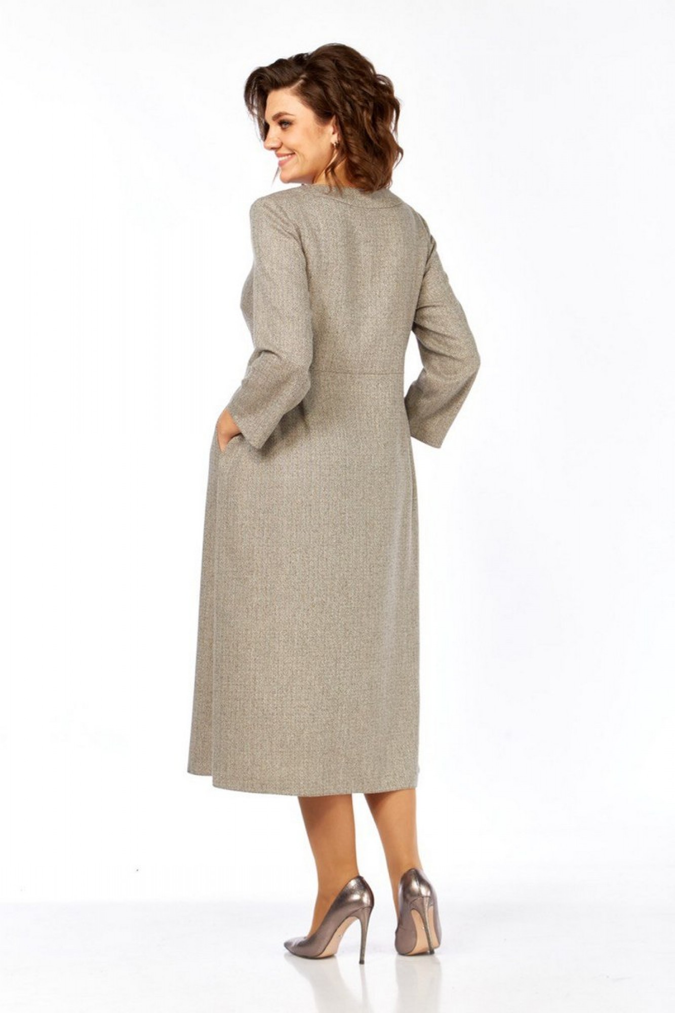 Платье свободного силуэта, длины миди, без подкладки. Горловина обработана широкой бейкой из основной ткани, по груди вытачки для лучшего прилегания. Платье отрезное по линии талии, со втачной отделочной деталью с декоративным хлястиком, юбка со сборкой на уровне отделочной детали, карманы-хулиганы в боковых швах. Рукав ¾.