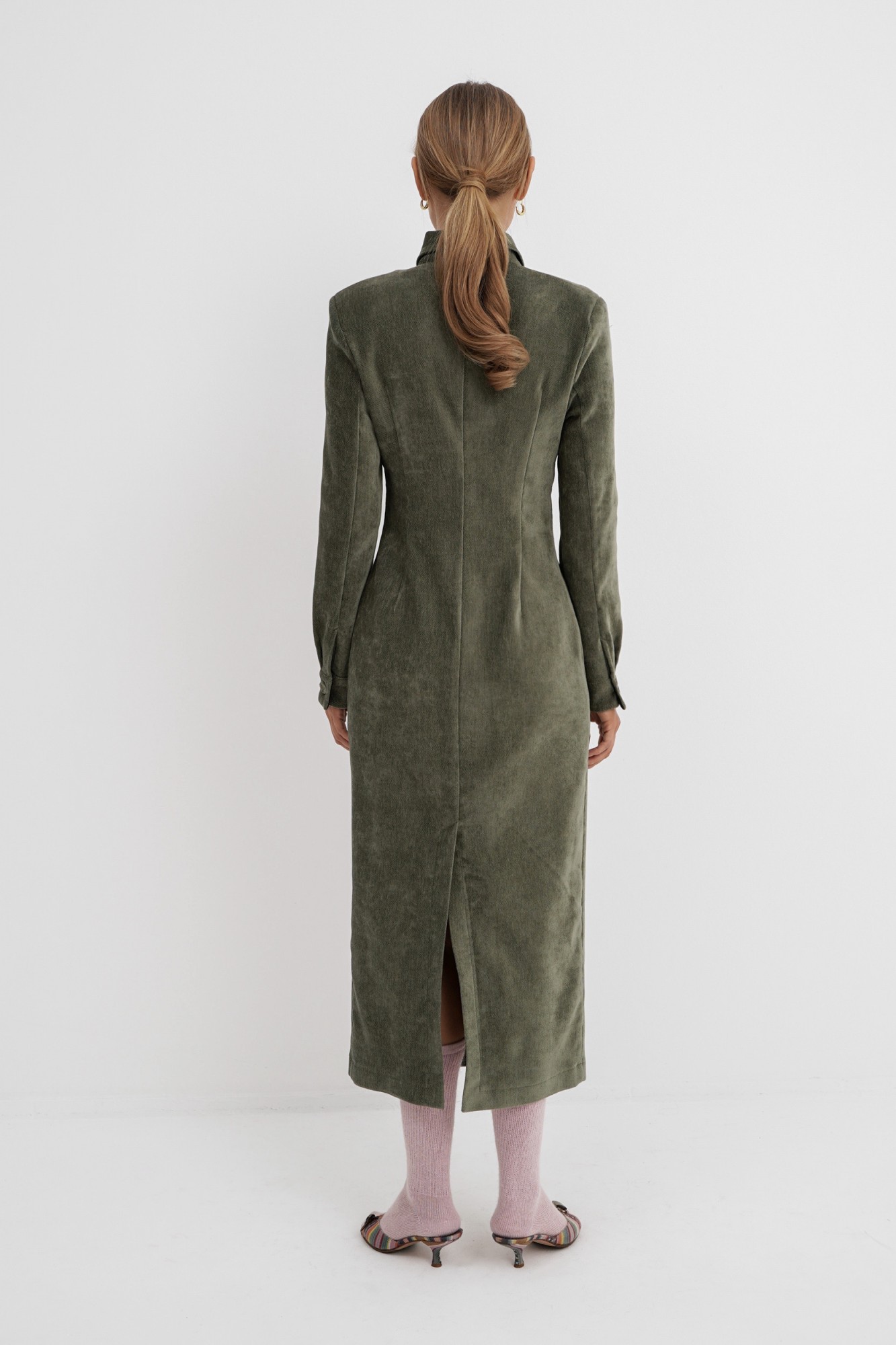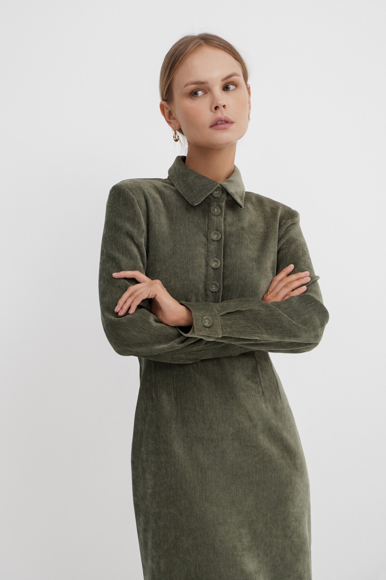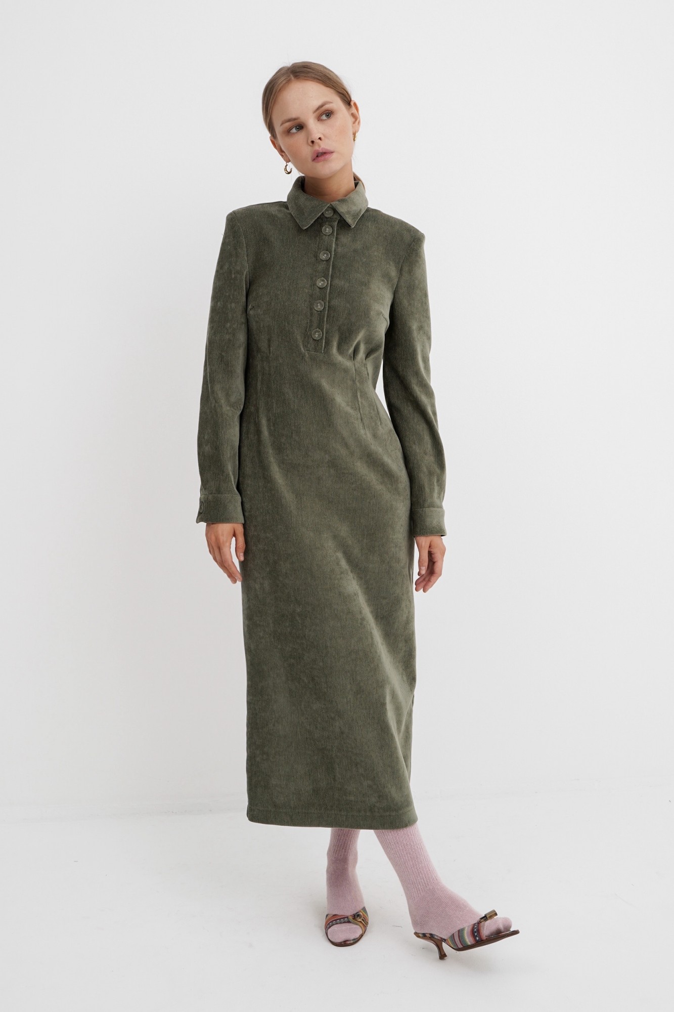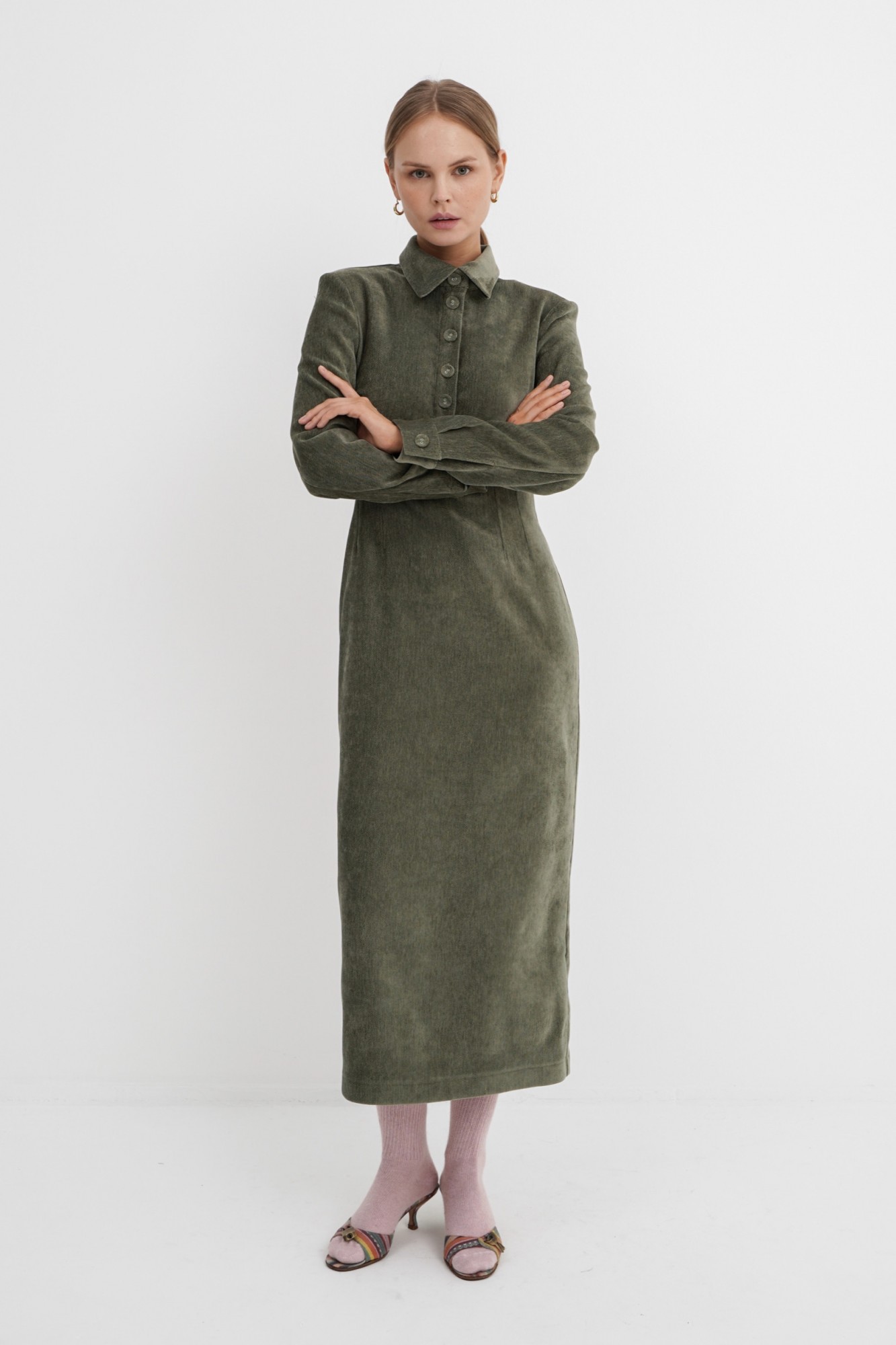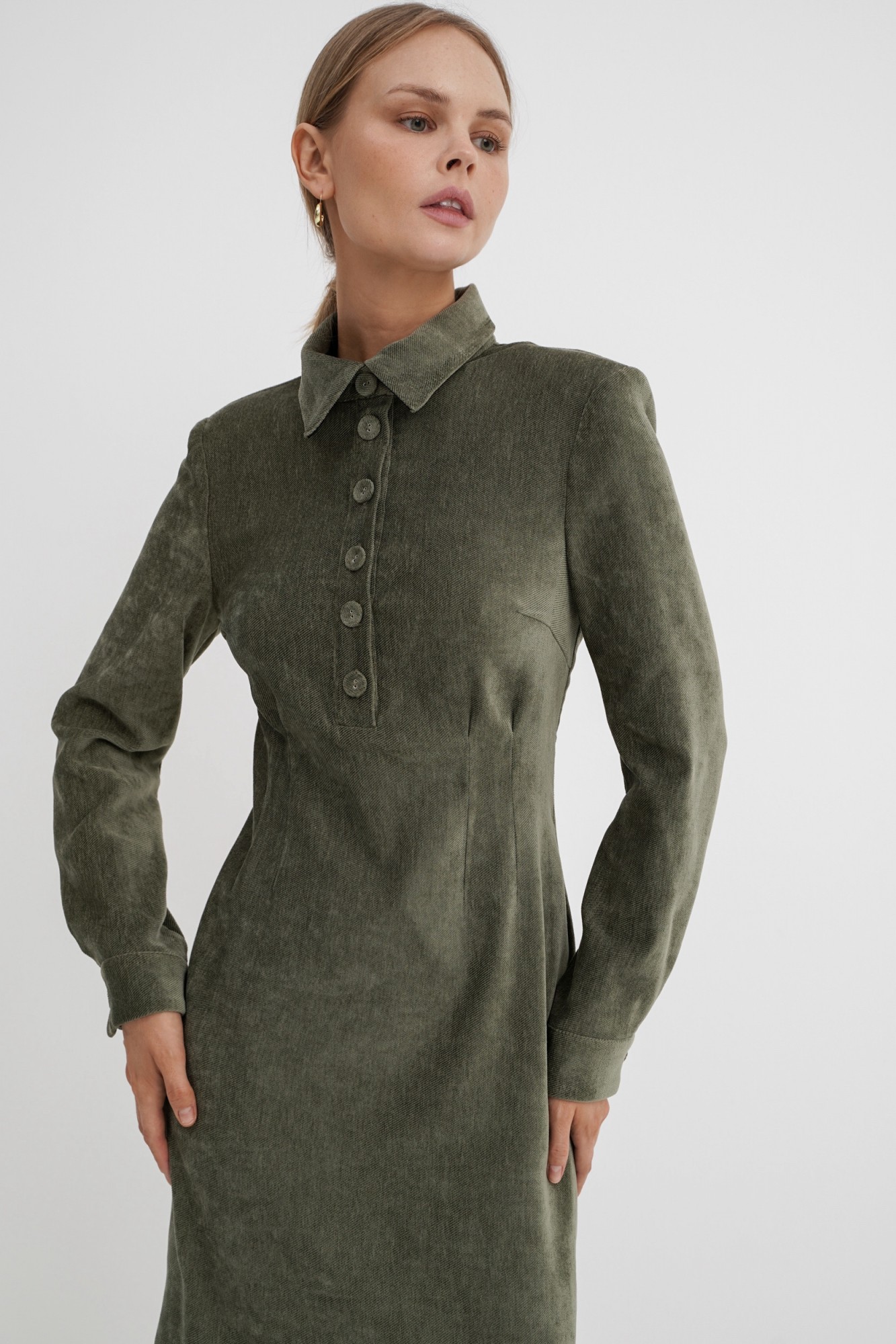 Приталенное платье-поло длины миди из бархатистой ткани. Детали: прилегающий силуэт, талиевые вытачки, отложной воротник, перед с втачными планками и застежкой на пуговицы, рукава втачные длинные с манжетами, спинка со средним швом и высоким разрезом.