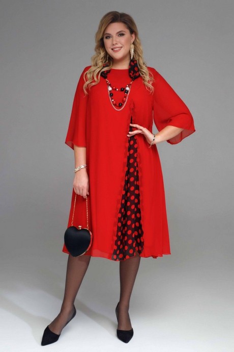 Женское платье активно расширенного к низу силуэта, выполненное из тонкого струящегося однотонного шифона с подкладкой из тонкого трикотажа. По переду платья есть треугольная вставка, выполненная из шифона с дизайном. Также из шифона с дизайном выполнена часть съемных бус, которые служат декором изделия. Горловина округлая. Рукав втачной расширенный.