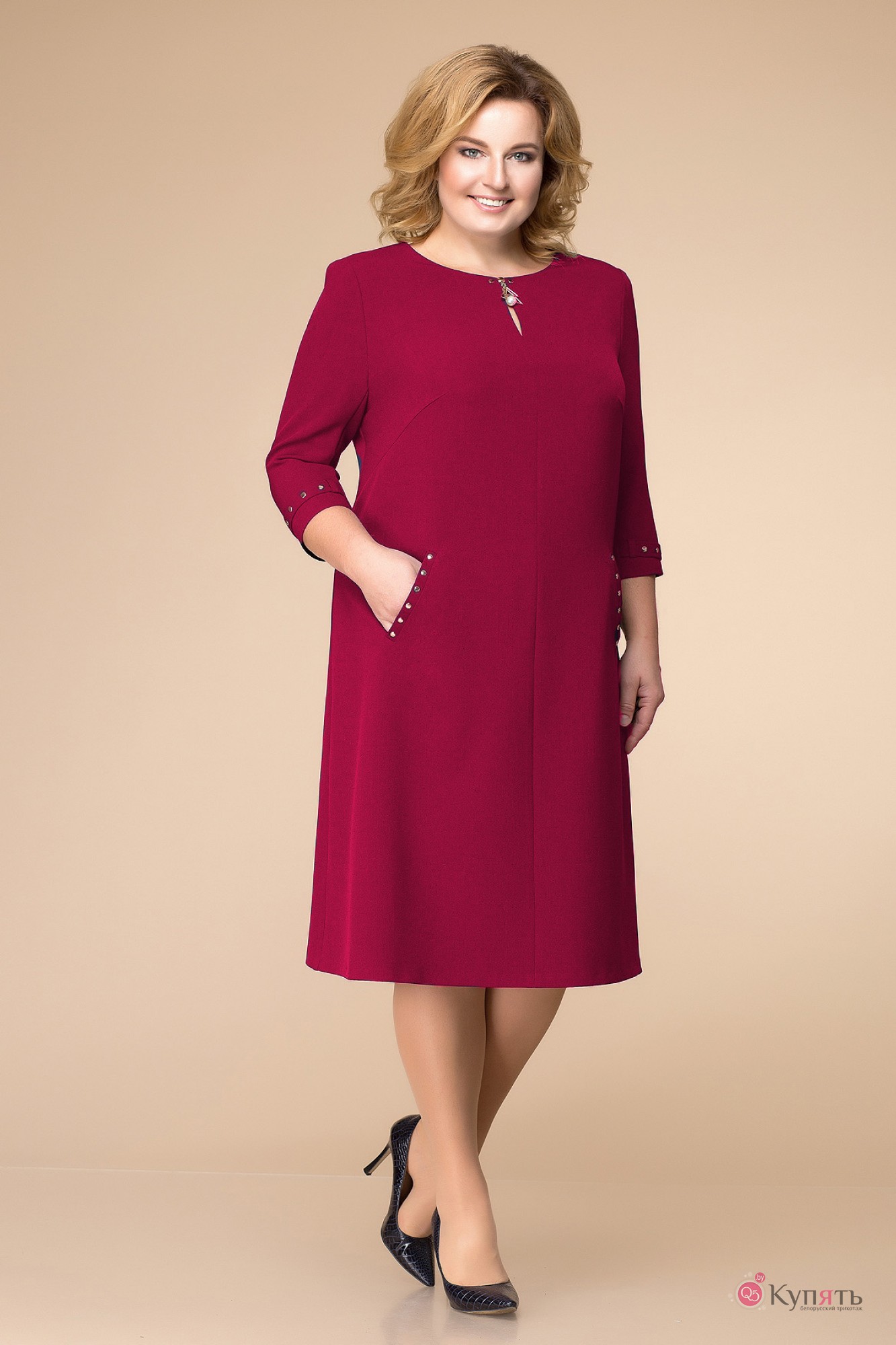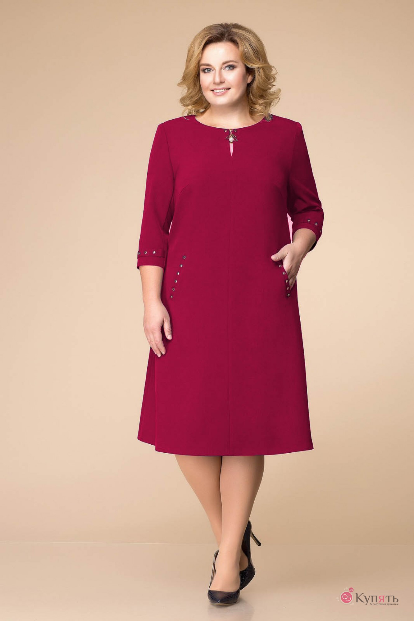 Платье женское расширенное книзу, длиной за колено, предназначено для повседневной носки. Перед с двумя нагрудными вытачками, с двумя прорезными карманами с листочками, с втачными концами на уровне линии бедер, со средним швом, вверху с разрезом, фиксирующимся пришивным украшением с двумя пробивными хольнитенами. Спинка со средним швом. Застежка на потайную тесьму-молнию в среднем шве спинки. Горловина круглая, обтачная, без воротника. Рукав втачной, двух шовный, длиной 3/4. Внизу верхнего рукава пата, фиксирующаяся в две настрочные шлевки. Пата с шестью пробивными хольнитенами. Платье с плечевыми накладками.