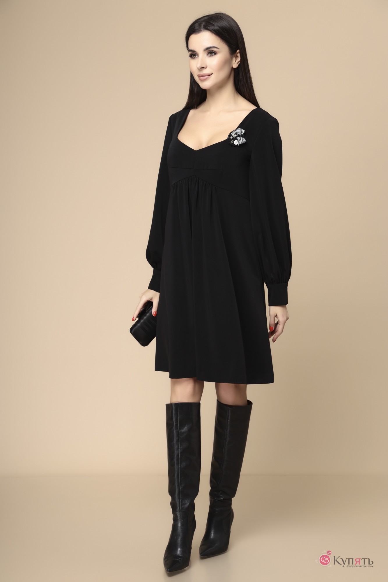 Платье женское отрезное выше линии талии с фигурным подрезом, расширенное к низу, длиной выше колена. Относится к нарядной торжественной одежде, но может использоваться и при повседневной. Верхняя часть переда со средним швом, с 2-мя нагрудными вытачками, выходящими из среднего шва. Нижняя часть переда со сборкой по верхнему срезу. Верхняя часть спинки, цельнокроенная. Нижняя часть спинки со сборкой по верхнему срезу. Горловина фигурная обтачная без воротника. Рукав втачной, одношовный, длинный, низ рукава со сборкой и притачной манжетой с застежкой на 2-е обметанные петли и 2-е пришивные пуговицы. Перед платья декорируется съемным украшением. Платье без плечевых накладок.Длина спинки 86см Длина рукава 60см