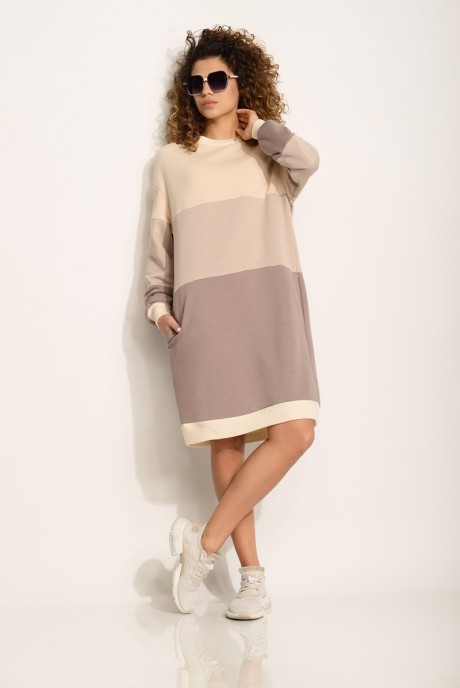 Платье женское из трикотажного полотна. Платье трехцветное. По рукавам и полочке декоративные горизонтальные линии. По горловине, а также по низу рукавов и платья – довяз. Рукав – спущенное плечо. В боковых швах карманы. Длина изделия 92 см. Длина рукава 72 см.