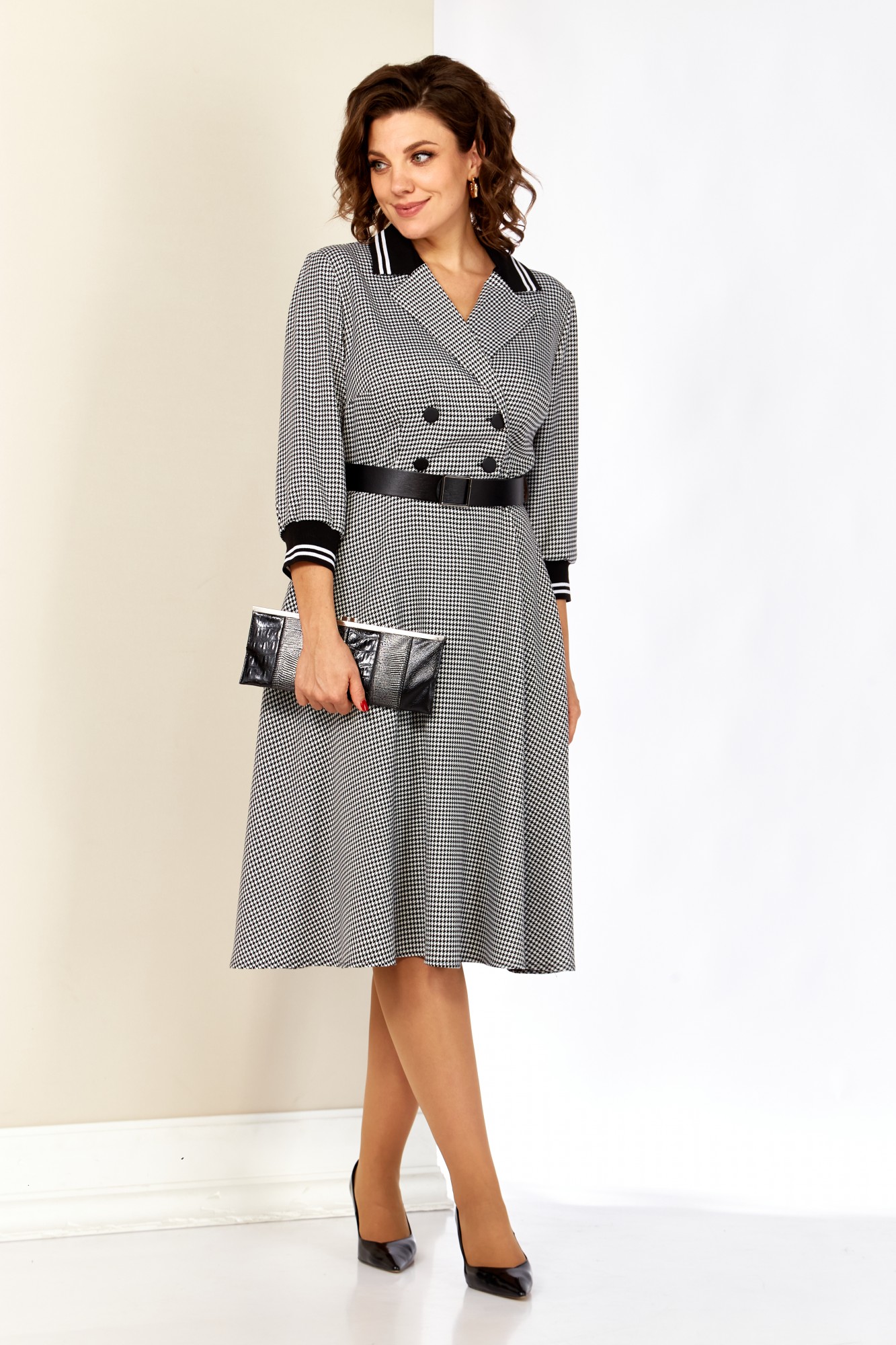 Женское элегантное классическое платье из костюмно-плательной ткани с рисунком «Гусиная лапка». Платье полу прилегающего силуэта, отрезное по линии талии, расклешенное к низу. Лиф переда с двубортной застежкой и нагрудными вытачками, выходящими из боковых швов. Спинка с таллиевыми вытачками по лифу. В боковых швах платья расположены только карманы, застежки на потайной молнии не будет! Воротник отложной. Современная модель с рукавам ¾ на манжетах, выполненных с эластичного материала (резинка-довяз). Платье с идеальной посадкой. Впишется в дресс-код и подойдет для офиса и школы. Поможет создать строгий и стильный образ. Сочетается с жакетами, куртками и пиджаками. Модель прекрасно дополнит современный гардероб и станет основной базовой вещью, которую можно обыграть любыми аксессуарами и различной обувью. Платье в комплекте с декоративным ремнем из эко-кожи. Прилагается таблица для правильно определения своего размера.