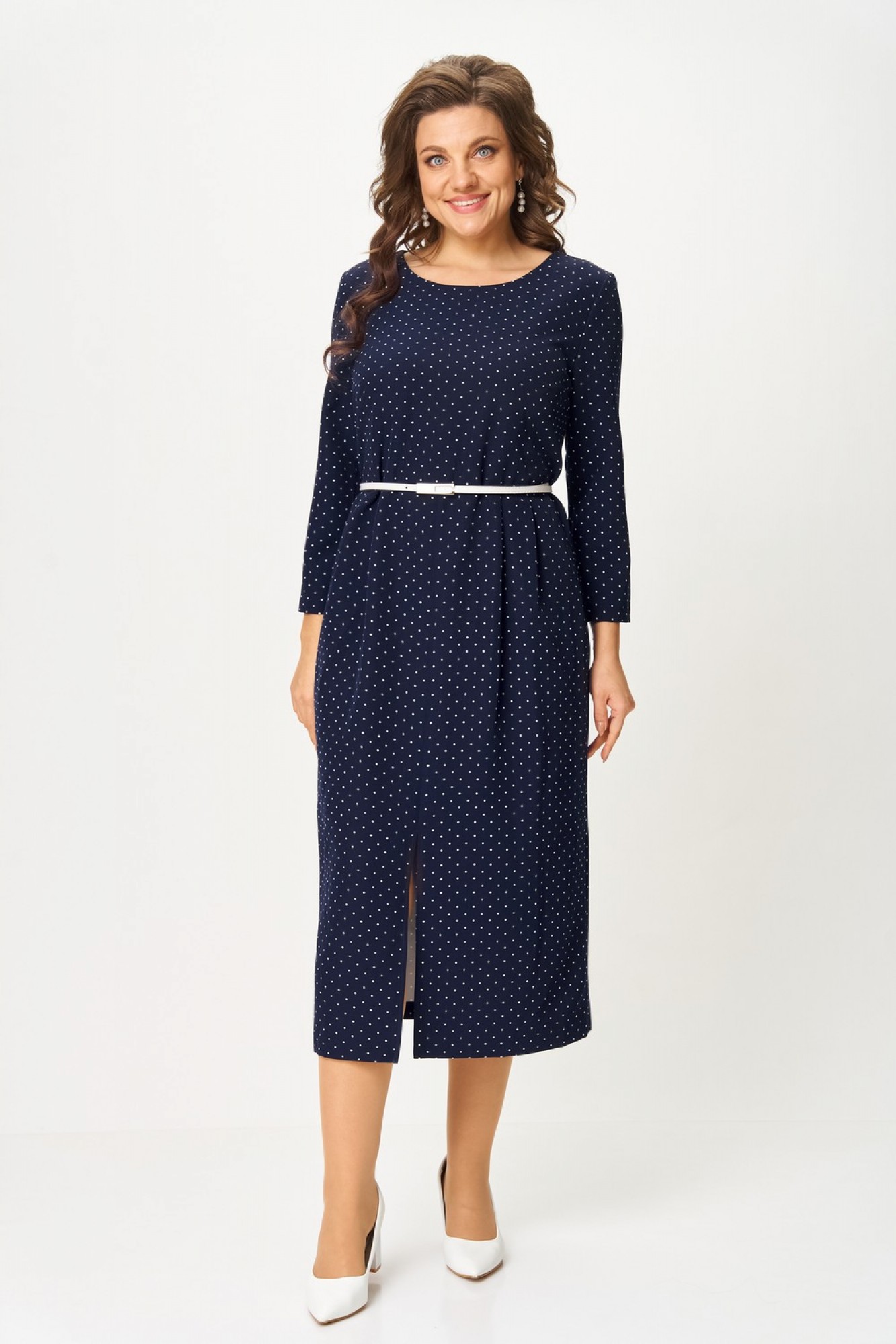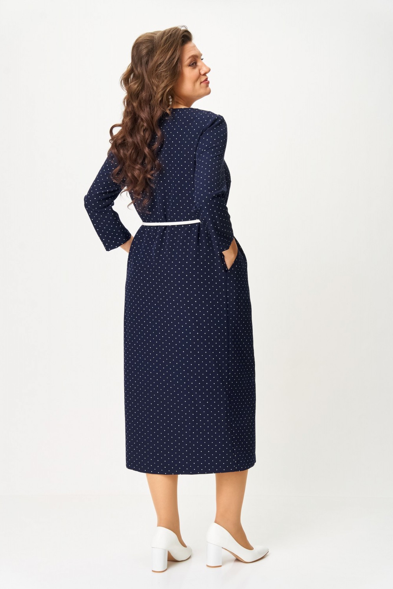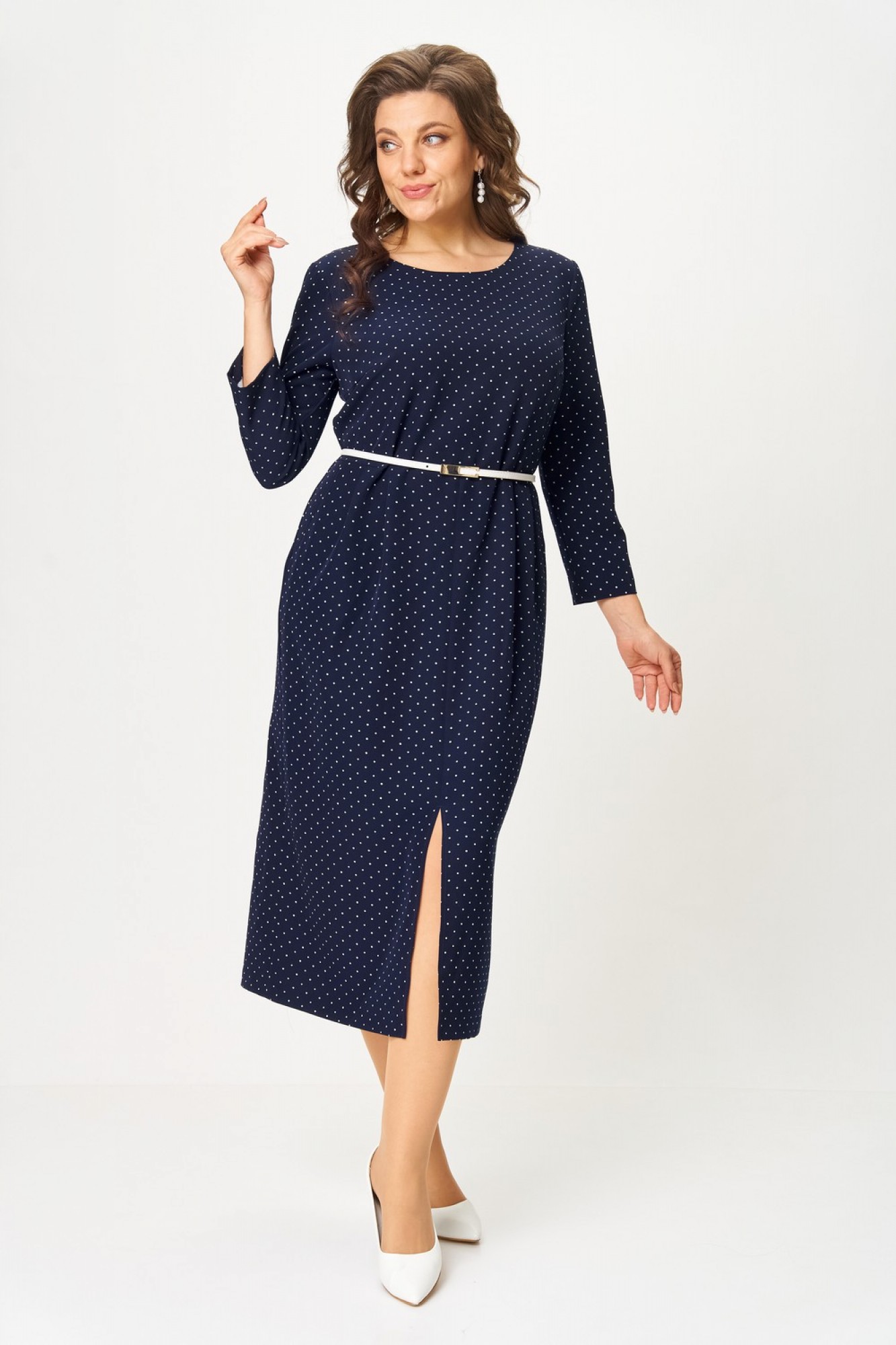 Платье женское полуприлегающего силуэта с втачным рукавом. Перед платья с горизонтальным швом по талии. Верхняя часть с вытачками по линии груди, нижняя часть со складками в области талии и карманами что обеспечивает прекрасную посадку и подчеркивает фигуру. Разрез по переду платья добавляет нотку игривости и удобства. В комплекте съемный ремень.