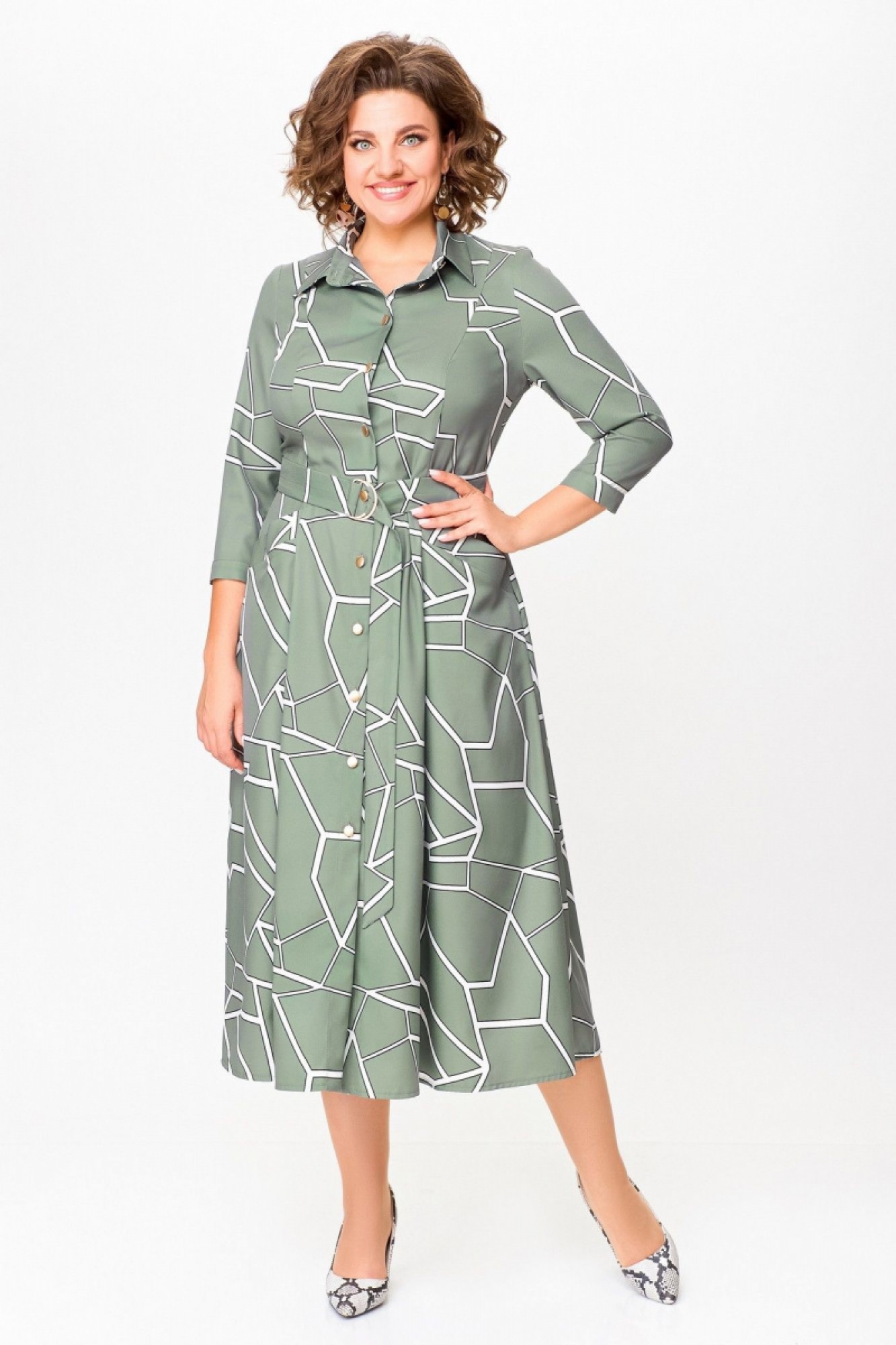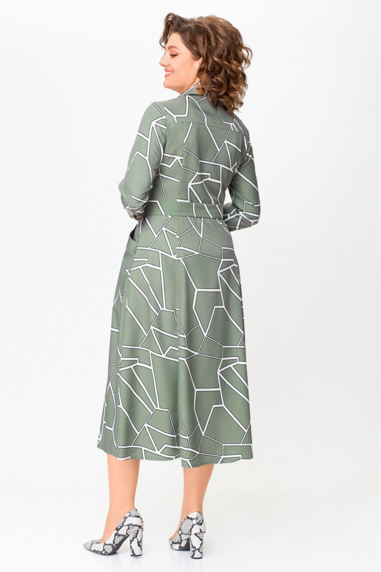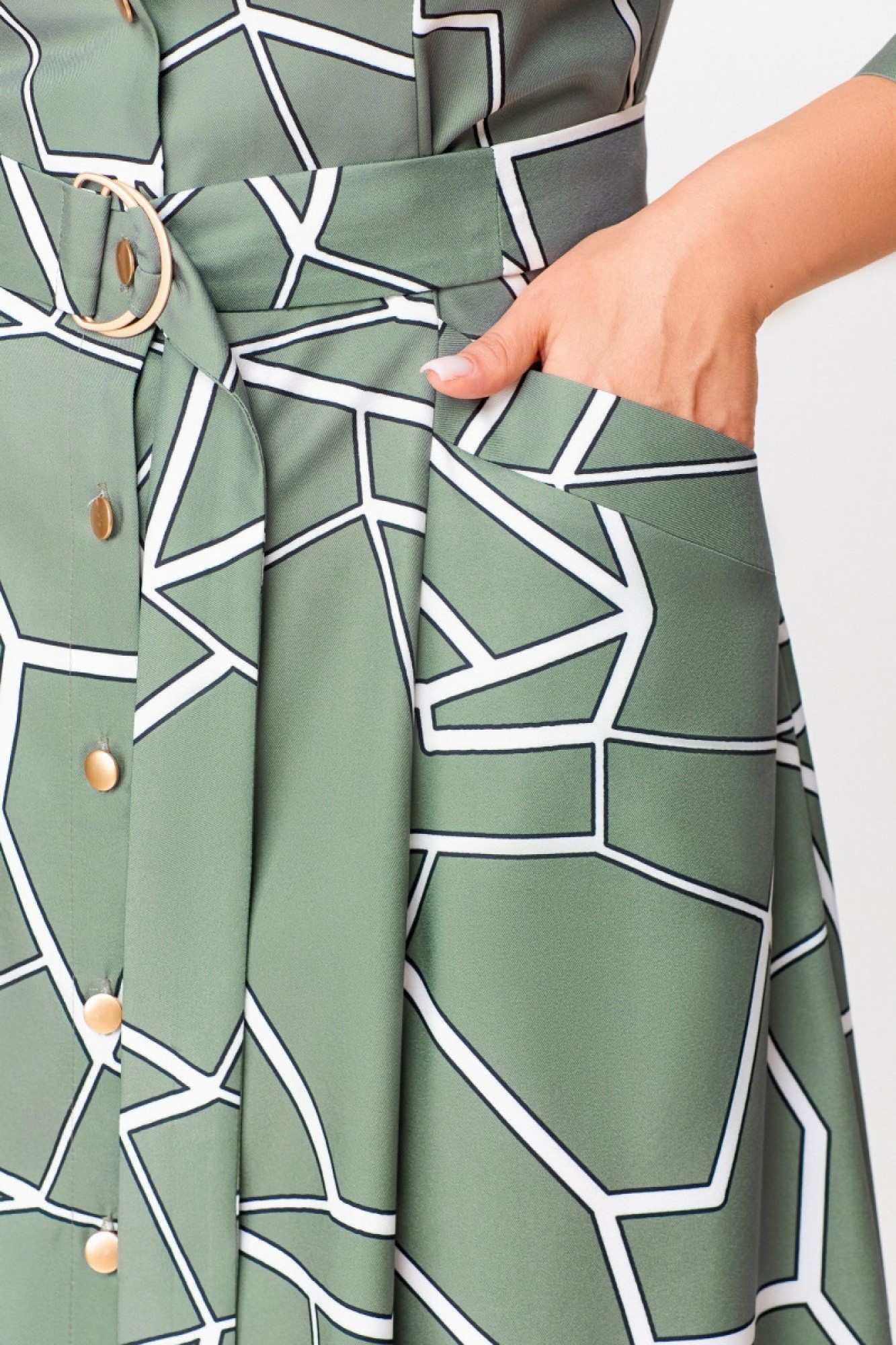Платье из мягкой вискозной ткани отрезное по линии талии с полуприлегающим лифом и юбкой А-силуэта, с центральной застёжкой на петли и декоративные пуговицы. Полочка с вертикальными рельефами, спинка с кокеткой и отрезными бочками. Юбка состоит из семи клиньев. По переду между швами обработан карман с планкой на косую. Воротник отложной рубашечного типа, с отрезной стойкой. Рукав втачной, одношовный длиной ¾, внизу с манжетой, которая застёгивается на петлю и пуговицу. Платье комплектуется поясом из основной ткани, с декоративными полукольцами.