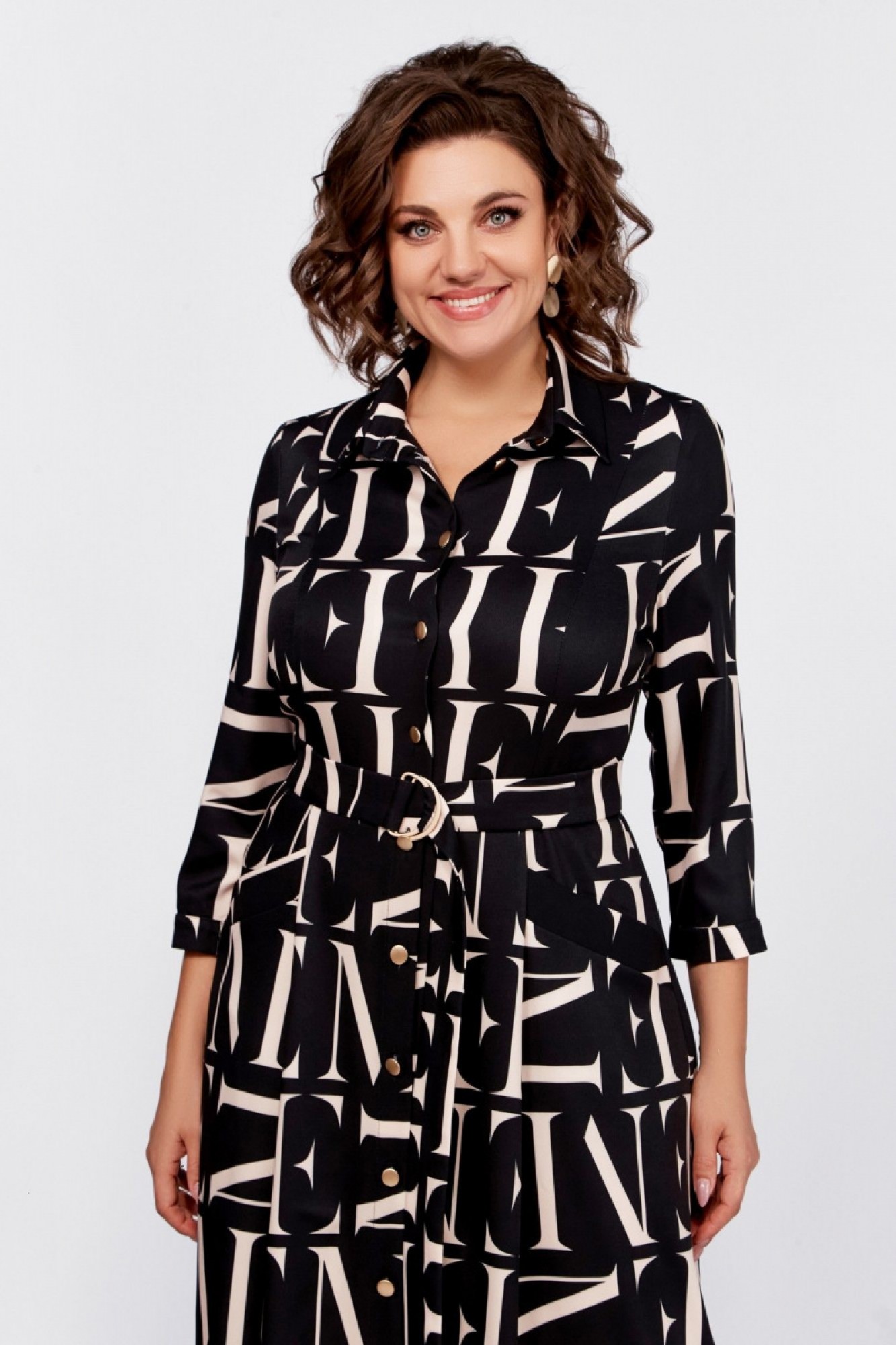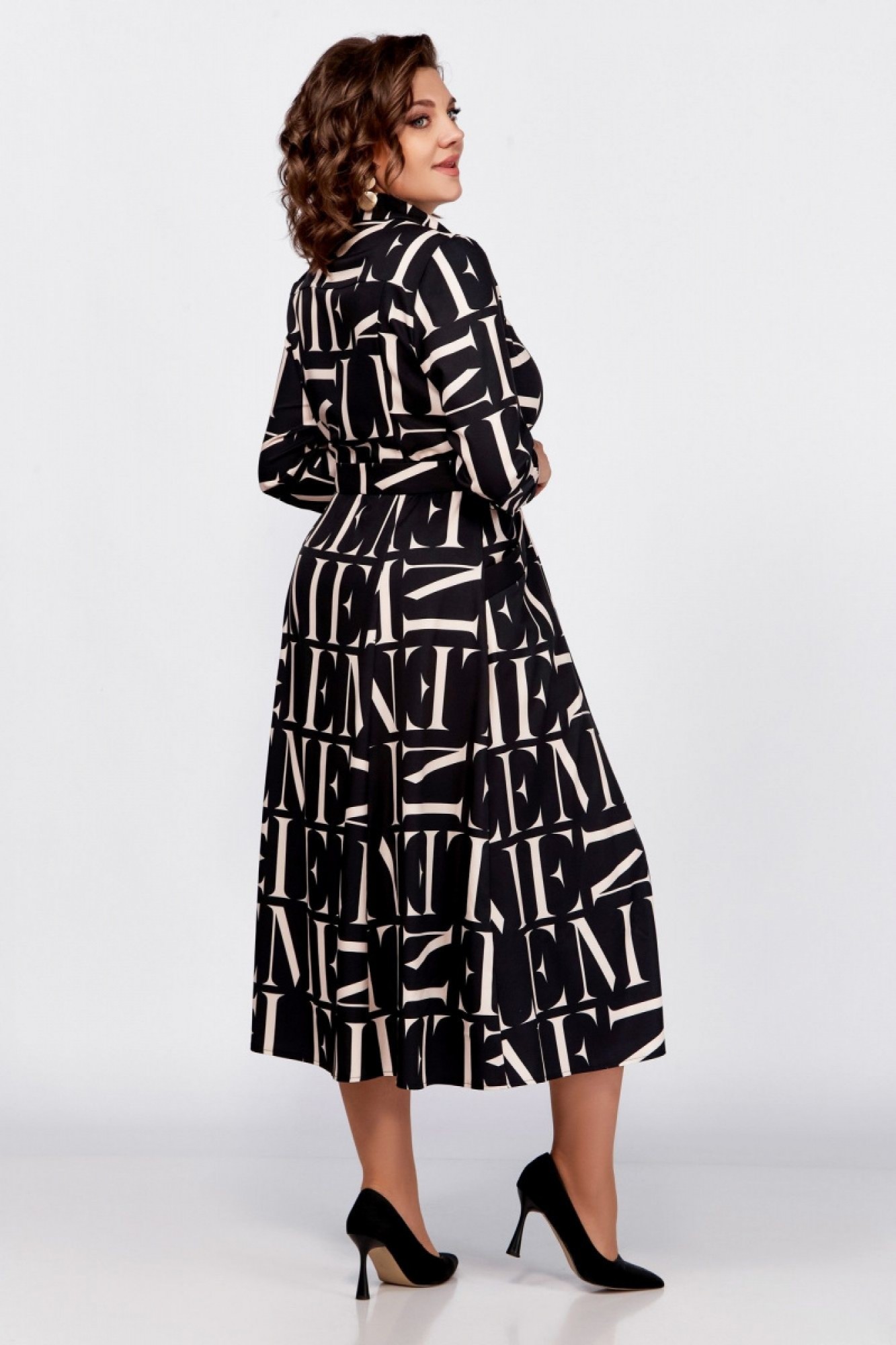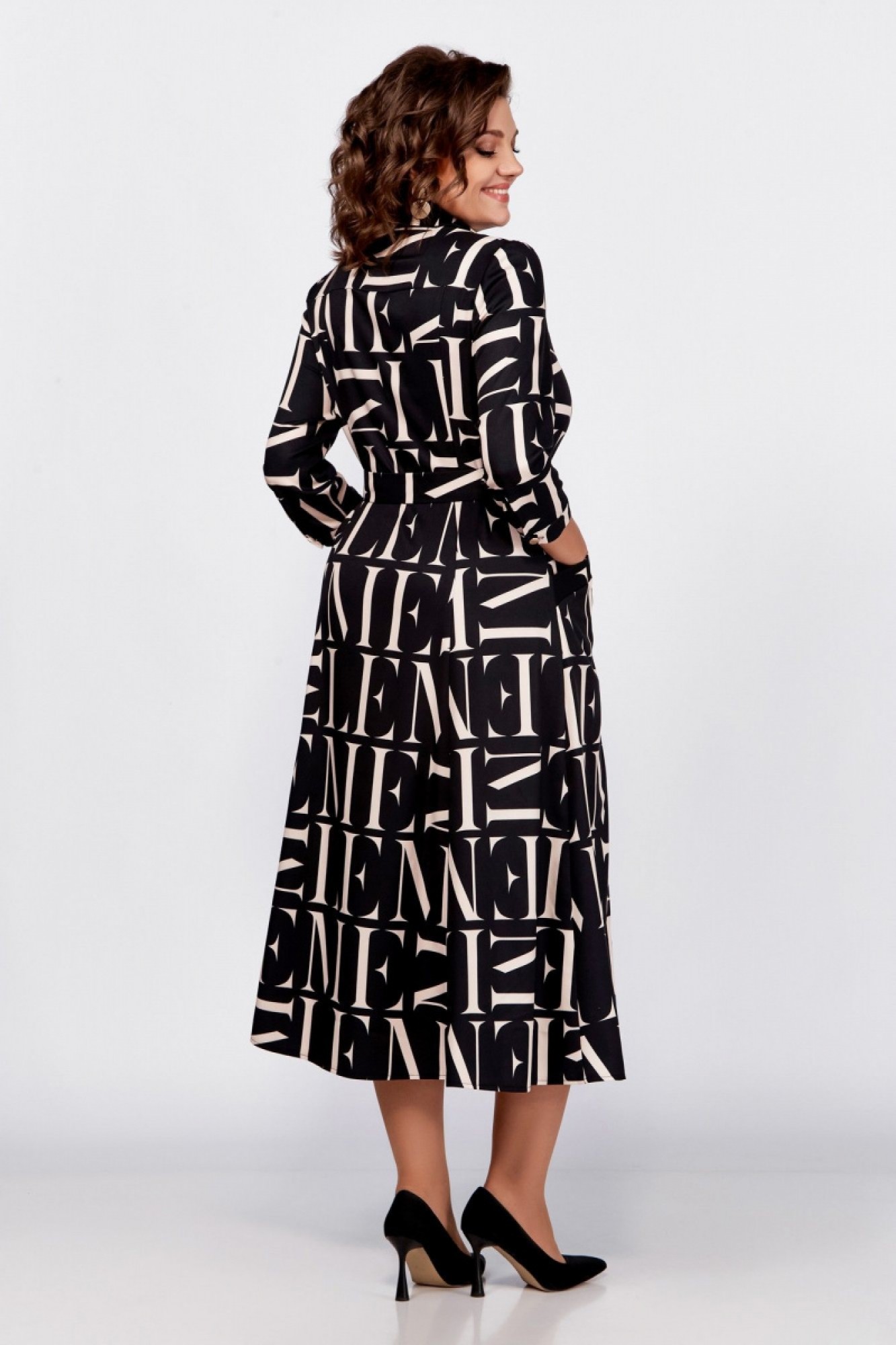 Платье из мягкой вискозной ткани отрезное по линии талии с полуприлегающим лифом и юбкой А-силуэта, с центральной застёжкой на петли и декоративные пуговицы. Полочка с вертикальными рельефами, спинка с кокеткой и отрезными бочками. Юбка состоит из семи клиньев. По переду между швами обработан карман с планкой на косую. Воротник отложной рубашечного типа, с отрезной стойкой. Рукав втачной, одношовный длиной ¾, внизу с манжетой, которая застёгивается на петлю и пуговицу. Платье комплектуется поясом из основной ткани, с декоративными полукольцами.
