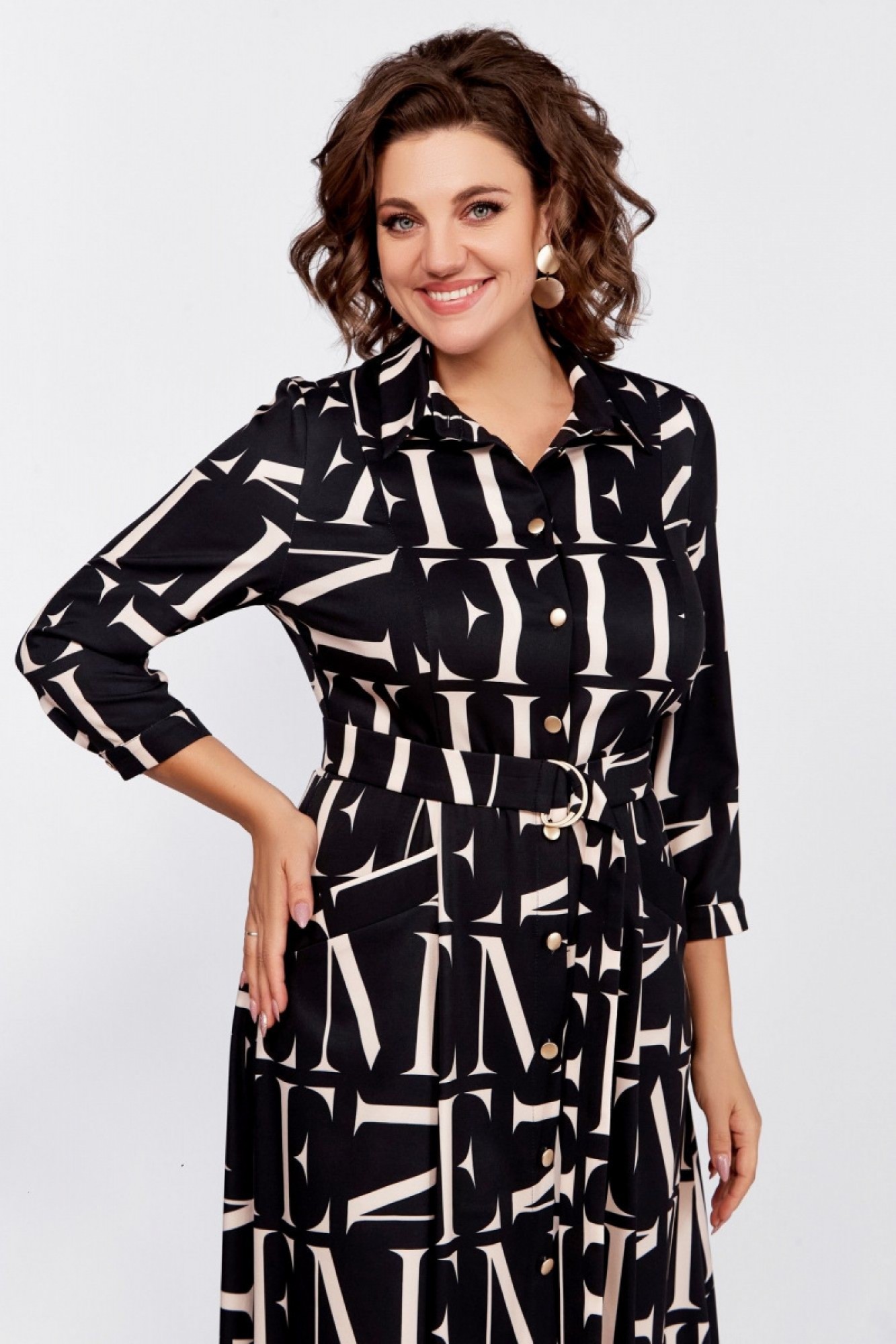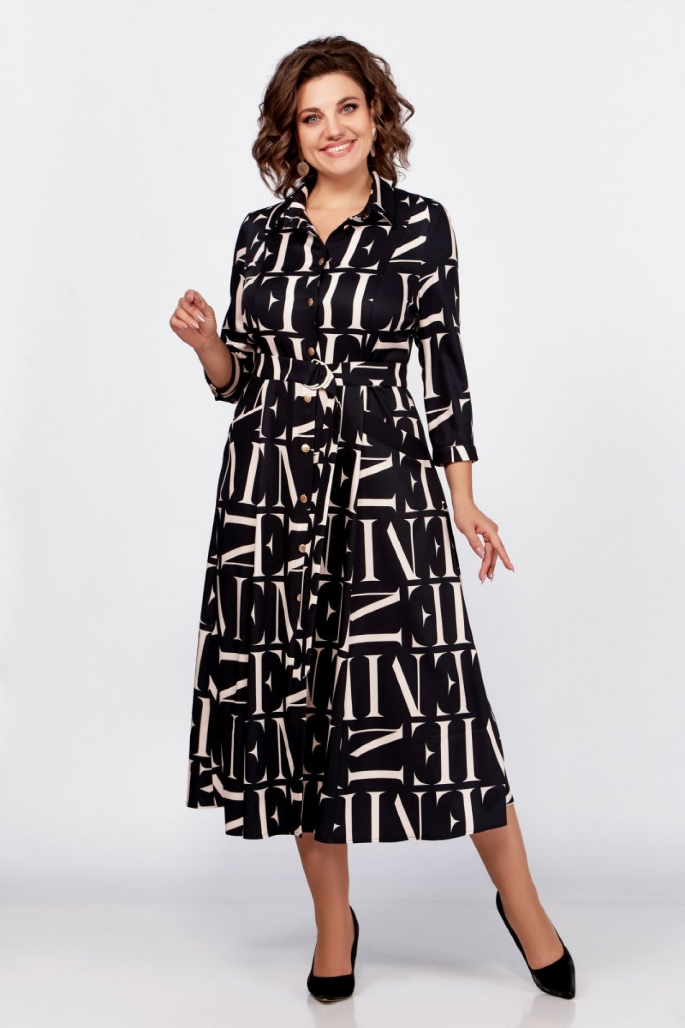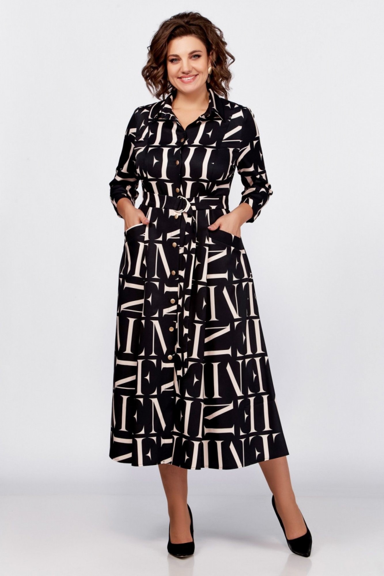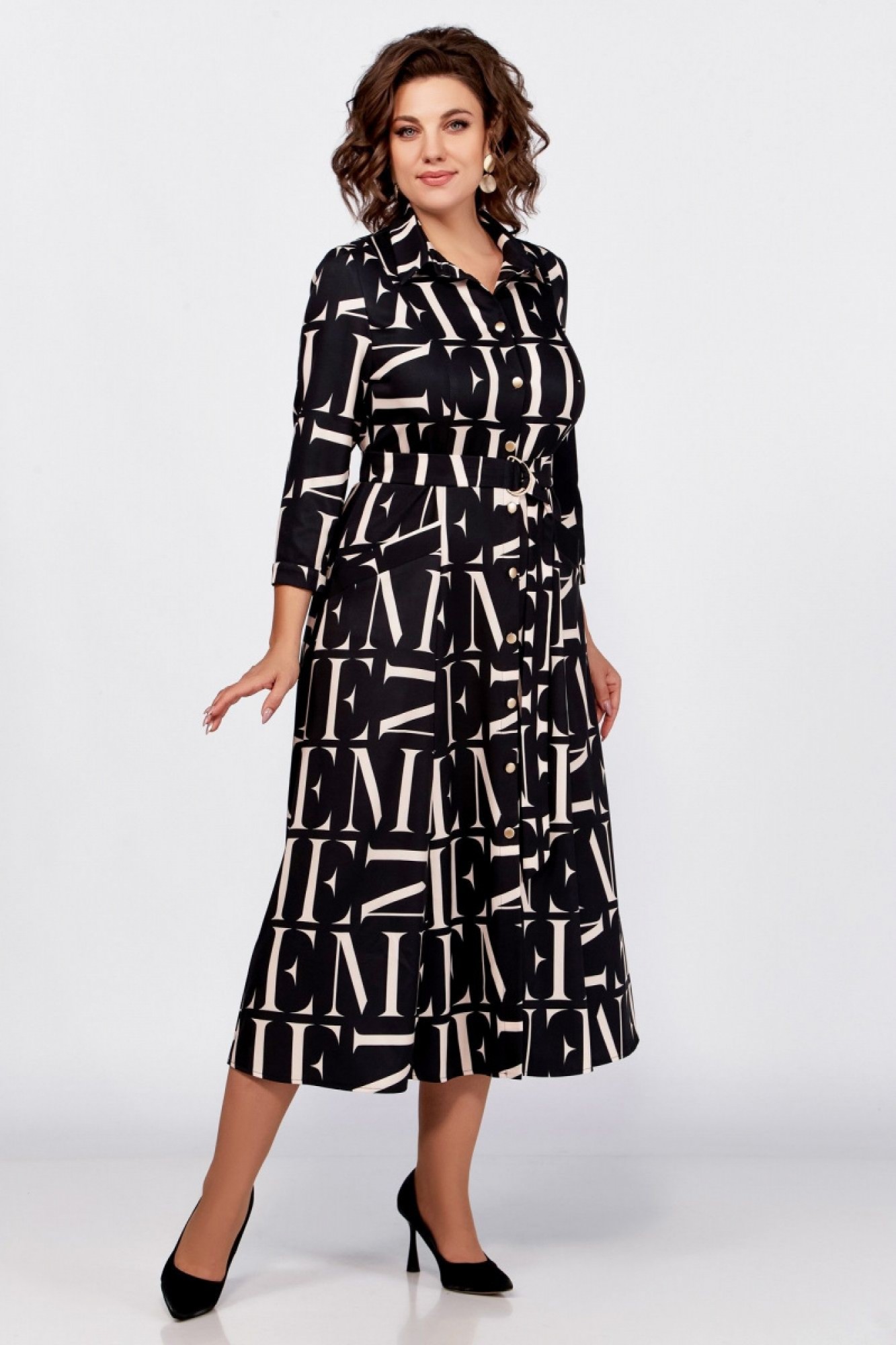 Платье из мягкой вискозной ткани отрезное по линии талии с полуприлегающим лифом и юбкой А-силуэта, с центральной застёжкой на петли и декоративные пуговицы. Полочка с вертикальными рельефами, спинка с кокеткой и отрезными бочками. Юбка состоит из семи клиньев. По переду между швами обработан карман с планкой на косую. Воротник отложной рубашечного типа, с отрезной стойкой. Рукав втачной, одношовный длиной ¾, внизу с манжетой, которая застёгивается на петлю и пуговицу. Платье комплектуется поясом из основной ткани, с декоративными полукольцами.