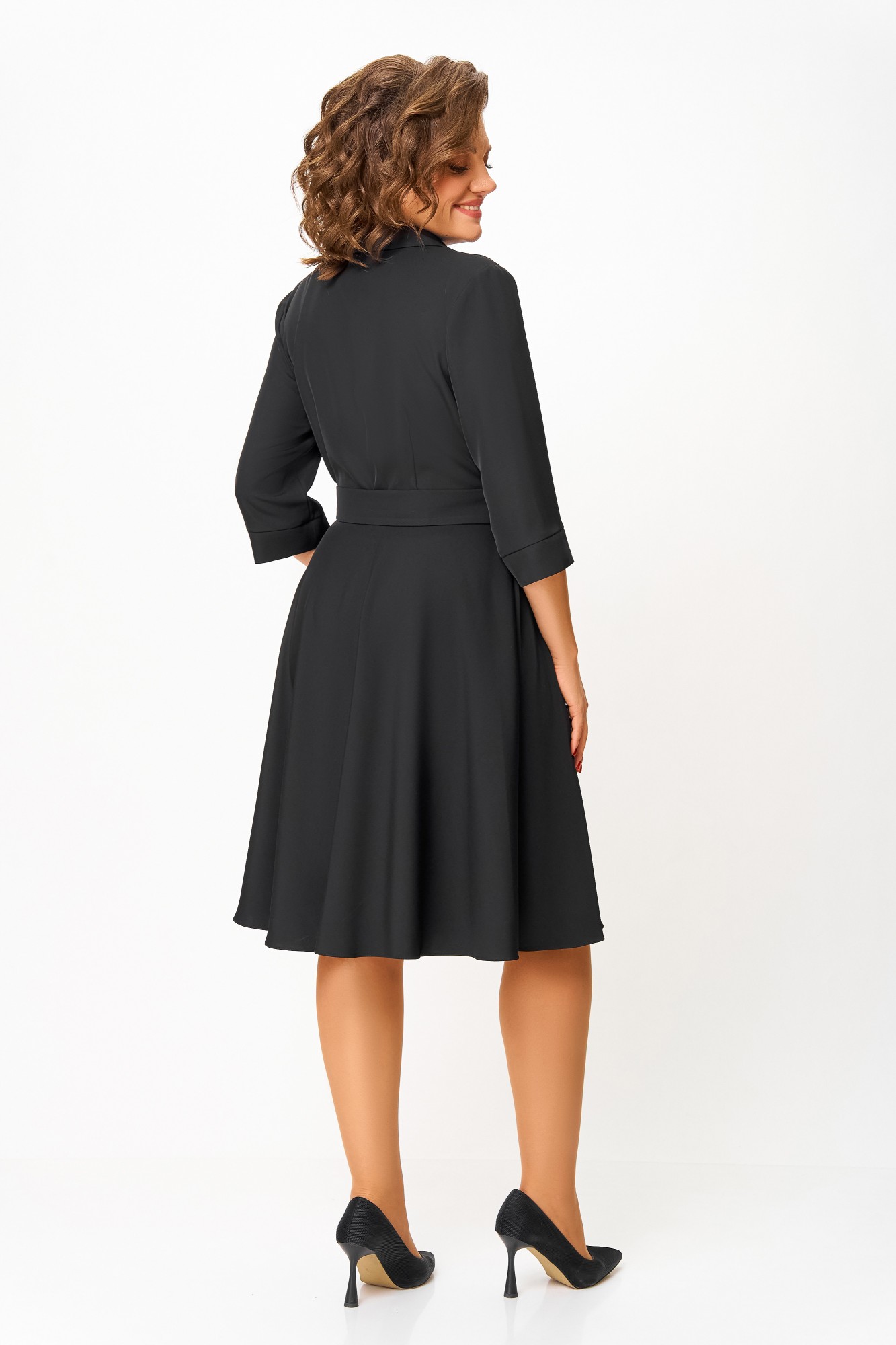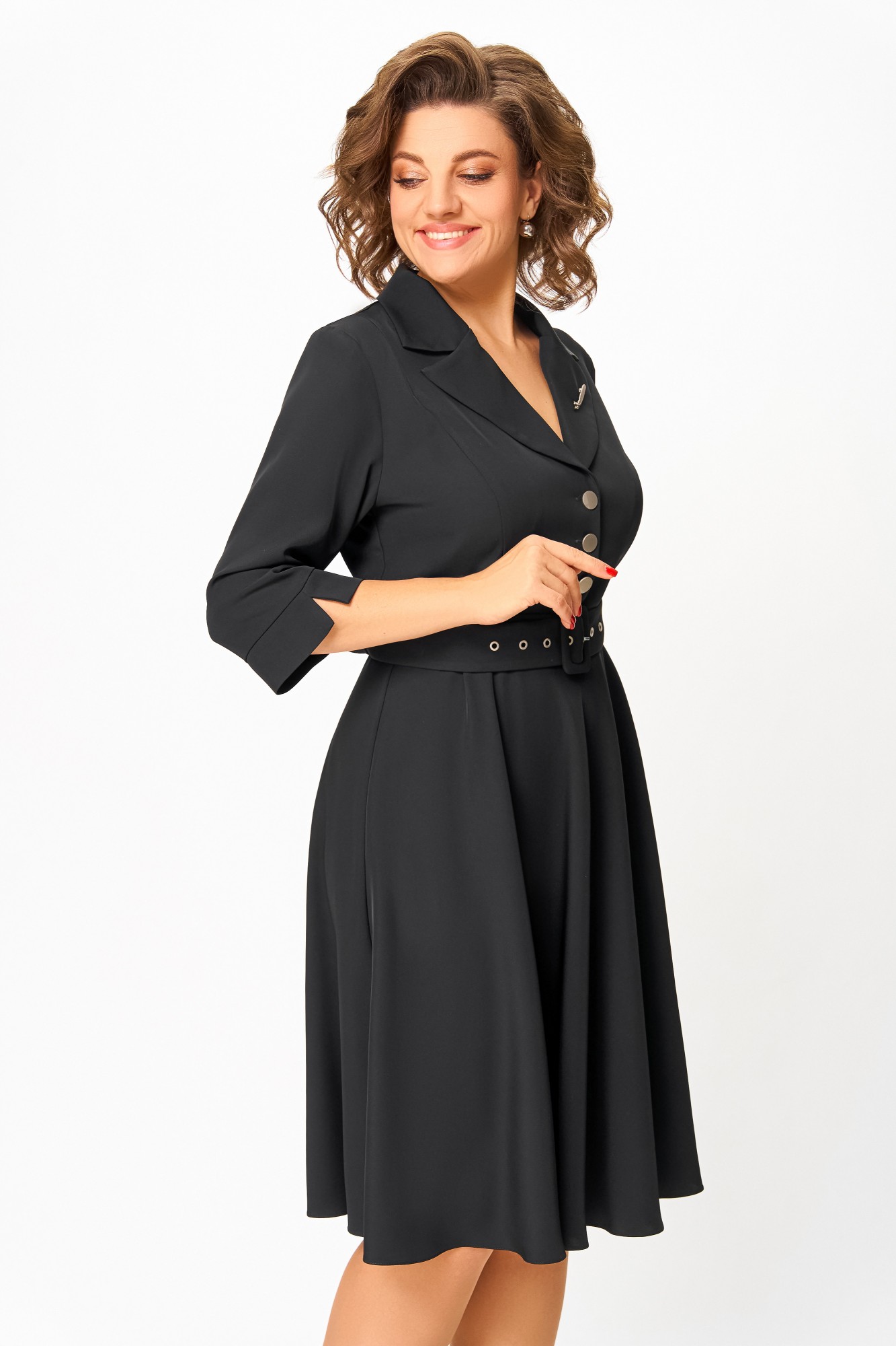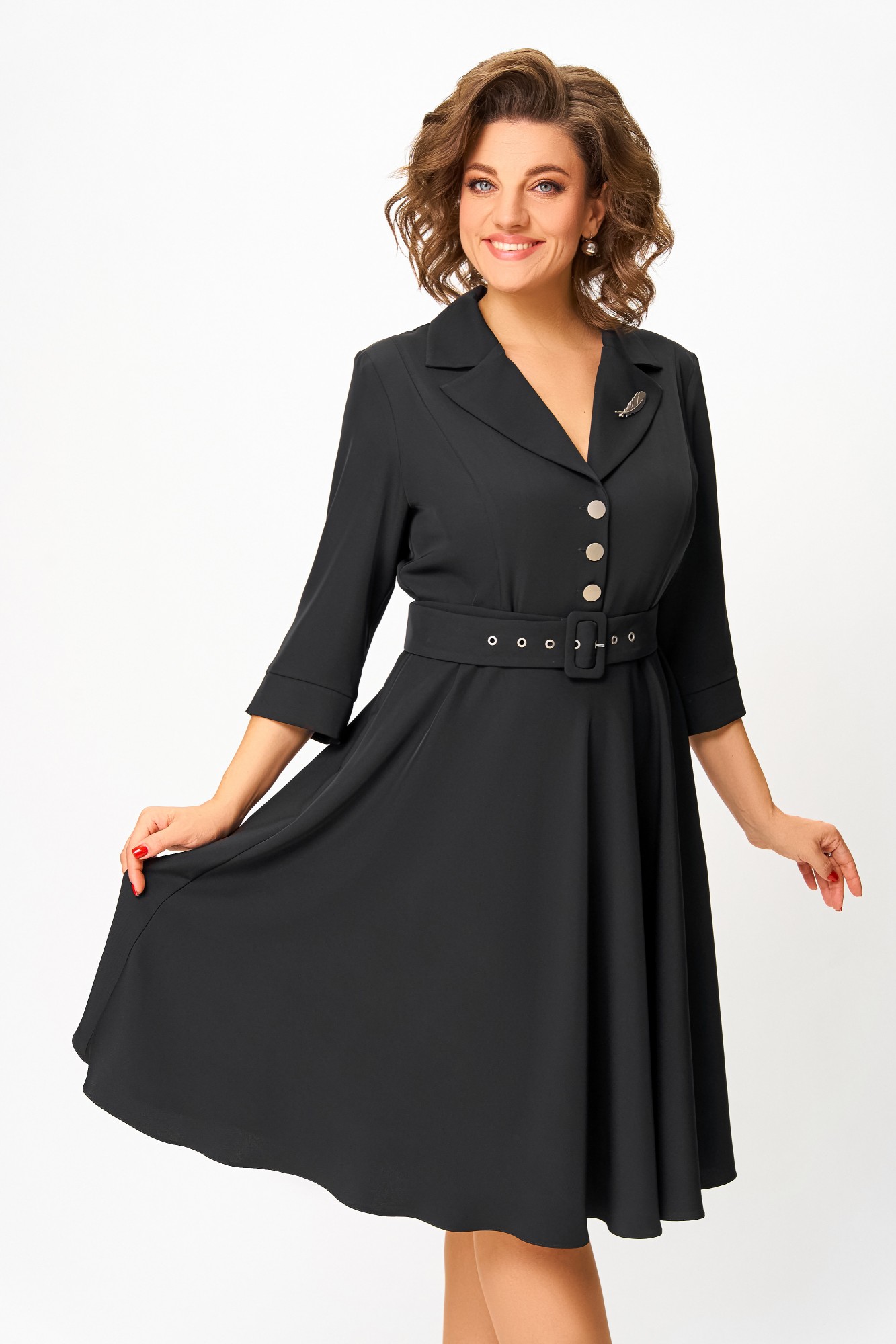 Платье из мягкой поливискозной ткани, Х-образного силуэта с полуприлегающим лифом. Платье отрезное по линии талии. Перед лифа с вертикальными рельефами и застёжкой на петли и 4 декоративные пуговицы. Горловина V-образной формы, с отложными лацканами и воротником пиджачного типа. Спинка лифа с таллиевыми выточками. Рукав втачной, длиной ¾, по низу манжет с разрезом. Застёжка в боковом шве на потайную тесьму-молнию. В комплекте пояс из основной ткани с пряжкой и блочками. В подарок декоративное украшение – брошь.