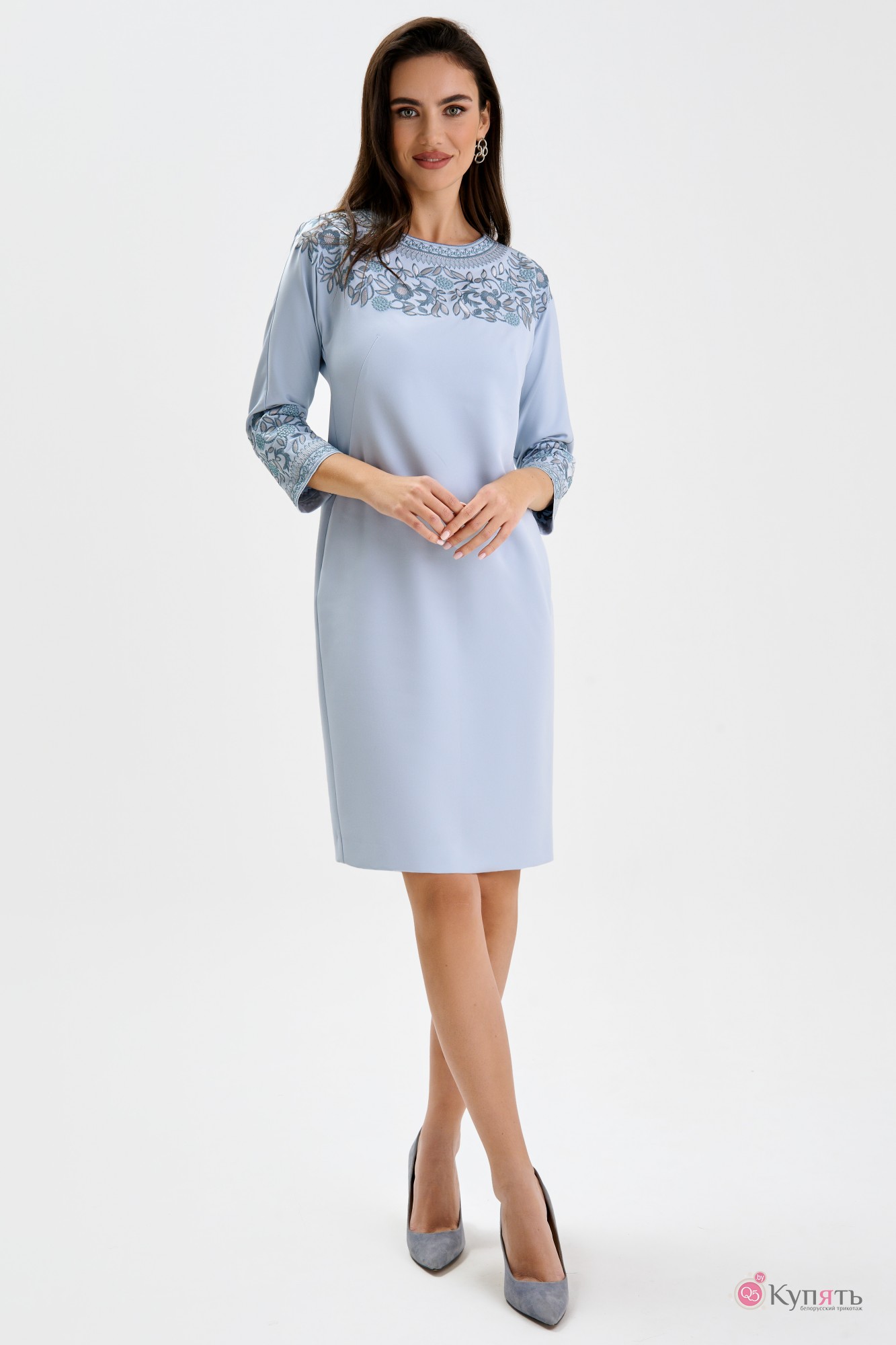Платье с вышивкой – стильный предмет гардероба, уместный на различных мероприятиях. Дизайнерская вышивка на этом платье смотрится очень ярко и помогает освежить однотонный образ и сделать его более оригинальным и выразительным. Платье женское полуприлегающего силуэта покроя «летучая мышь», длиной до колена с декоративной вышивкой. Перед с наклонной нагрудной вытачкой. Спинка со средним швом. В верхней части среднего шва застежка на навесную петлю пуговицу, в нижней части шлица. Рукава цельнокроеный, длиной 3/4. Горловина круглой формы.