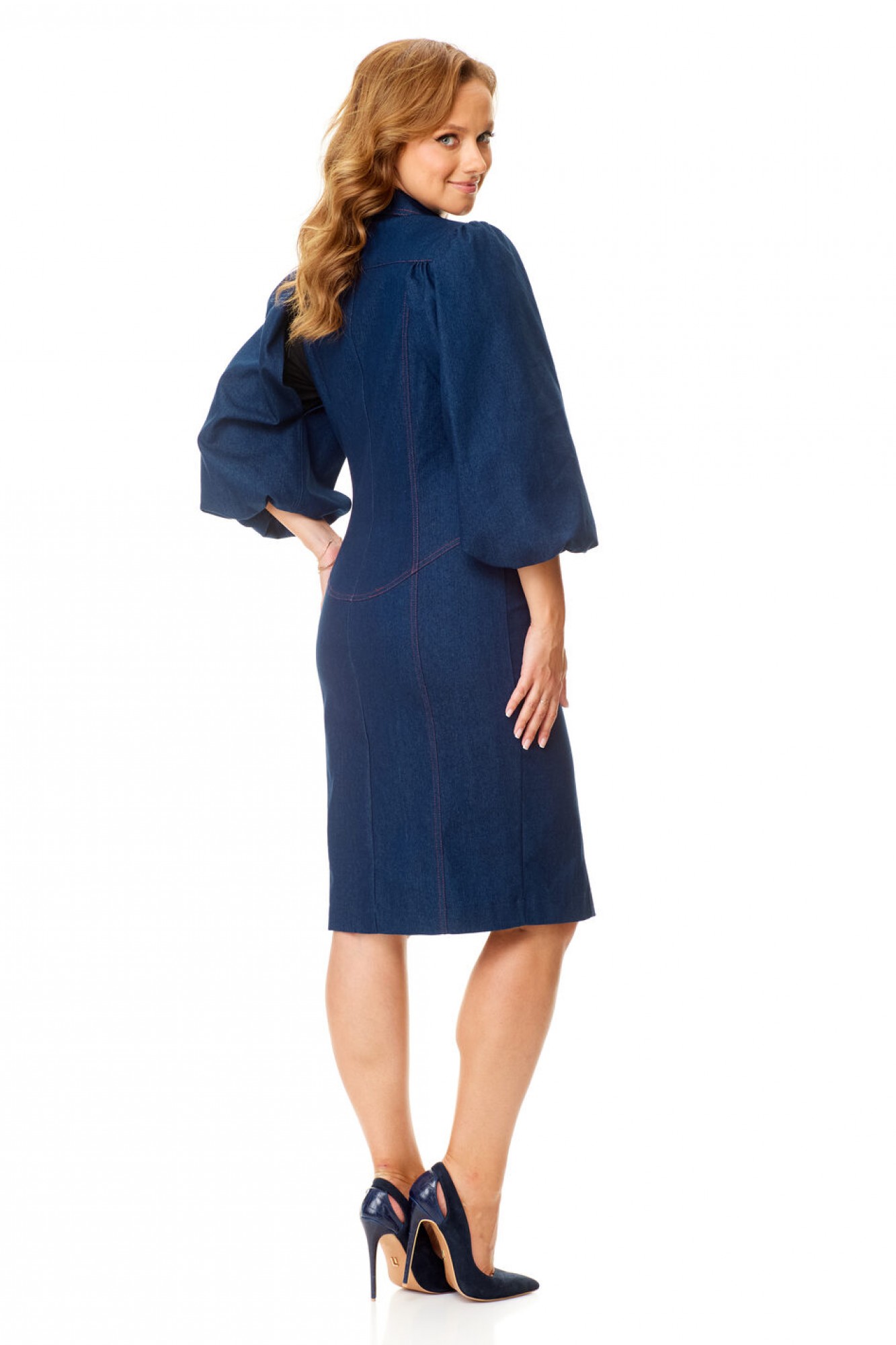 Платье женское полуприталенного силуэта зауженное к низу. Центральная бортовая застёжка с планкой на петли-пуговицы. Полочка и спинка с кокетками, рельефами, фигурным подрезом ниже линии талии и отделочными строчками. Воротник блузочный на отрезной стойке. Плечевой пояс обужен. Рукава втачные, одношовные типа баллон с разрезом в нижнем шве. Внутренние кокетки, стойка, нижний воротник и нижний рукав выполнены из хлопковой ткани.