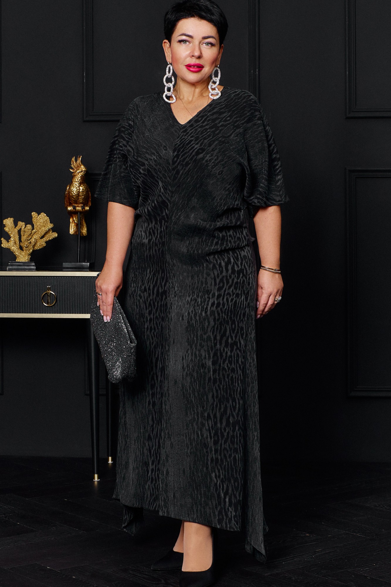 Шикарное платье из ткани «купра» с деликатным жаккардовым рисунком в модном леопардовом стиле - для взыскательных ценителей сдержанной красоты и натуральных материалов. Купра - это редкая разновидность высококачественной вискозы. Ткань по внешним характеристикам и тактильным ощущениям похожа на натуральный шелк - мягкая, приятная к телу, имеет матовый благородный блеск. Следуя минималистичному крою, нежная купра создает красивые мягкие драпировки по талии, а от бедер элегантно струится вниз, скрывая несовершенства фигуры, создает идеальный силуэт. Это изысканное платье преобразит любую женщину, подчеркнет природную красоту и изящество! Платье макси с цельнокроеными рукавами и средним швом, переходящим в разрезы и спереди, и сзади. Прилегание по талии достигается мягкими складками по боковым швам. От бедер платье расширяется книзу. Горловина V-образная.