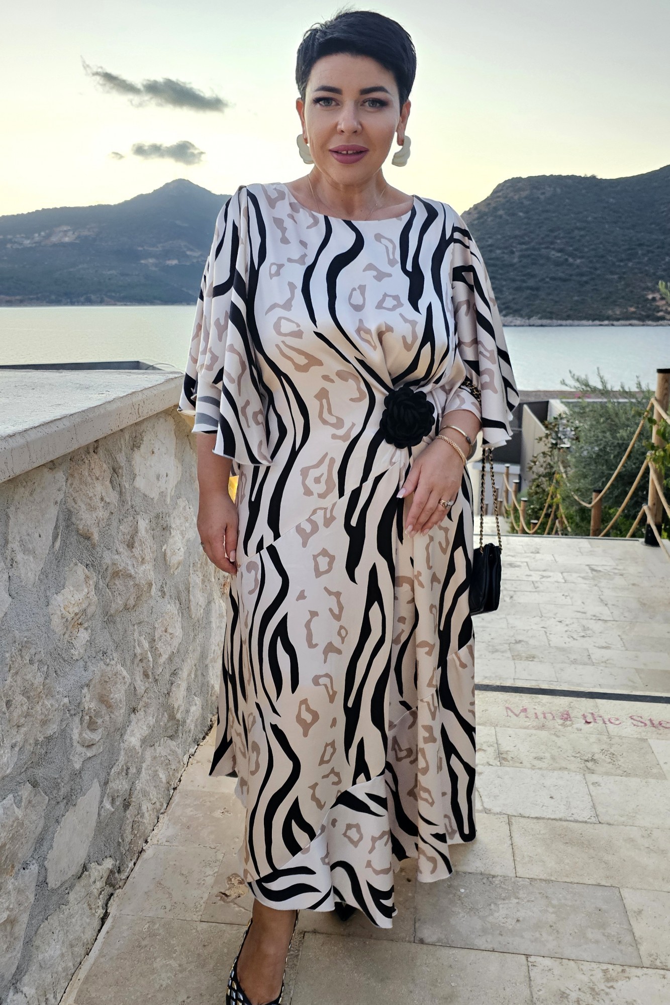 Шикарное платье с принтом в модном анималистическом стиле - для приверженцев ярких и стильных образов. Ткань из высококачественной вискозы атласного переплетения - мягкая, приятная к телу, имеет матовый благородный блеск. Следуя оригинальному крою, нежная вискоза создает красивые мягкие встречные складки по талии, а от бедер элегантно струится вниз, скрывая несовершенства фигуры, создает гармоничный образ. Графичный зебровый принт скрадывает объем и визуально вытягивает силуэт. По талии платье декорировано съемной брошью в форме цветка. Это изысканное платье преобразит любую женщину, подчеркнет природную красоту и изящество! Платье макси с втачными коническими рукавами длиной чуть ниже локтя. Прилегание по талии достигается мягкой бантовой складкой по переду. От бедер платье расширяется книзу. Горловина круглая.