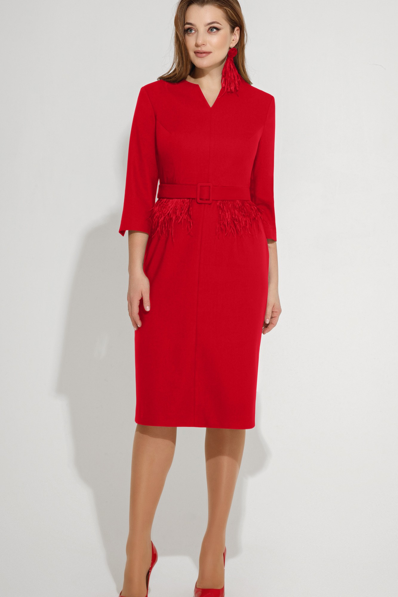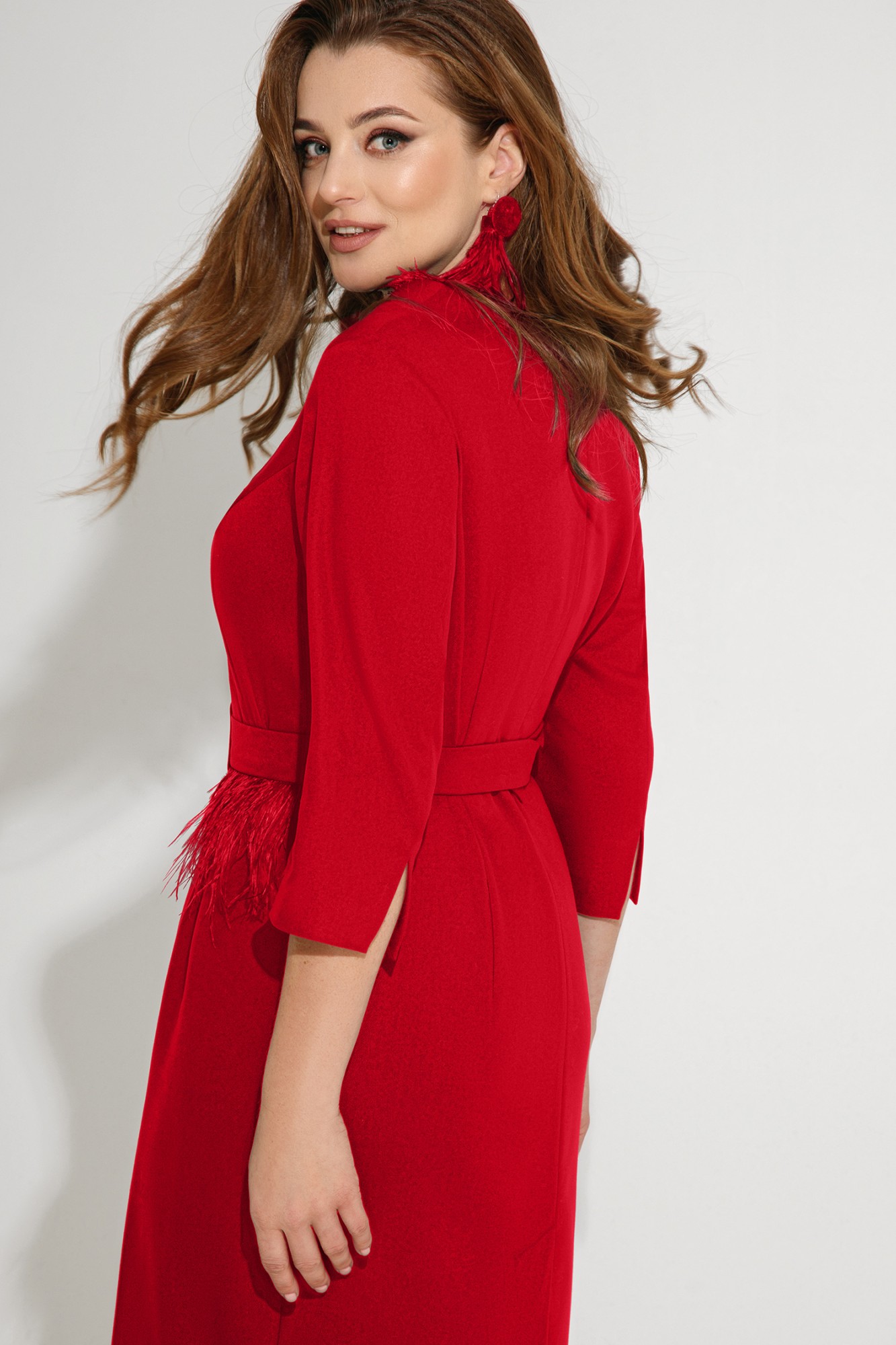 Спинка из 2х половинок, в которые втачана потайная тесьма молния. Так по спинке расположена -шлица. Для придания торжественности в комплекте с платье идет отделочный, съемный пояс-ремень с перьями. Изделие выполнено в нескольких расцветках. Это модель, которая эффектно подчеркивает фигуру и, одновременно, скрывает имеющиеся недостатки. Но причина огромной популярности не в этом, а в универсальности наряда. Платье может выглядеть строго и по-деловому, но добавив один интересный аксессуар (пояса с перышками) торжественно и нарядно.