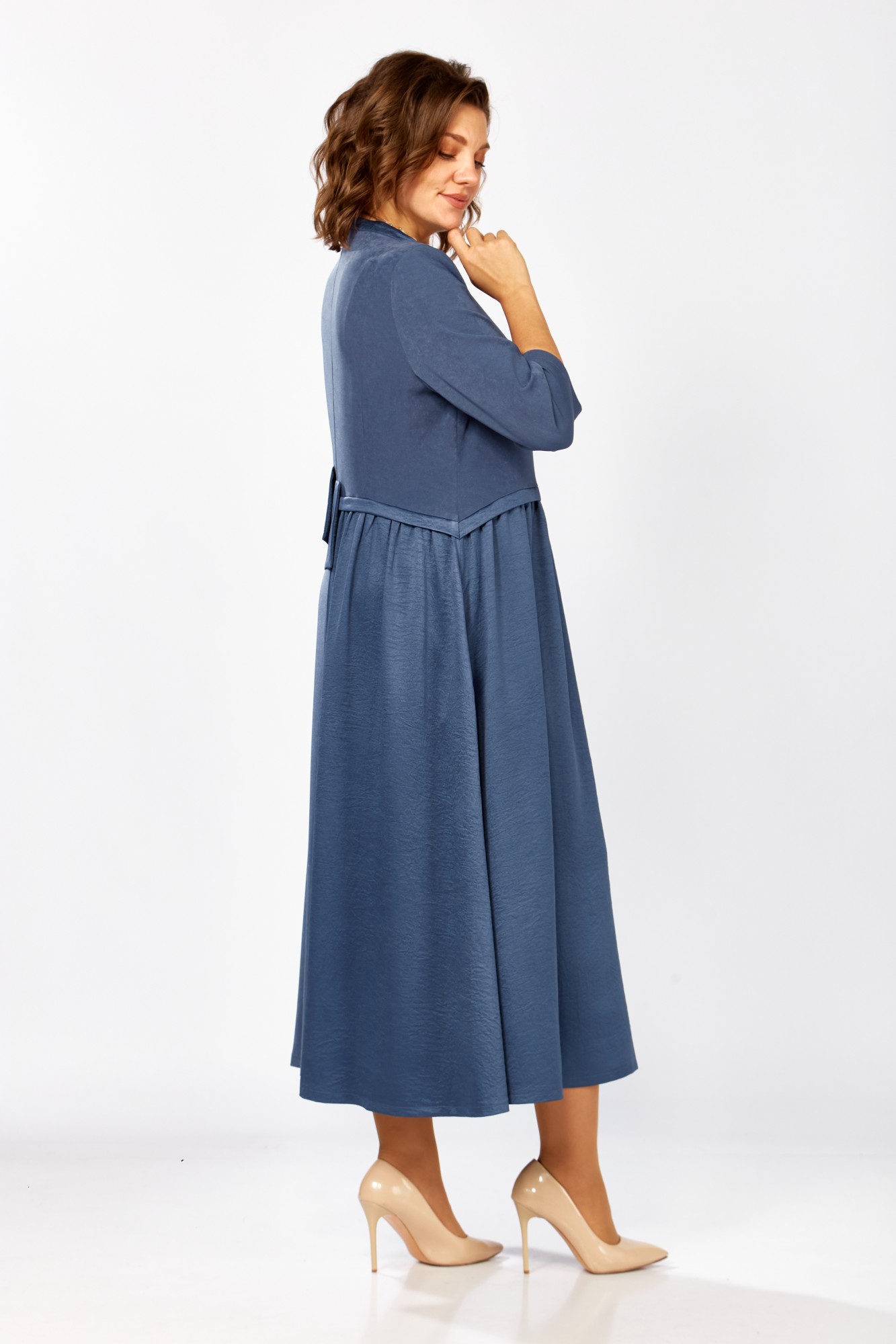 Нарядное платье изготовлено из двух видов ткани-бархатистой и блестящей текстурированной в красивом сиренево-голубом оттенке. Полуприлегащий силуэт с отрезной, слегка завышенной, талией. Нижняя часть платья А-силуэта с одной стороны по линии талии со сборкой. Рукав 3/4, втачной. Вырез горловины округлой формы со стойкой и фантазийным воротником. Особенностью этой модели, которая предает образу торжественность, являются геометрические детали настроченные на пояс спереди и сзади по спинке и символизирующие нарядный королевский бант. Платье идеально подойдет на любое торжество-юбилей, свадьбу и многие другие мероприятия.