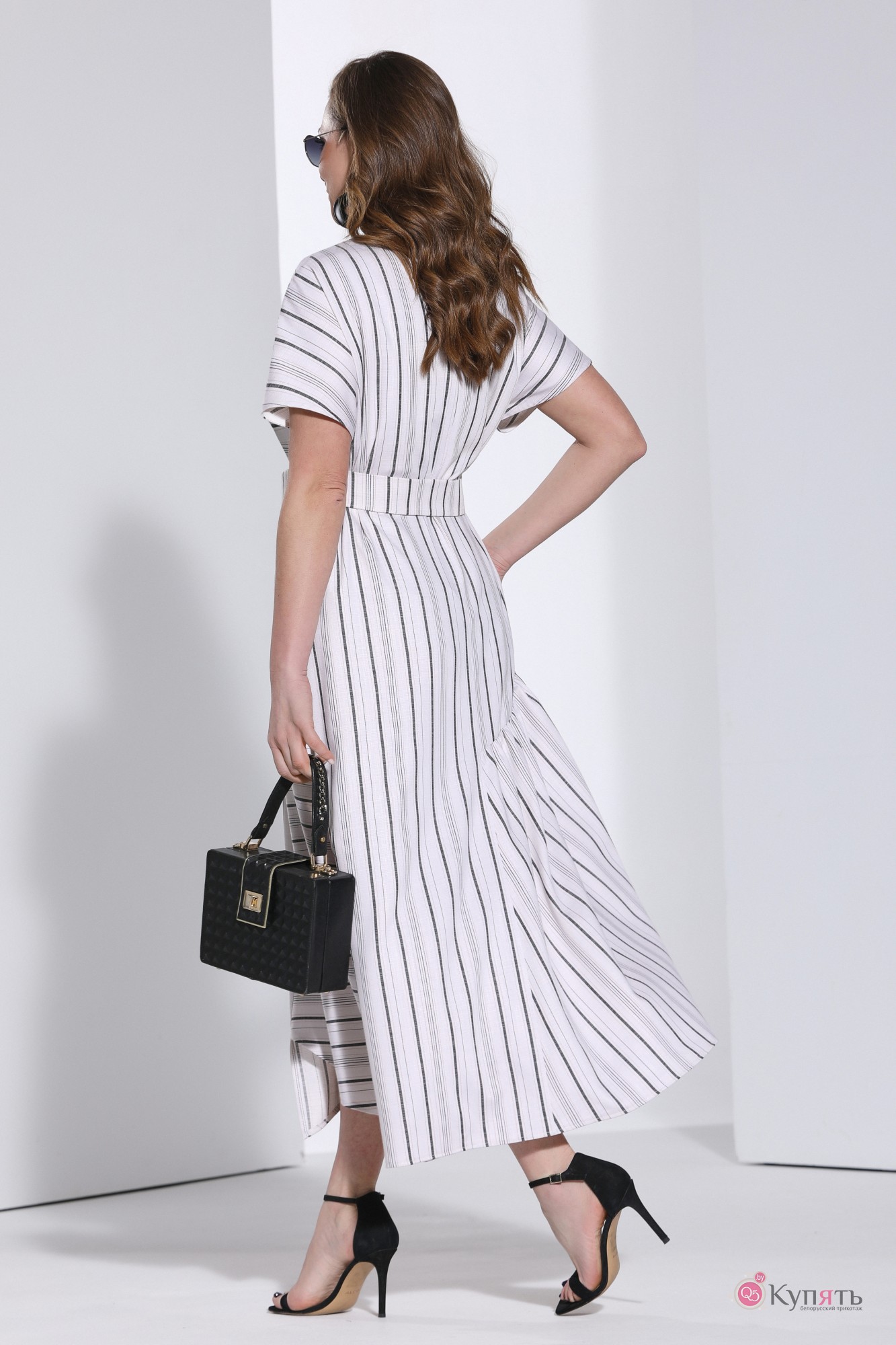 Платье с округлым вырезом горловины, спущенной линией плеча и съёмным поясом по талии. Изделие с вертикальными и горизонтальными подрезами и рельефами. Спинка со средним швом и застёжкой на петлю и пуговицу от горловины. Платье с фигурным низом и с одним карманом в боковом шве.
