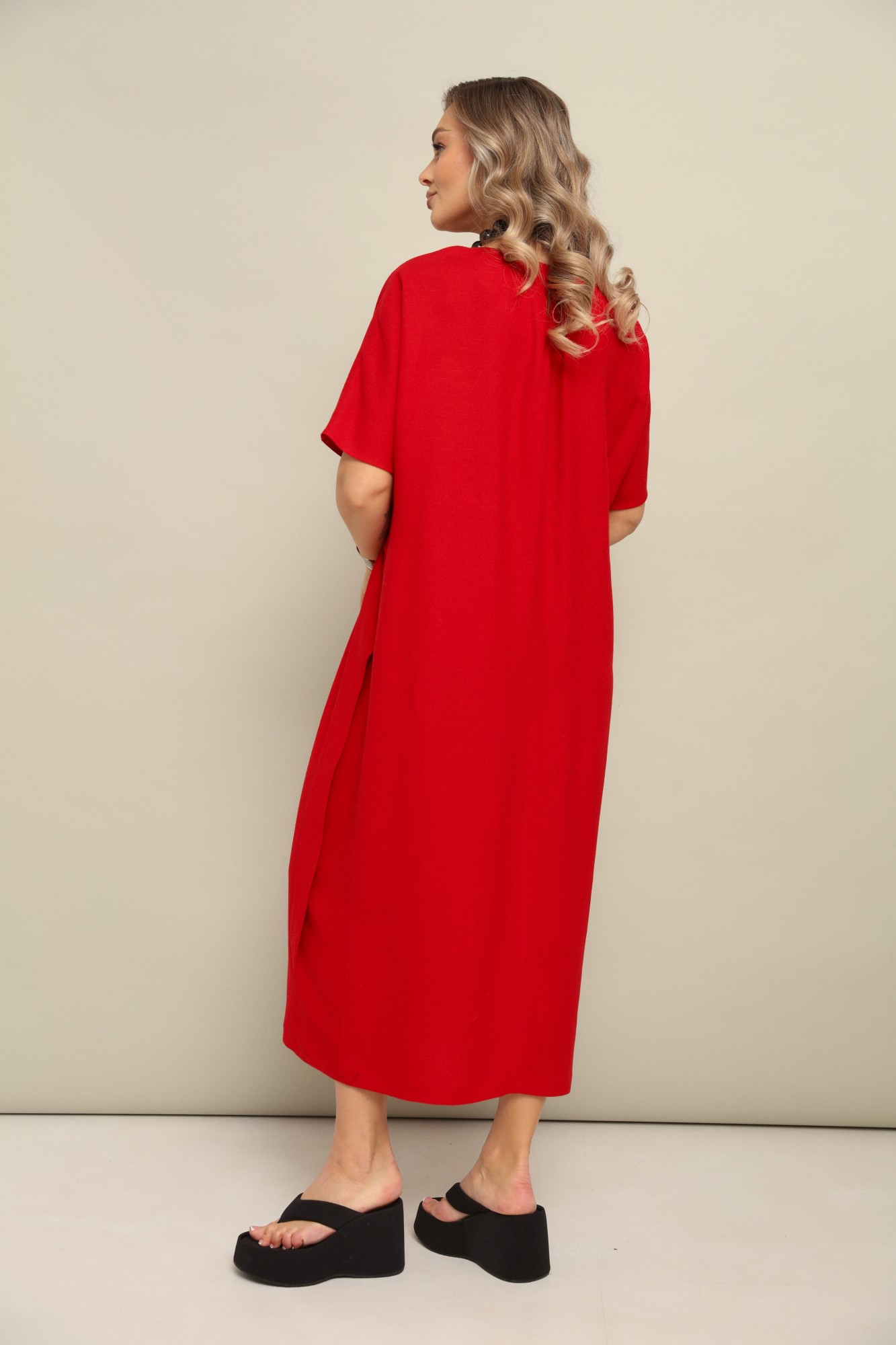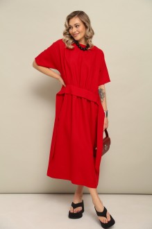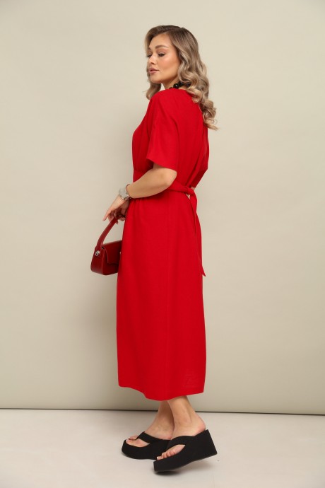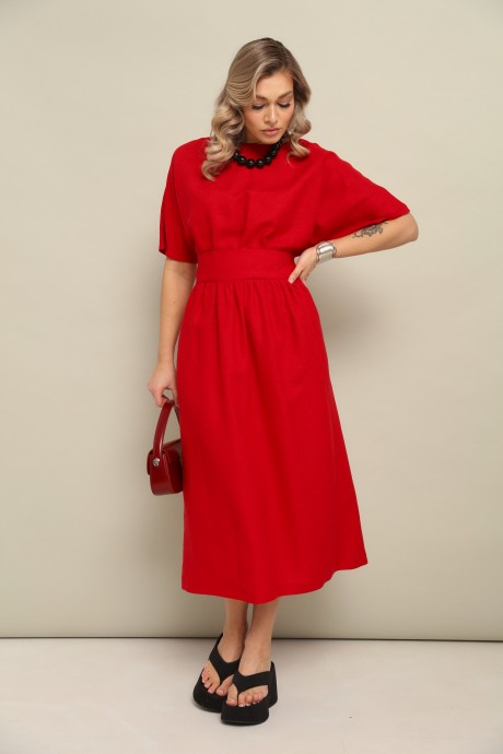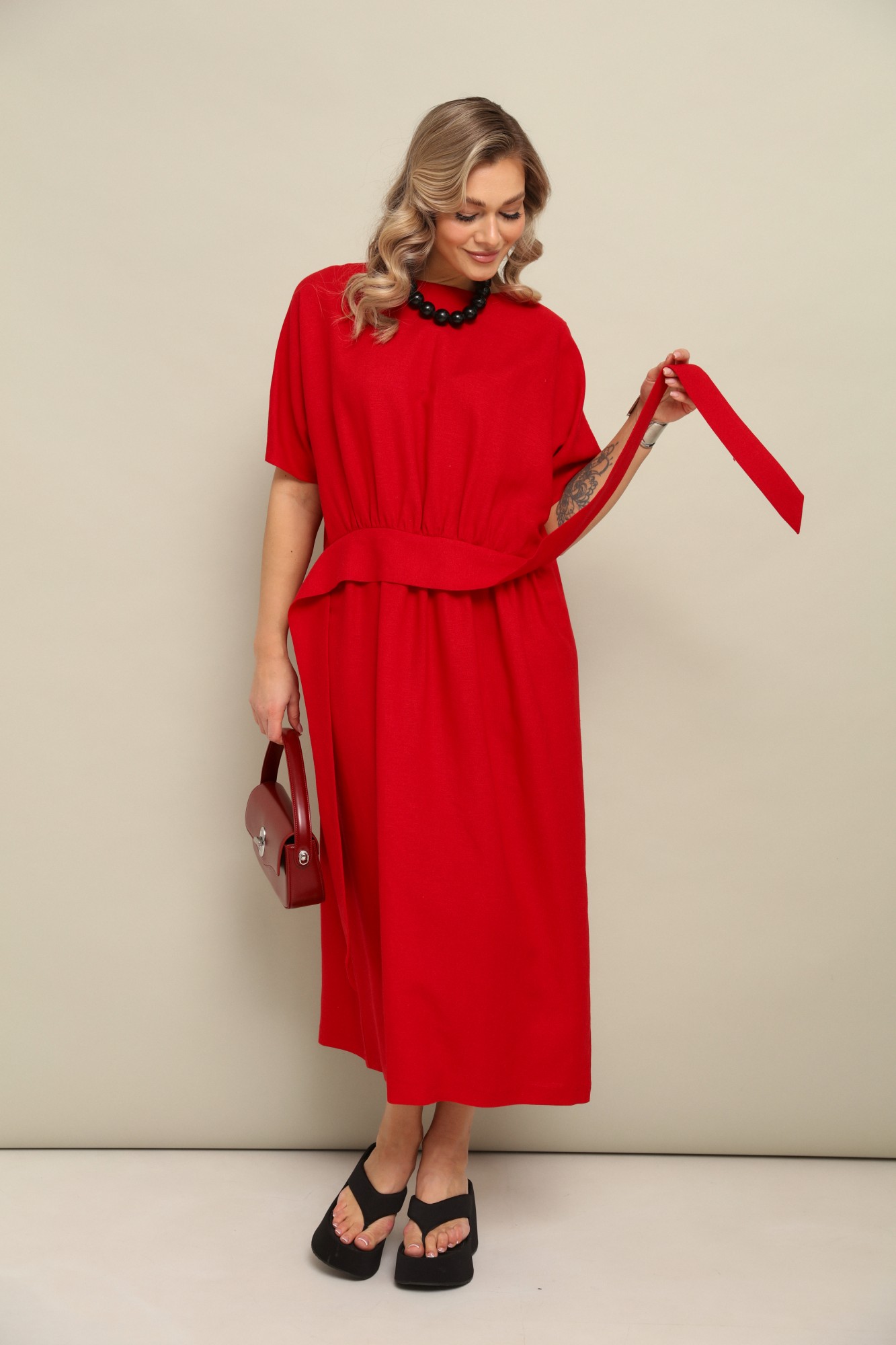 Платье длины миди со свободной юбкой и пришивным по переду поясом. Рукав цельнокроеный. По спинке встречные складки и застёжка по линии горловины на пуговицу.