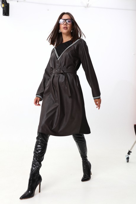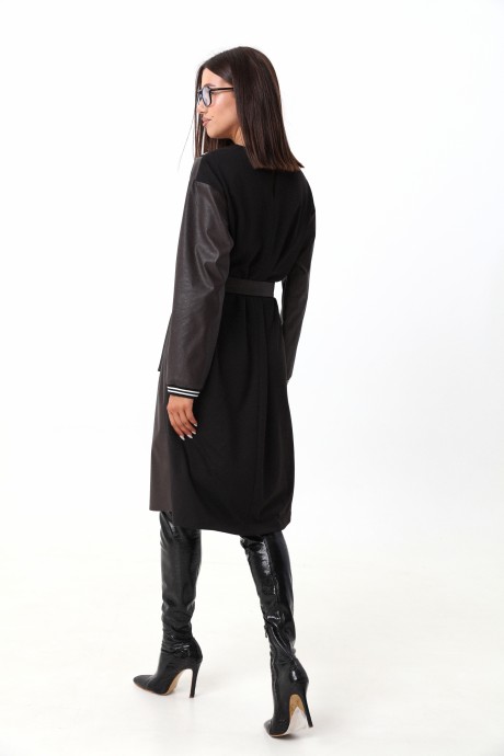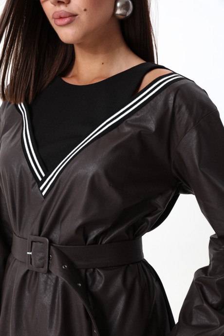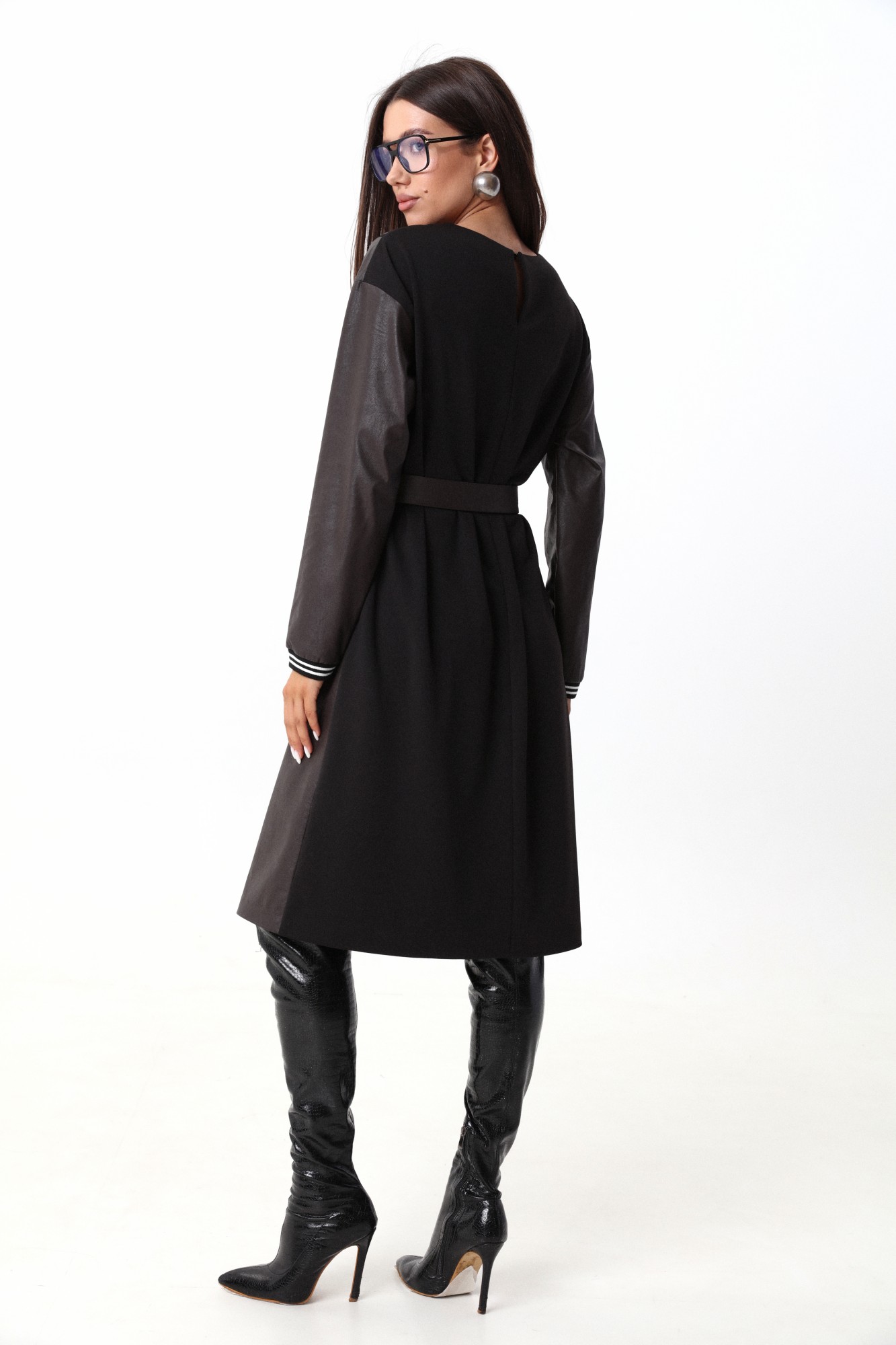 Платье свободного силуэта длины ниже колена с длинными втачными рукавами, выполнено из двух видов ткани. По переду платья имитация топа и открытыми плечами. Отделка горловины платья и манжеты выполнены из довязов в контрастном цвете. Платье дополнено поясом.