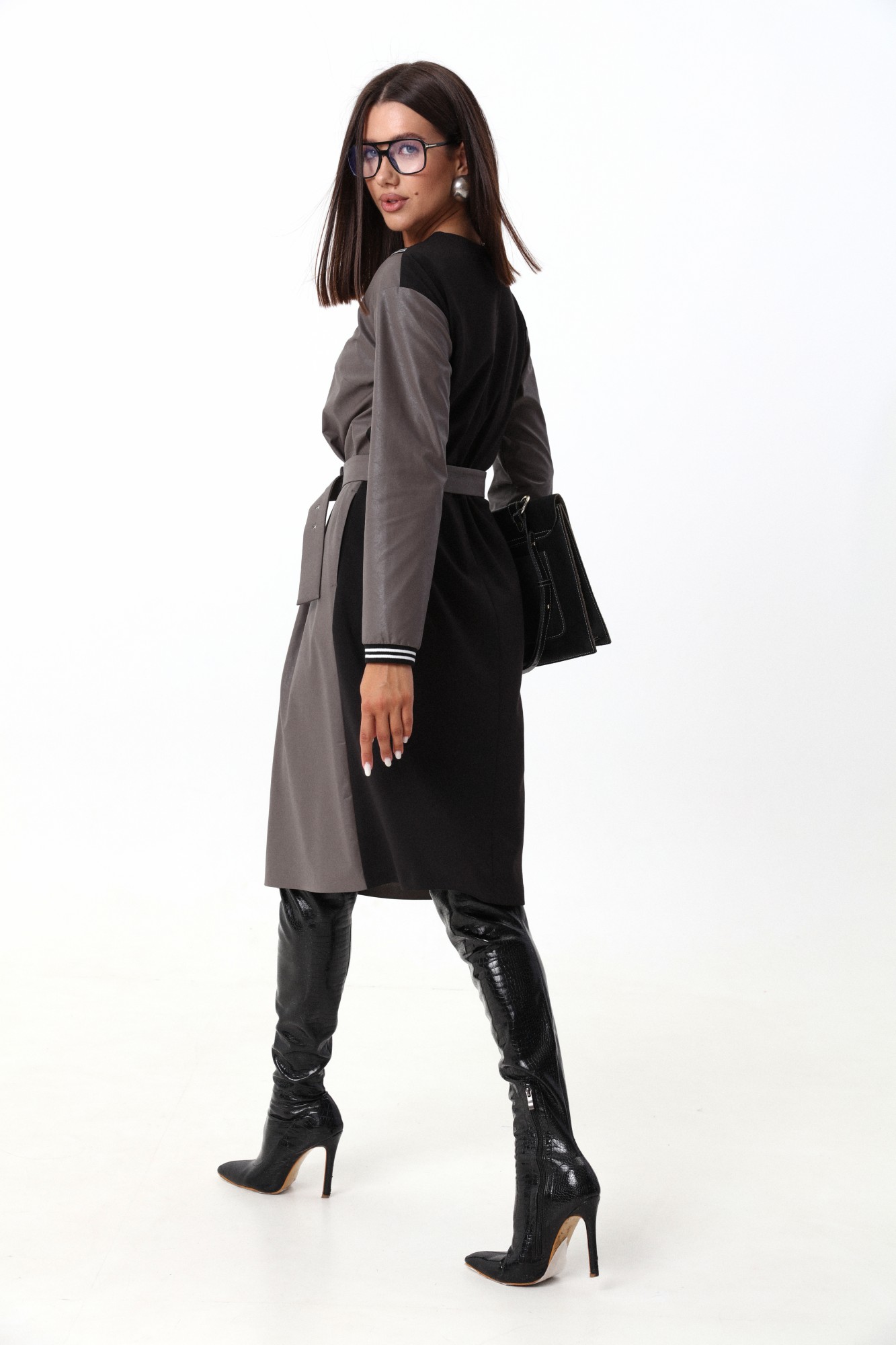Платье свободного силуэта длины ниже колена с длинными втачными рукавами, выполнено из двух видов ткани. По переду платья имитация топа и открытыми плечами. Отделка горловины платья и манжеты выполнены из довязов в контрастном цвете. Платье дополнено поясом.