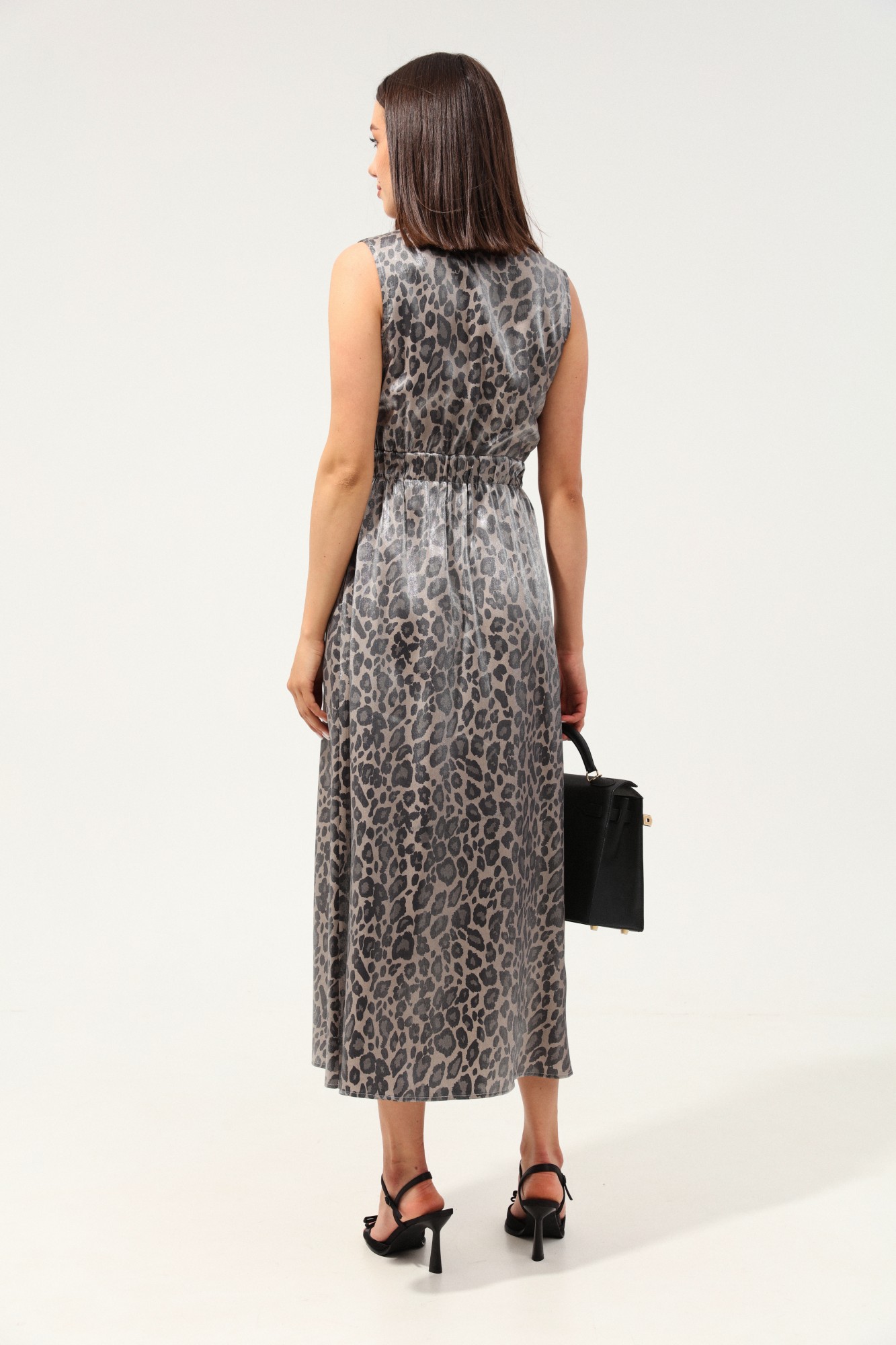 Платье "макси" без рукавов с застёжкой на запах на функциональные петли и пуговицы. Вырез декольте V-образный. По линии талии спинки эластичная вставлена эластичная резинка. При надобности, платье легко слегка расширить или заузить по талии, переставив пуговицы.