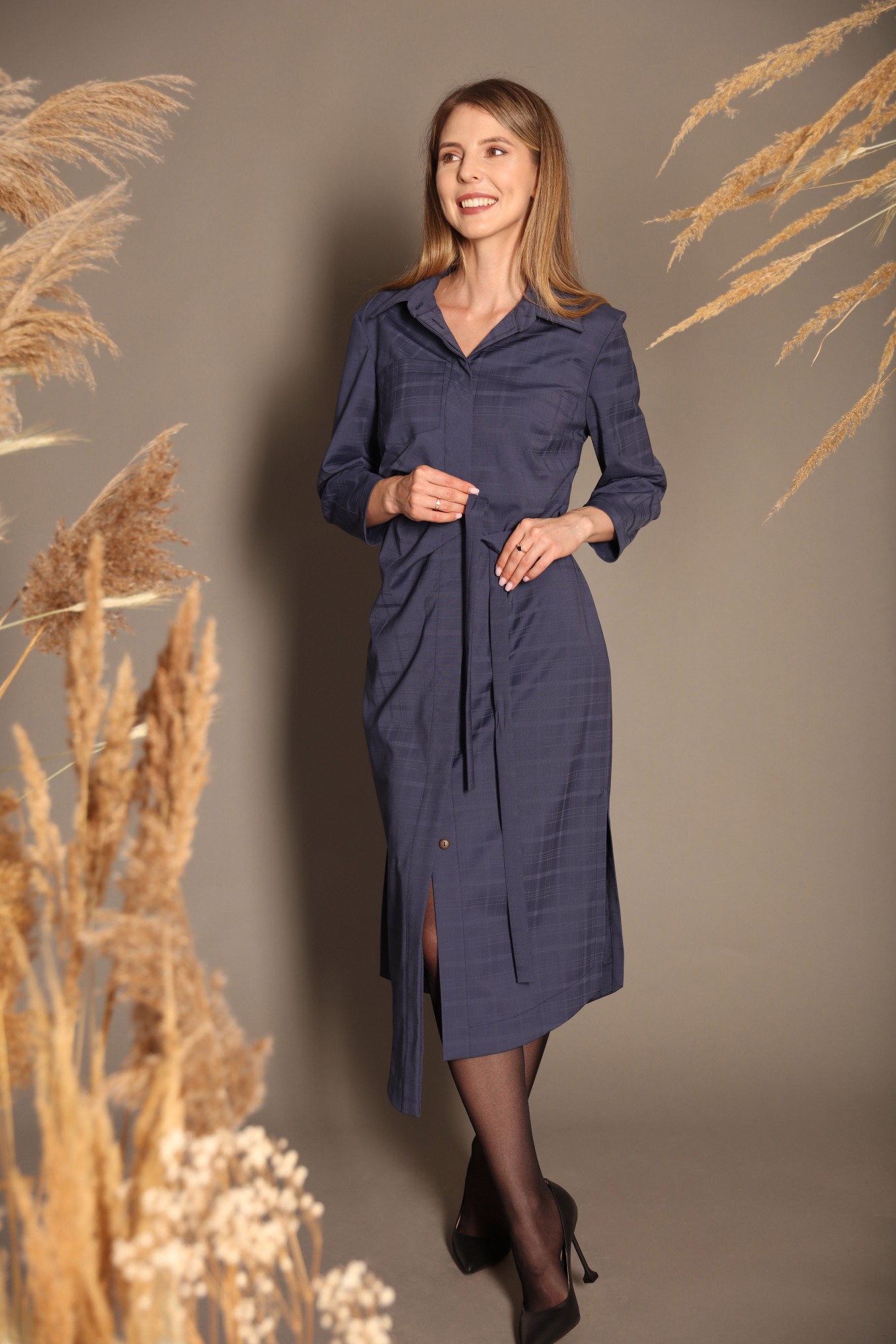 Платье выполнено из тонкой шелковистой полушерсти , с принтом «слепая клетка» и потайной застёжкой на пуговицы, воротник рубашечного типа, по переду нагрудный карман. По бокам стильные разрезы.Платье умеренного объема прямого силуэта. Полочки изделия асимметричные. На правой полочке на уровне талии три застроченные складки. Левая полочка прямого кроя. В боковых швах обработаны разрезы. У платья притачной пояс, состоящий из двух частей. Для пояса в правом боковом шве есть отверстие, а на левом боковом шве притачная шлевка. Линия плеча естественная. Рукав втачной, укороченный, по низу рукава две вытачки. Нижний срез рукава обработан обтачкой. Низ полочек и спинки изделия фигурный, асиметричный, обработан притачными обтачками. Правая полочка длинее левой. Длина изделия ниже линии колен. Верх платья на обтачке-подкладке.