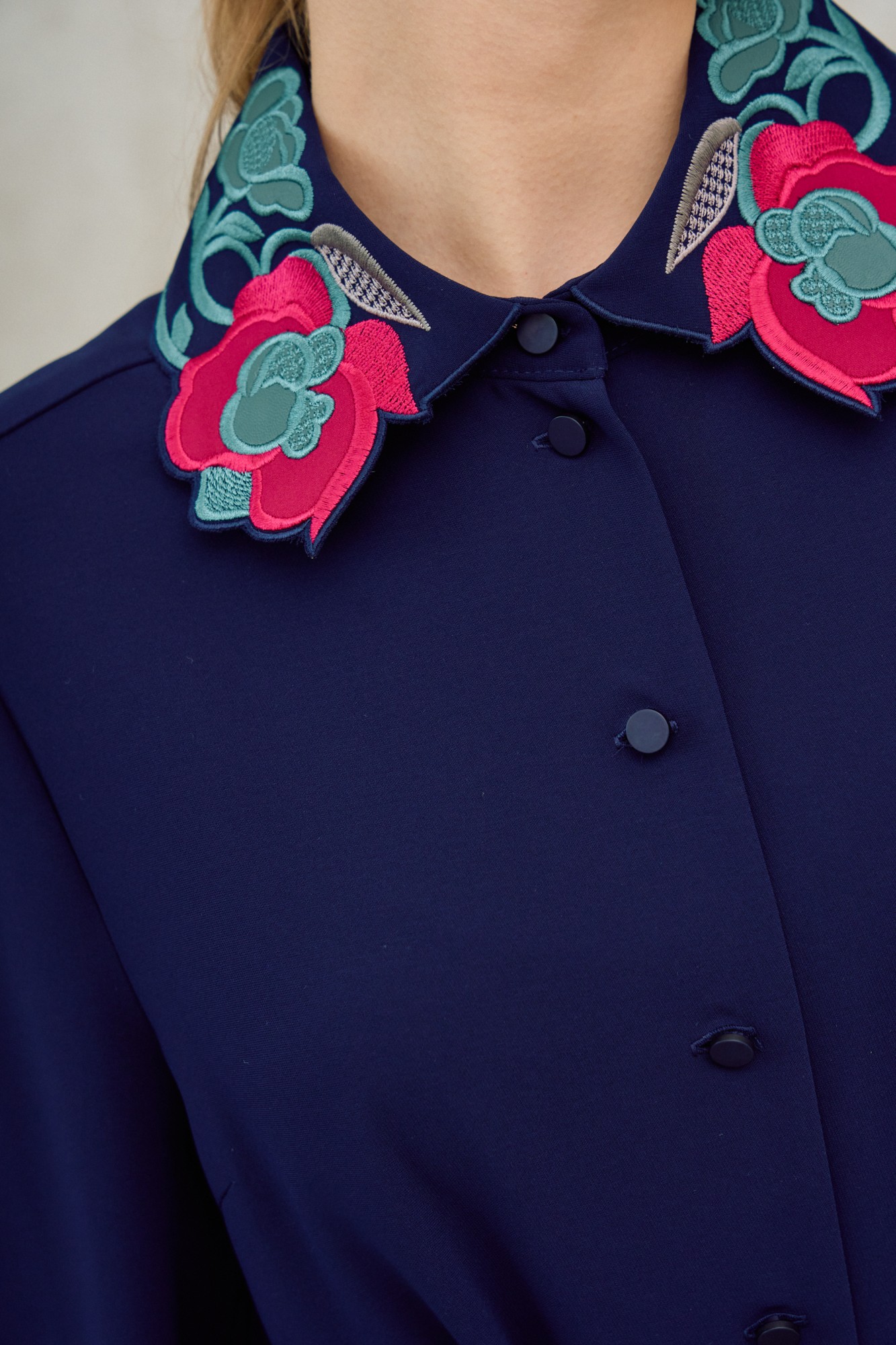 Платье-рубашка прямого силуэта с центральной застежкой на петли и пуговицы. Рукав длинный втачной с отрезной манжетой и застежкой на петли и пуговицы. Воротник рубашечного кроя, декорирован вышивкой. По спинке отрезная кокетка и