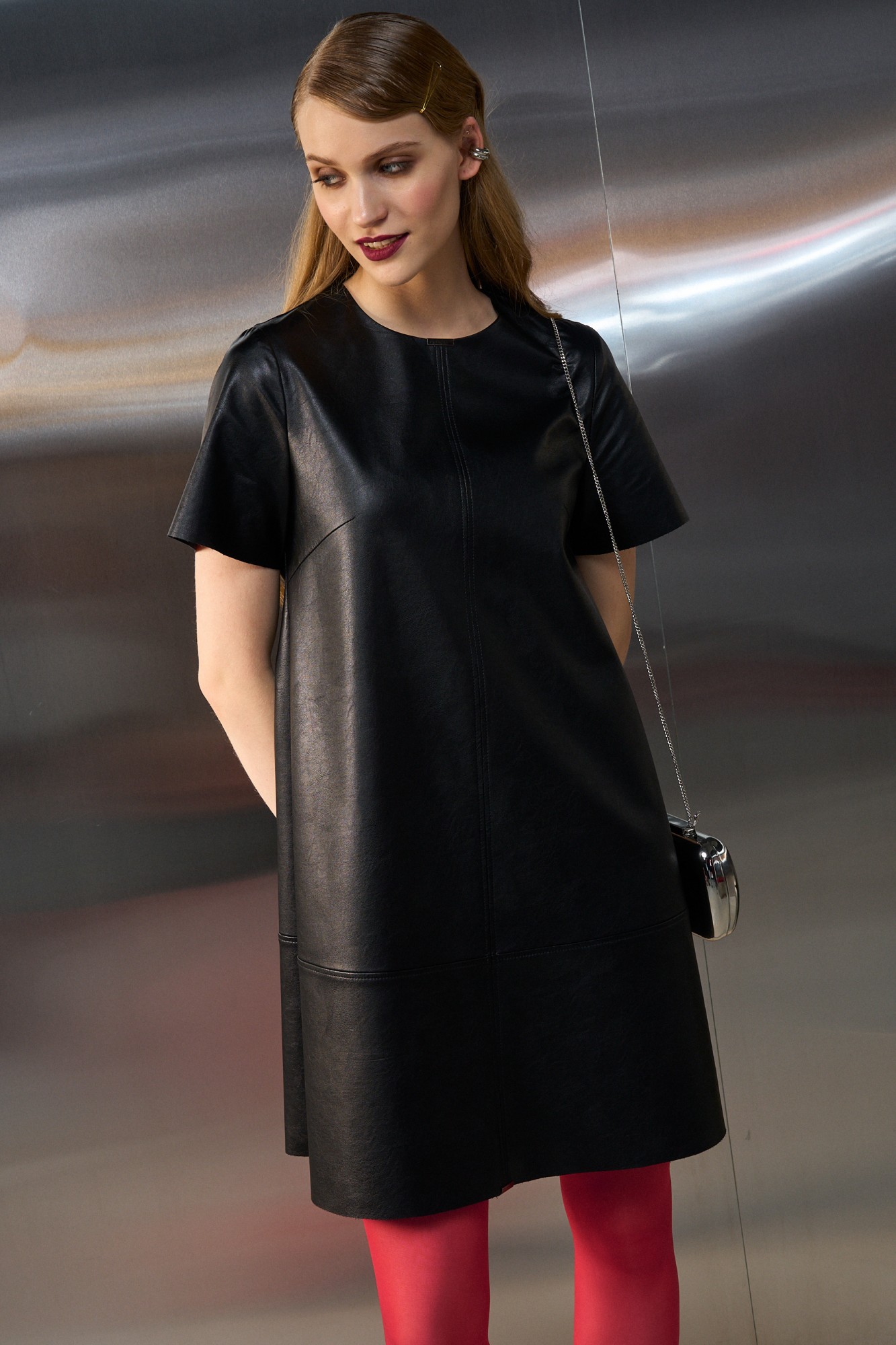 Платье А силуэта выполнено из экокожи, на подкладке. Рукав втачной короткий, округлый вырез горловины. По переду центральный шов и нагрудные вытачки. Застежка на потайную молнию в среднем шве спинки. Центральные, боковые швы и горловина декорированы металлическими зажимами.