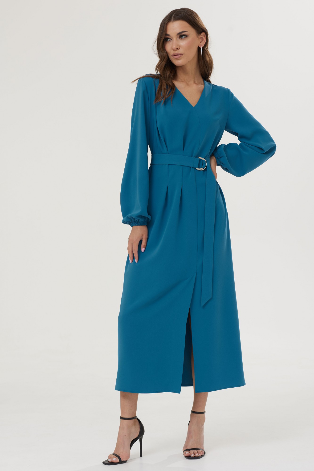 Стильное платье прямого силуэта из струящейся ткани. Горловина с V-образным вырезом. Рукав втачной, длинный. Низ рукава на резинке. Перед с нагрудной вытачкой и ассиметричной деталью со складками от плеча. В области талии складки застрочены. Шов рельефа переда заканчивается шлицей. Карманы в боковых швах. В комплект входит съемный пояс. Обращаем ваше внимание, что фурнитура может незначительно отличаться от фото.