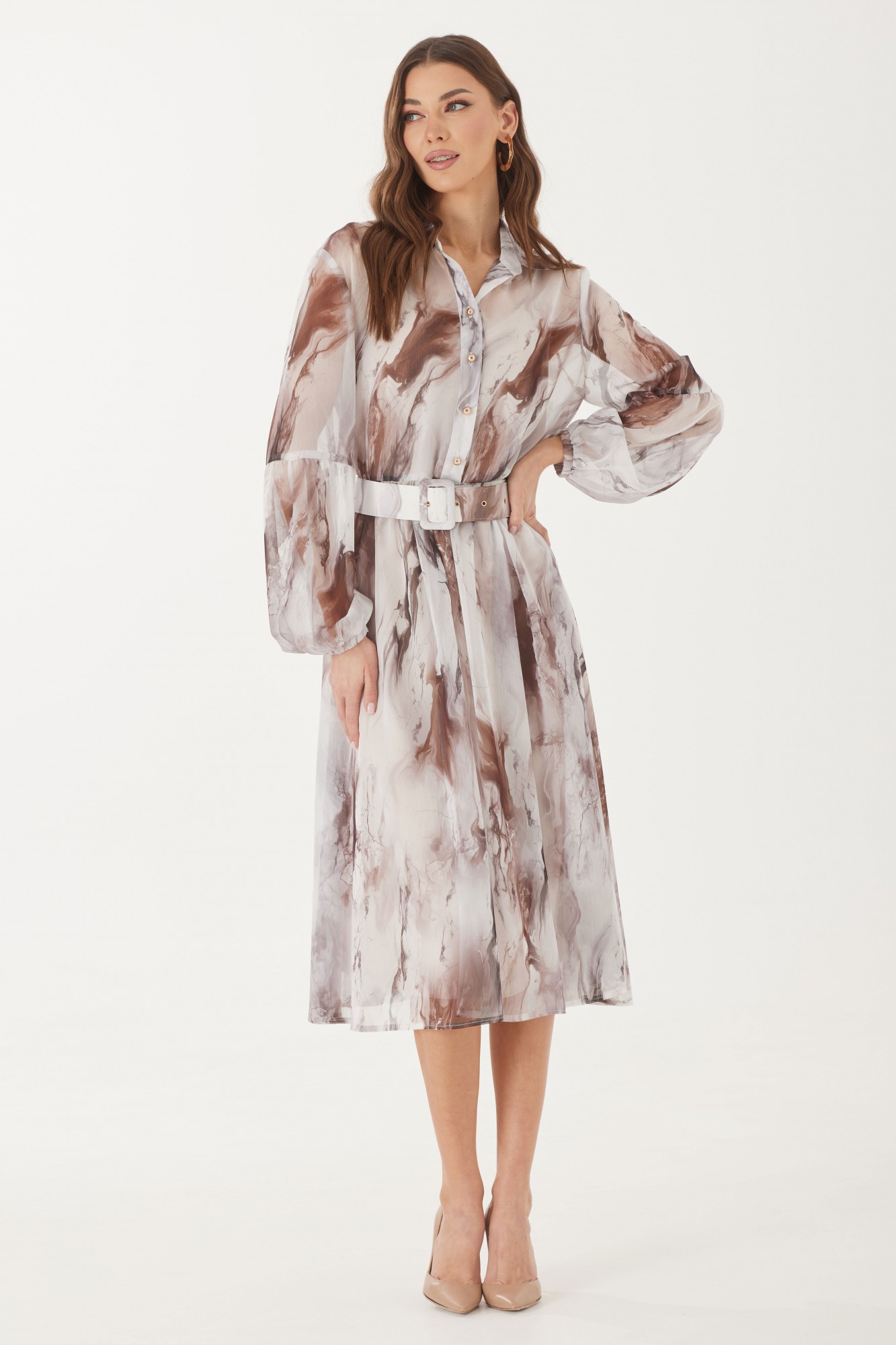 Платье прямого силуэта из шифоновой ткани. Воротник на стойке рубашечного типа с застежкой по центру на петли и пуговицы. Рукав втачной, чуть выше локтя подрез со сборкой. По низу рукав на резинке. Платье отрезное на линии талии, со сборкой по низу. В комплект входит нижнее платье на бретельках из штапеля. В комплект входит съемный пояс. Обращаем ваше внимание, что фурнитура может незначительно отличаться от фото.