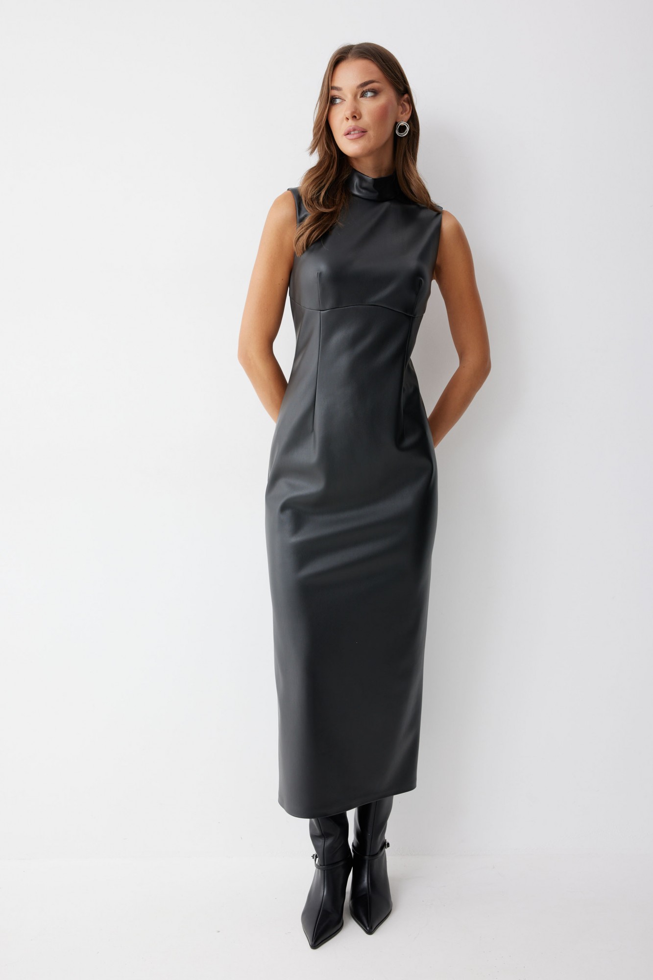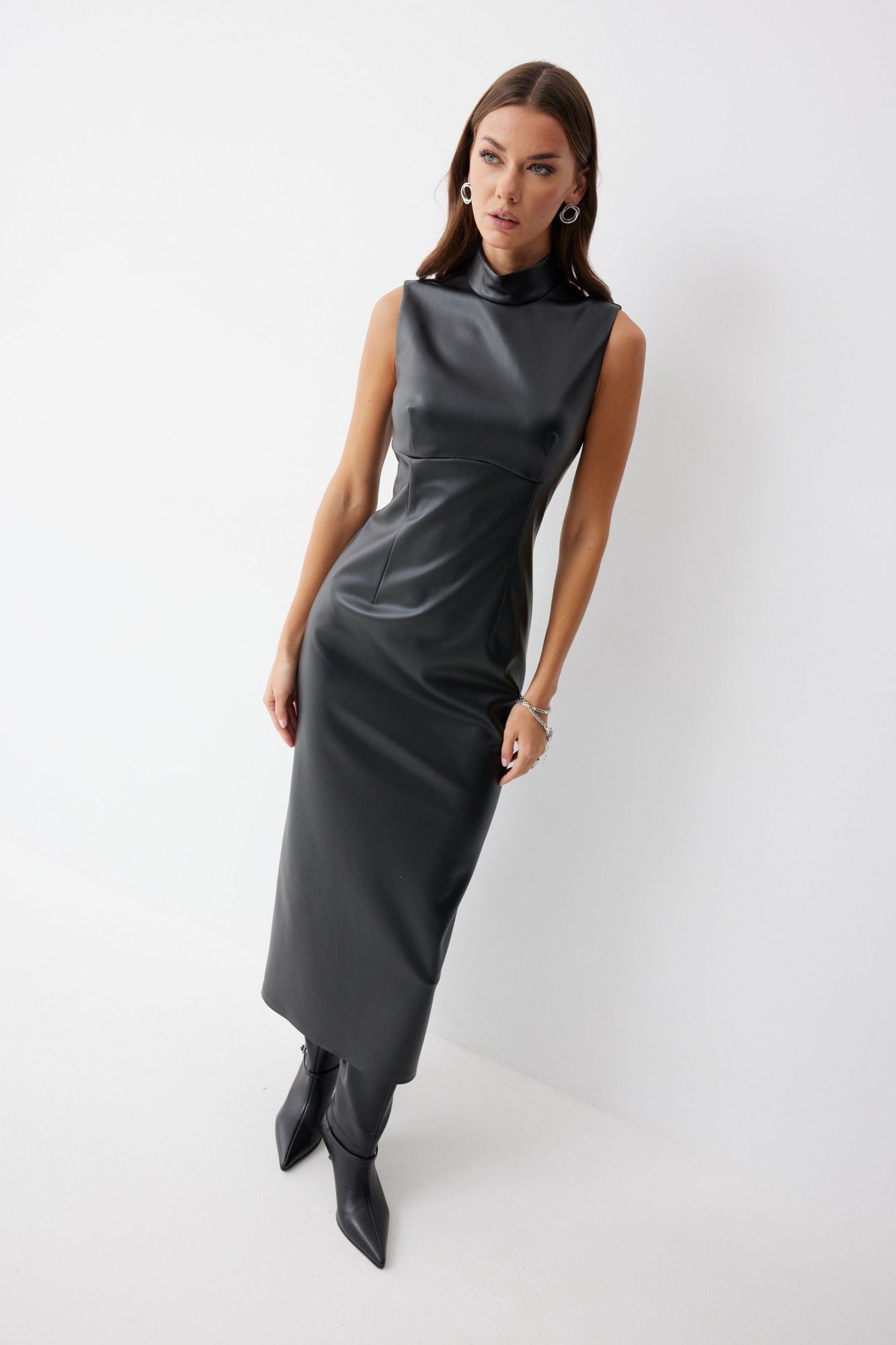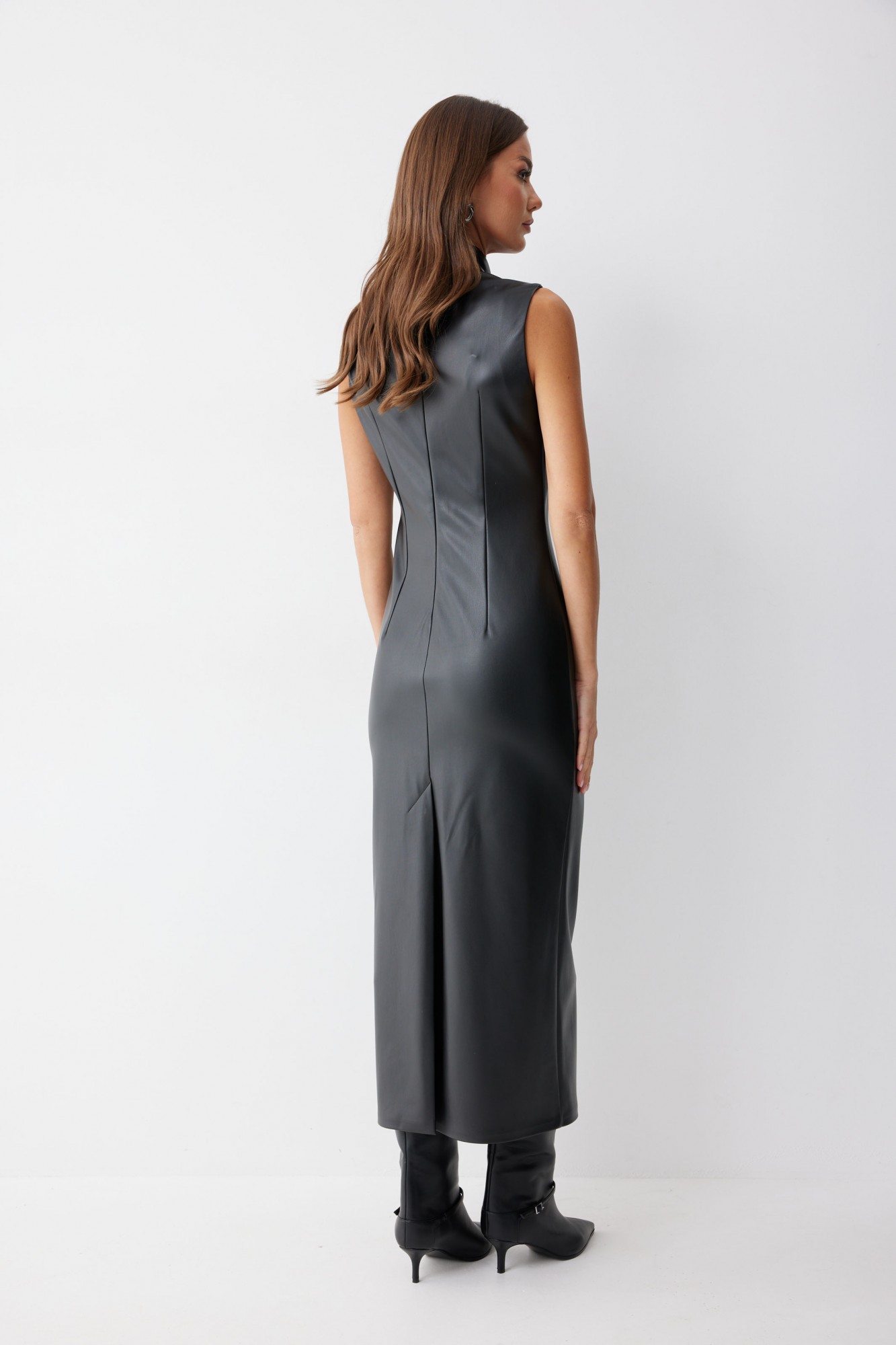 Платье прилегающего силуэта из экокожи. Горловина-стойка. Спереди под грудью подрез, нагрудные и таллиевые вытачки. На спинке в центральном шве потайная молния, по низу шлица. На спинке платья таллиевые вытачки.