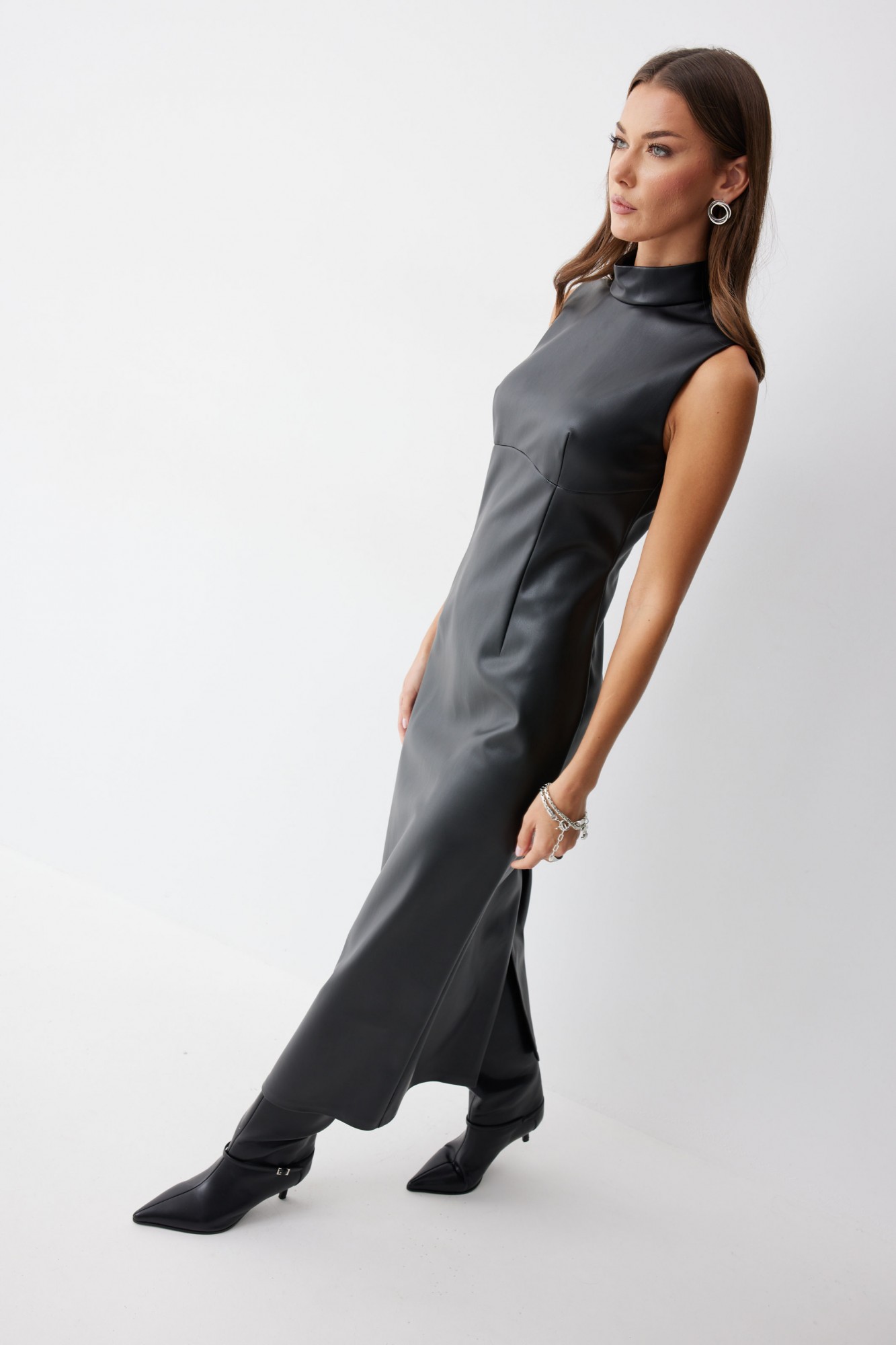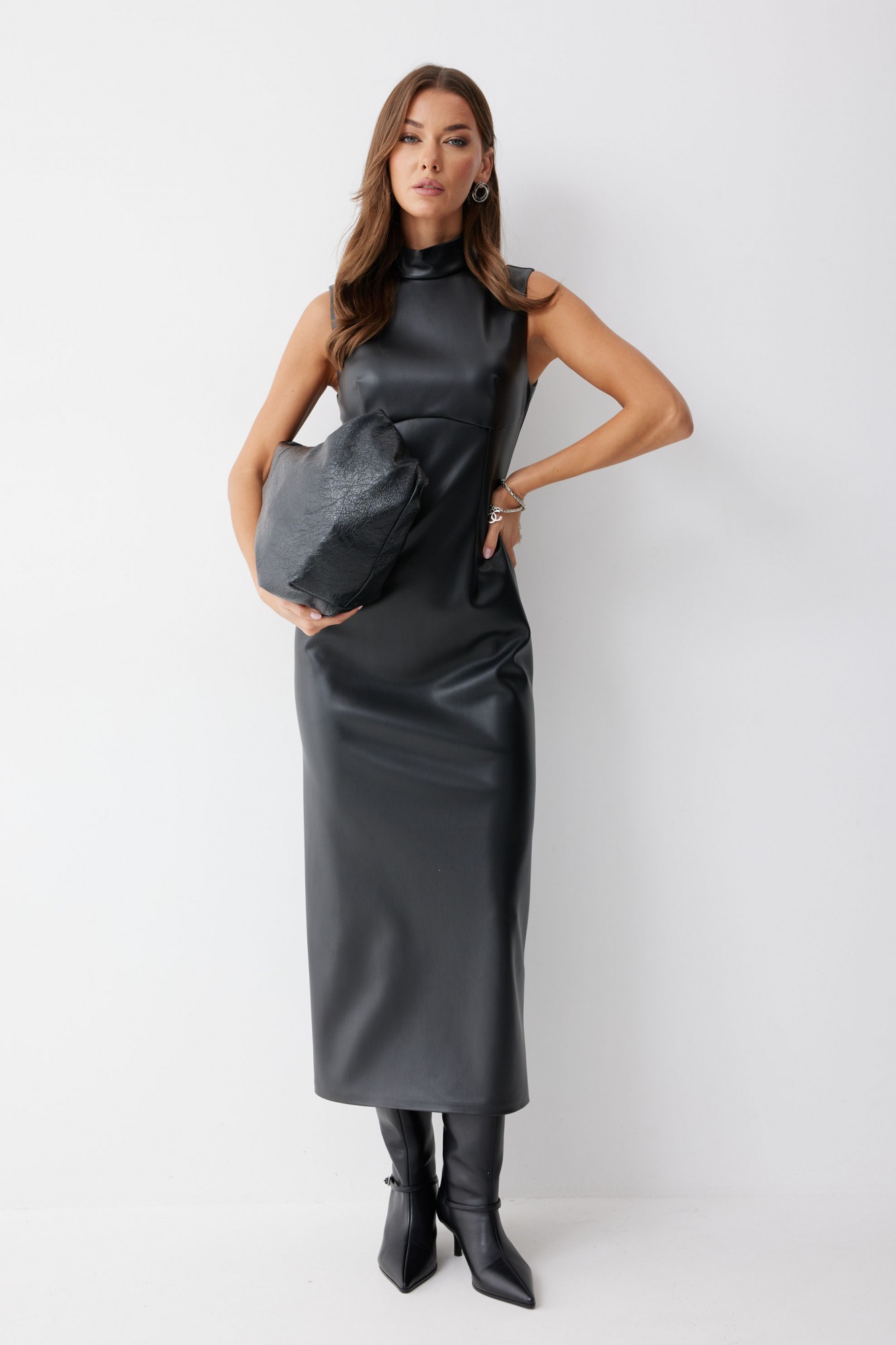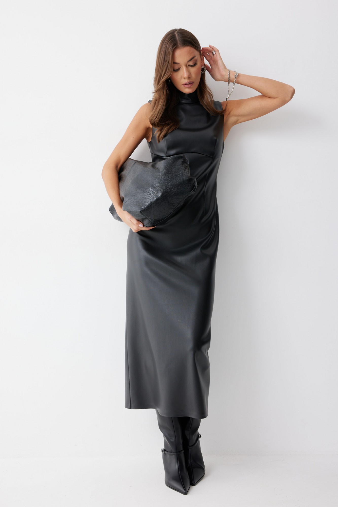 Платье прилегающего силуэта из экокожи. Горловина-стойка. Спереди под грудью подрез, нагрудные и таллиевые вытачки. На спинке в центральном шве потайная молния, по низу шлица. На спинке платья таллиевые вытачки.